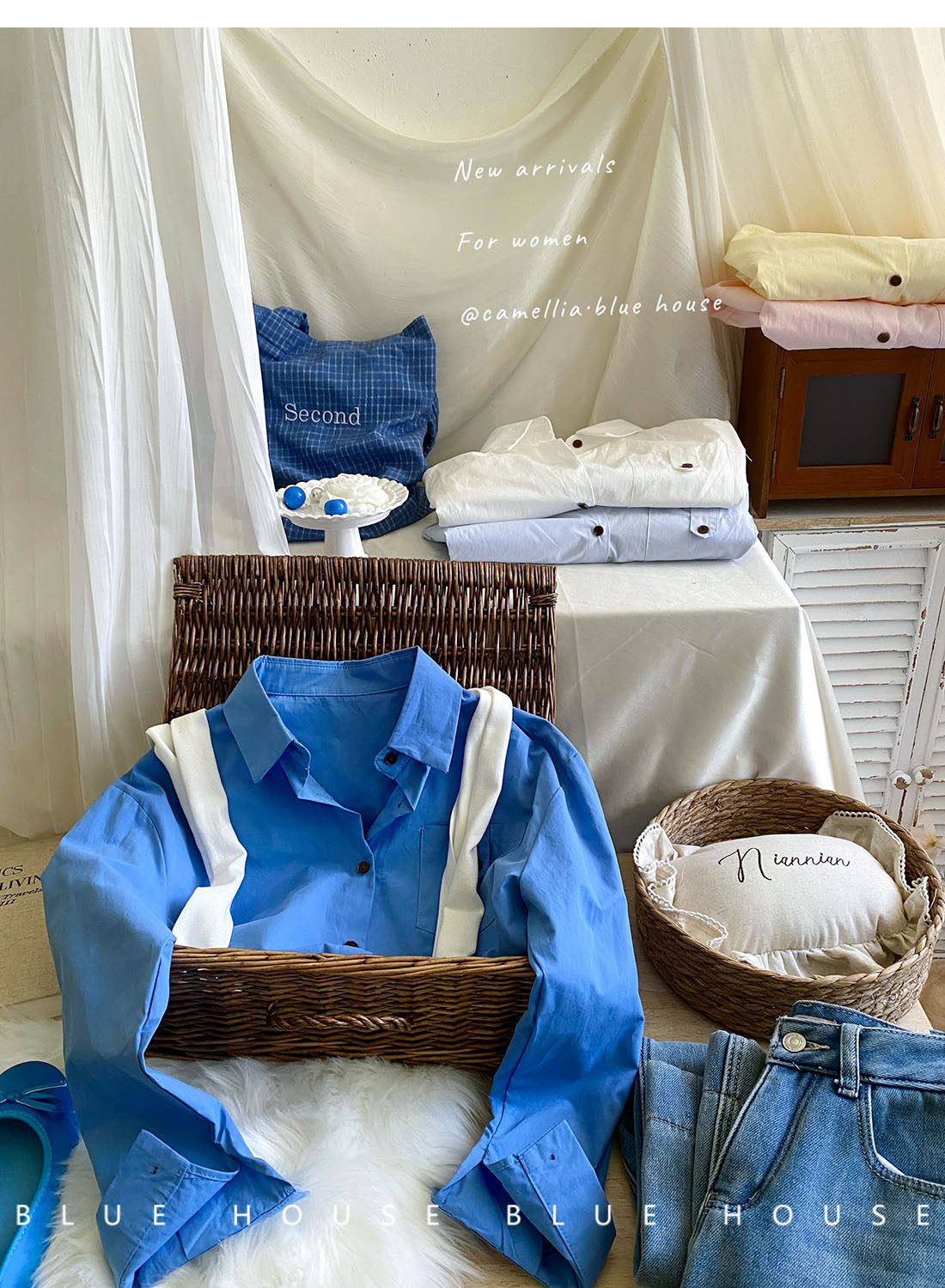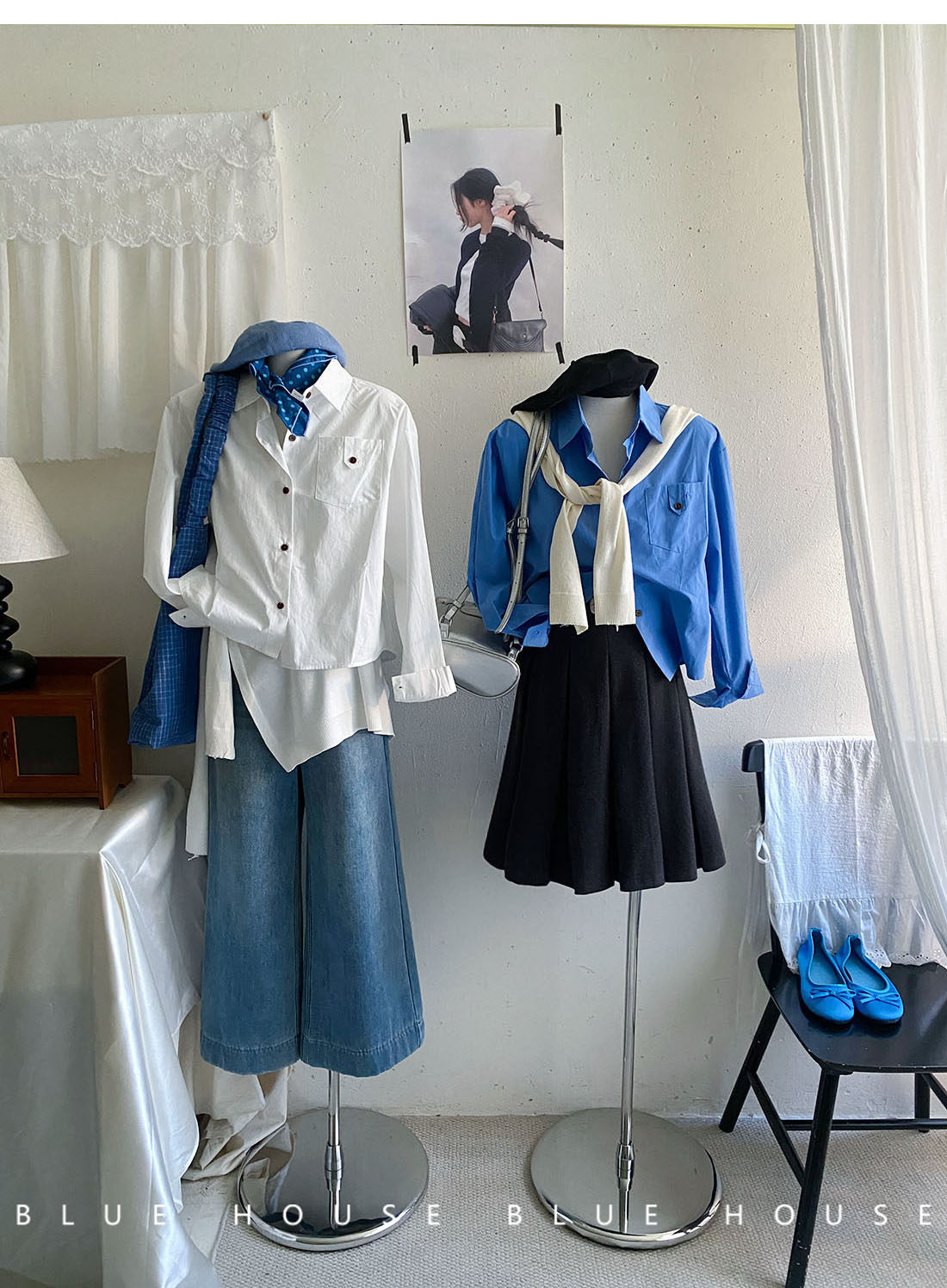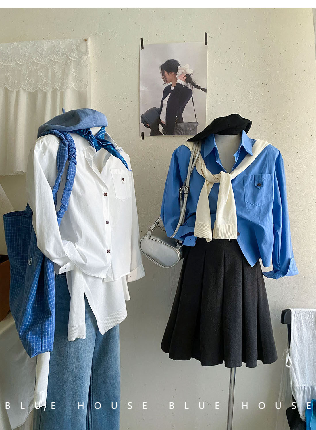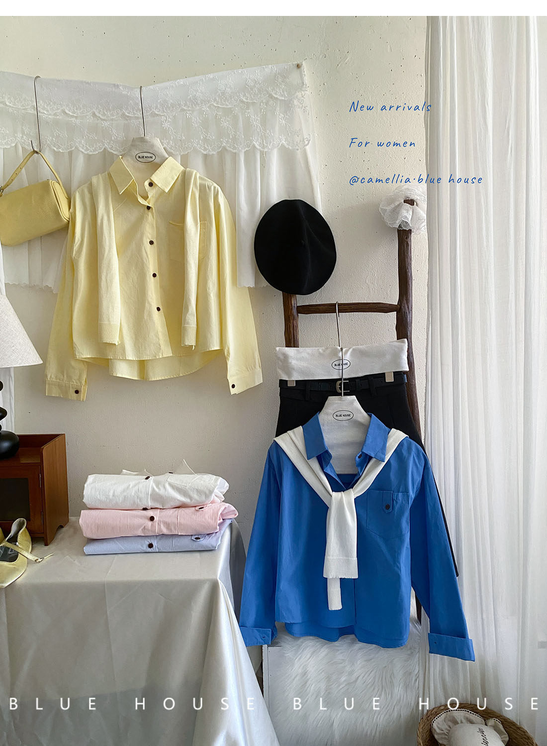 文藝知性藍配披肩短款長袖襯衫兩件套女春法式氣質小個子口袋襯衣