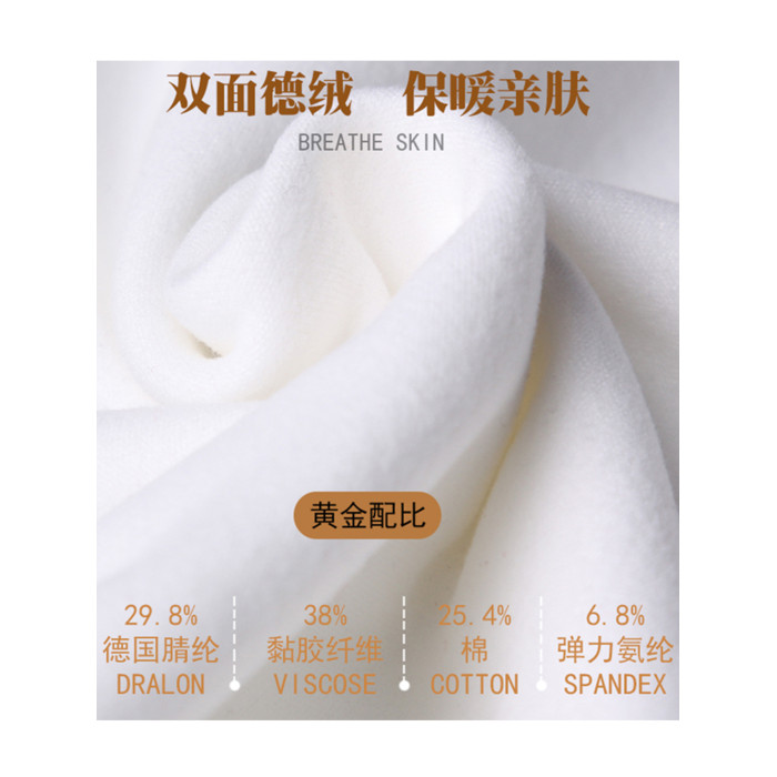 | 材質成分 | 粘膠纖維(粘纖)38.0% 聚丙烯腈纖維(腈綸)30.0% 棉25.0% 聚氨酯彈性纖維(氨綸)7.0% |
