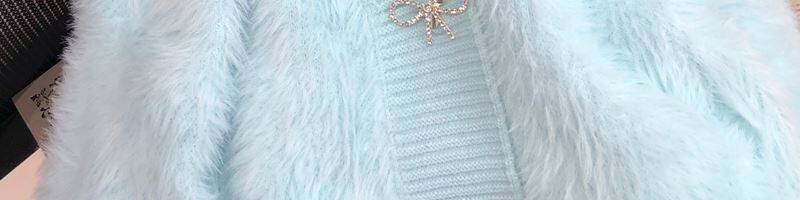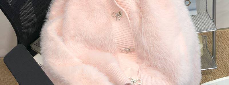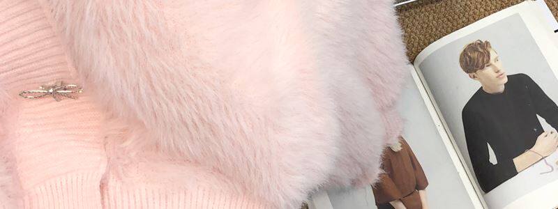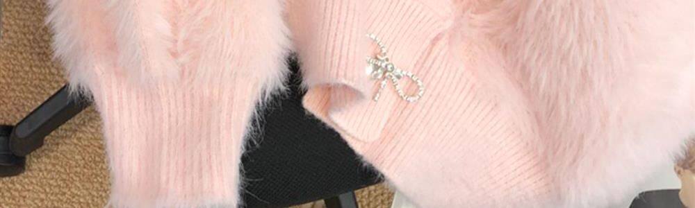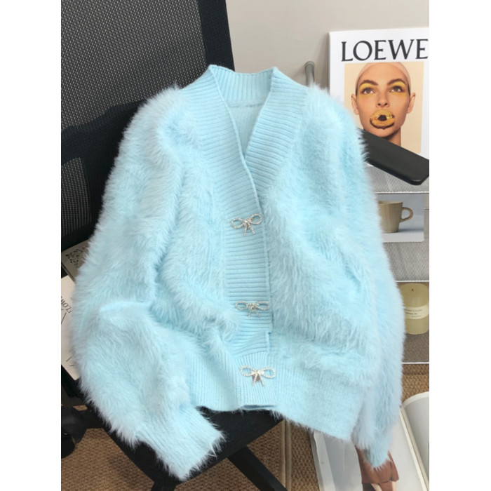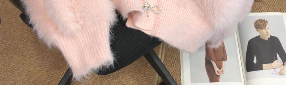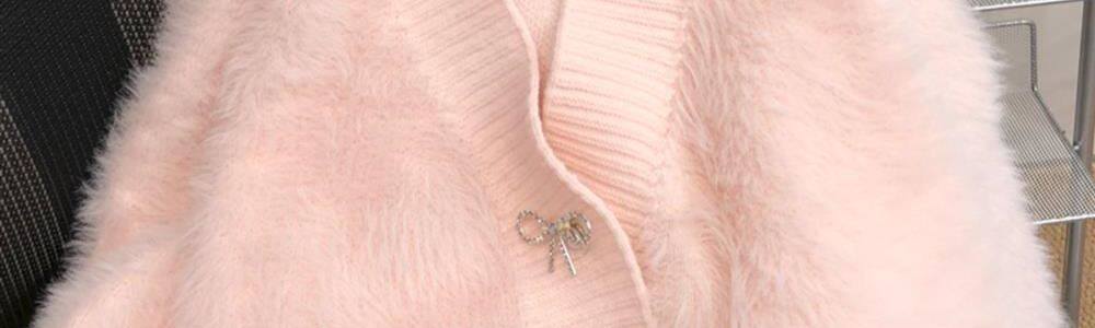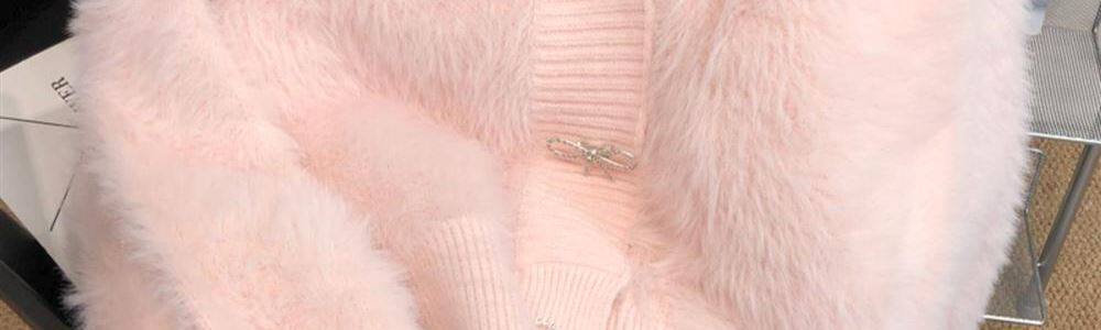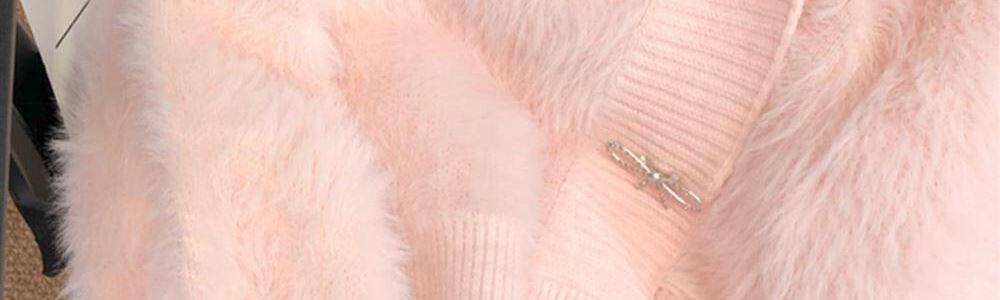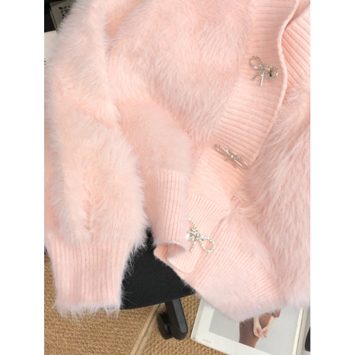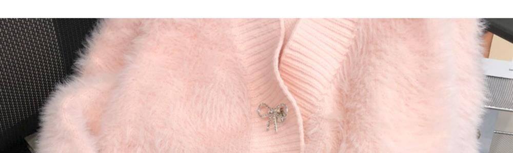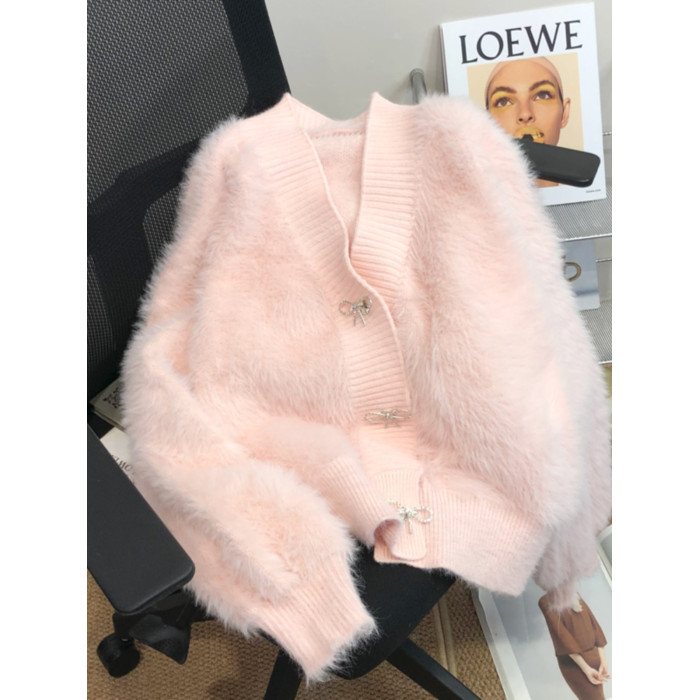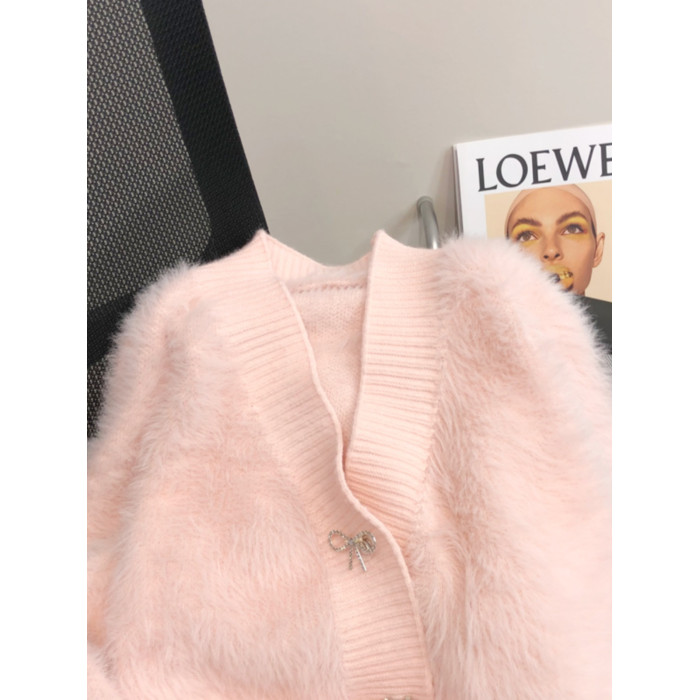 專櫃撤廻剪標粉色仿貂絨V領針織開衫女秋冬新款寬鬆軟糯毛衣外套