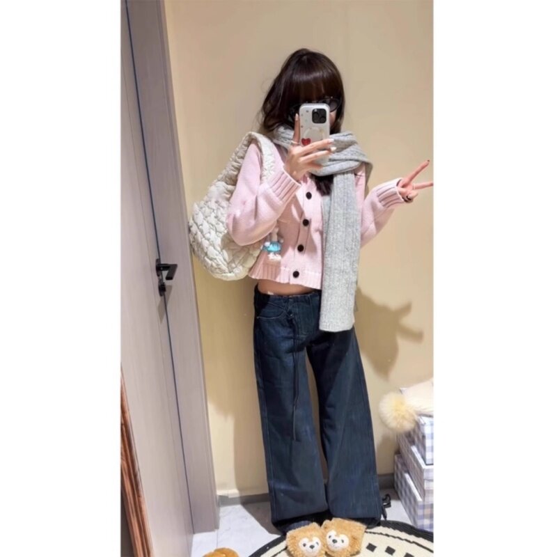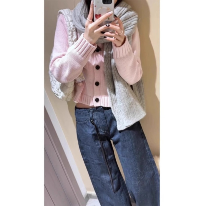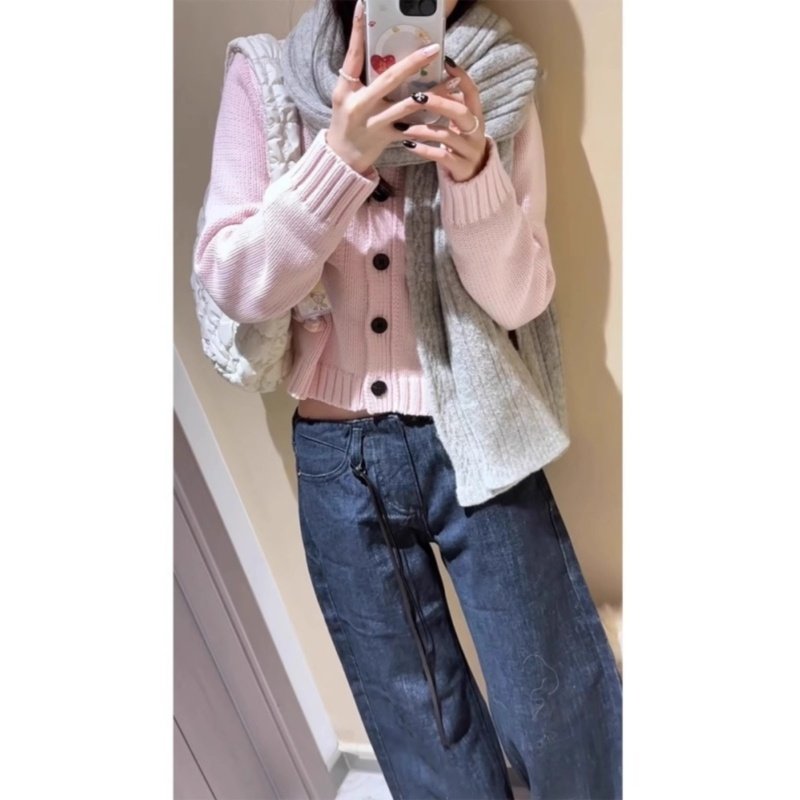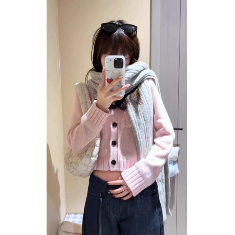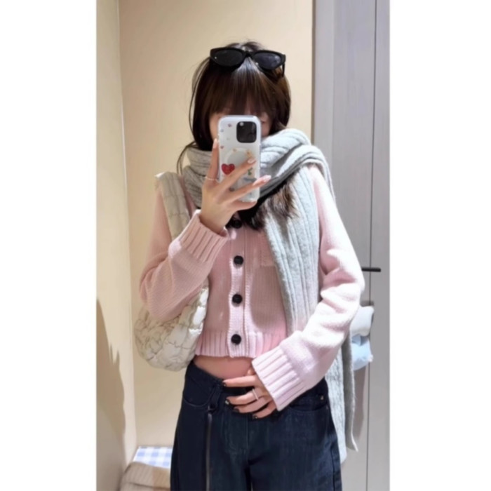 秋冬短款超好看粉色針織開衫上衣女冬季圓領百搭短款口袋毛衣外套