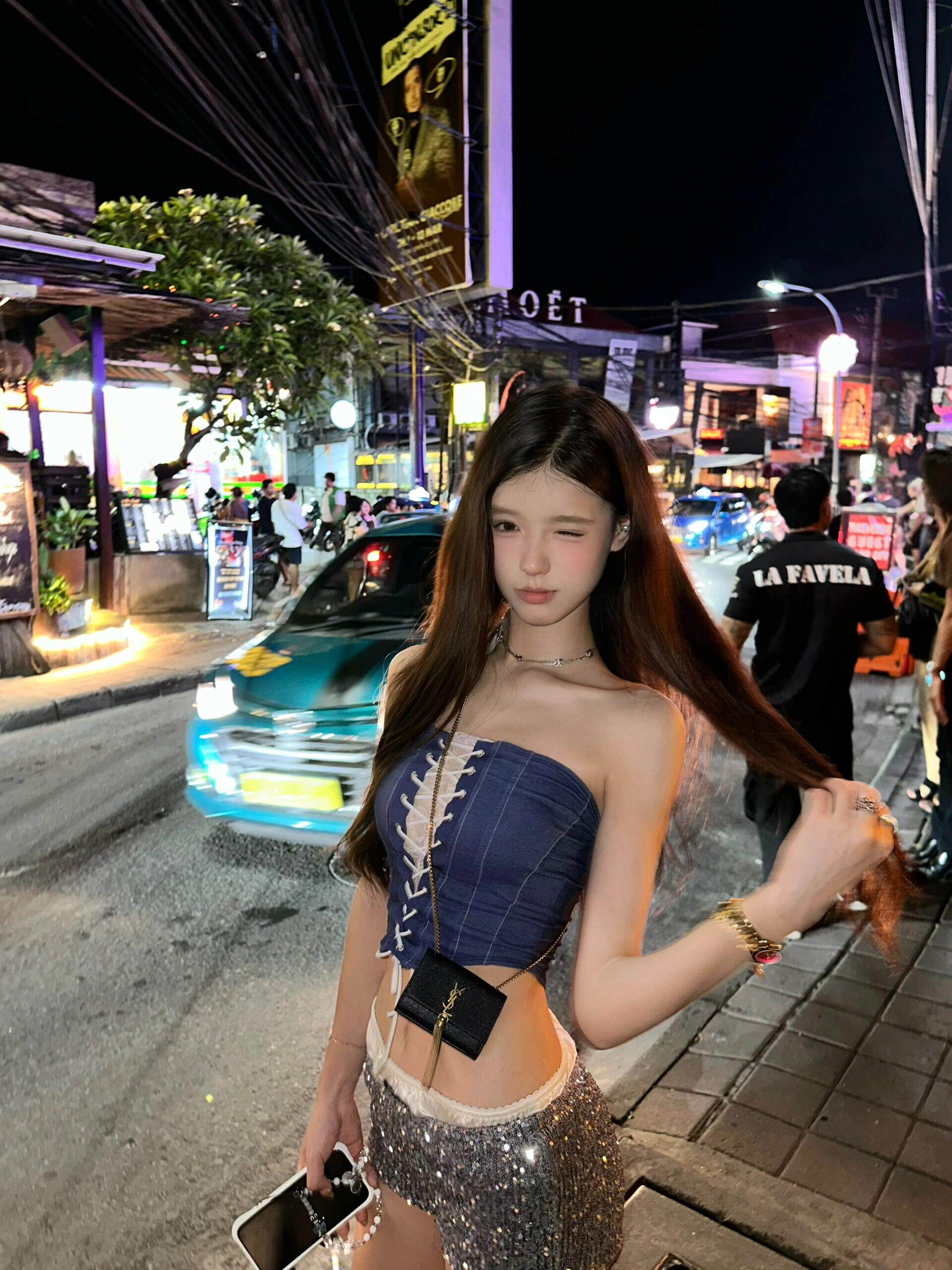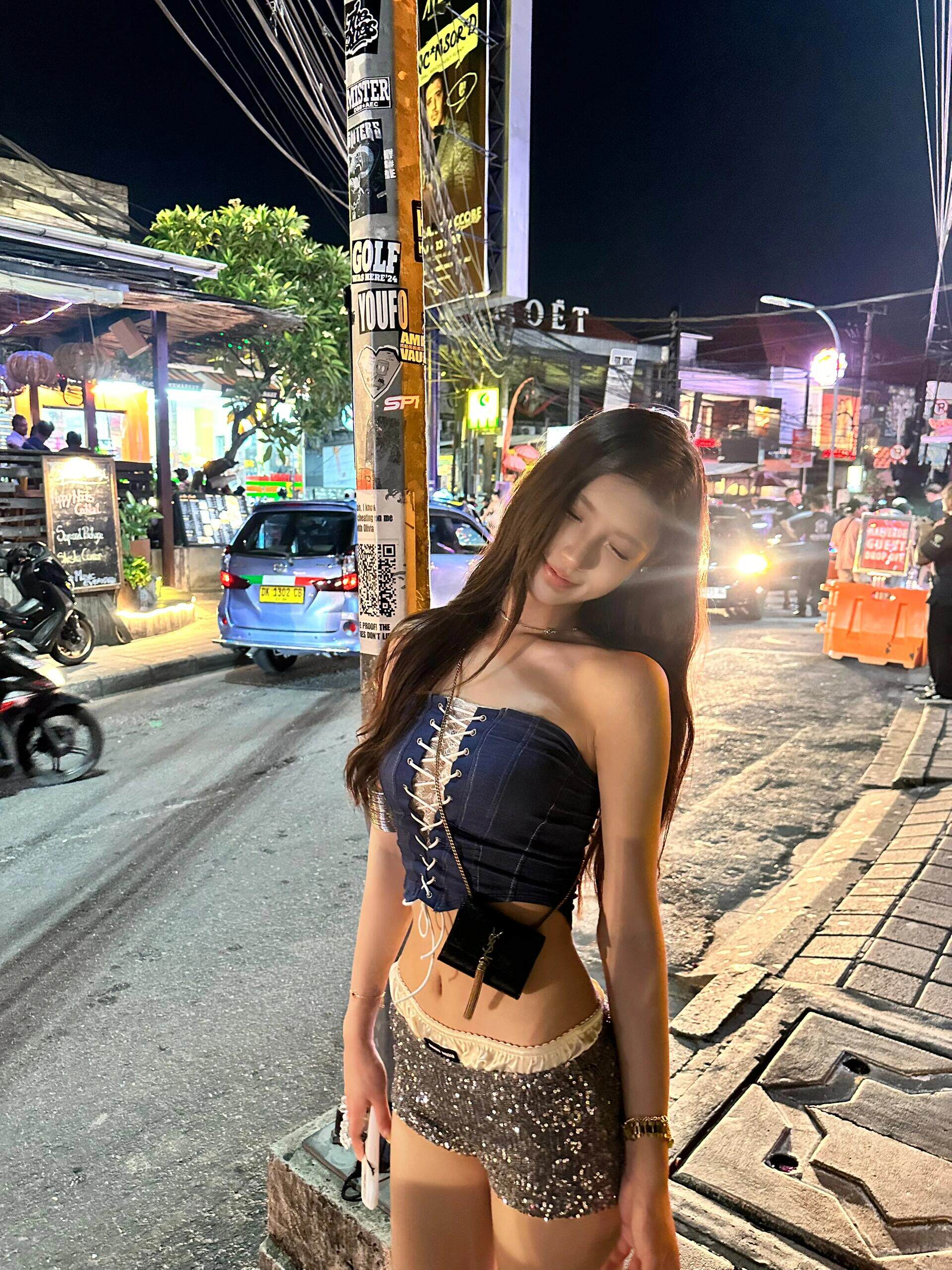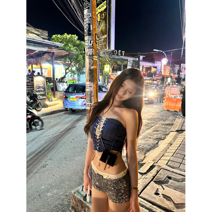 OUTFlT 歐美辣妹風性感綁帶抹胸上衣2025新款修身顯瘦亮片短褲女