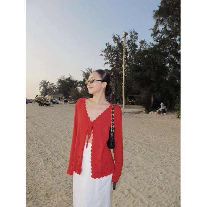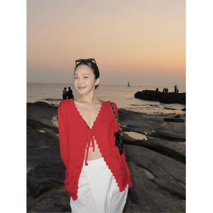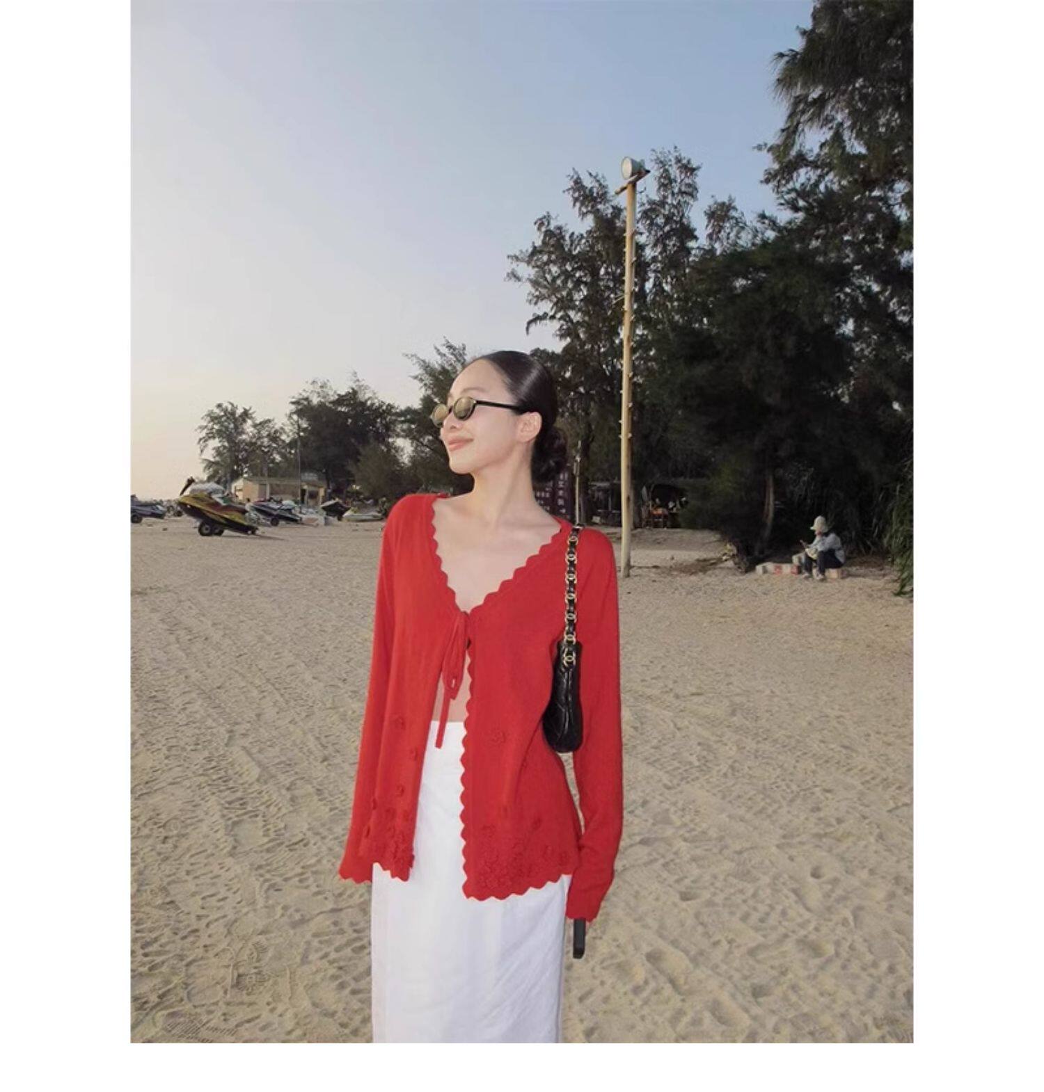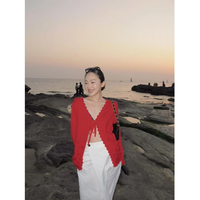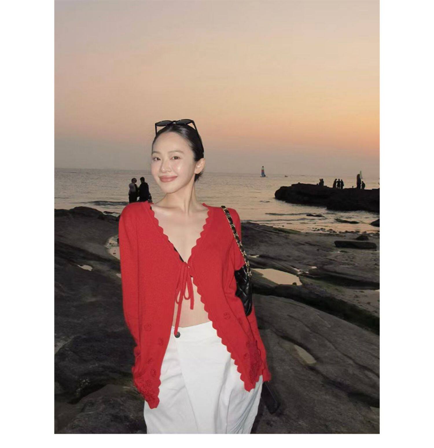 Turn right/陳大腿 美式復古設計感系帶針織開衫高級百搭長袖上衣
