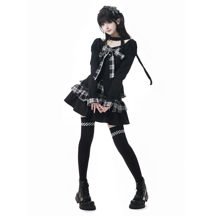 pinksavior【愛麗絲】格紋拼接經典顯瘦假兩件上衣半裙設計感套裝