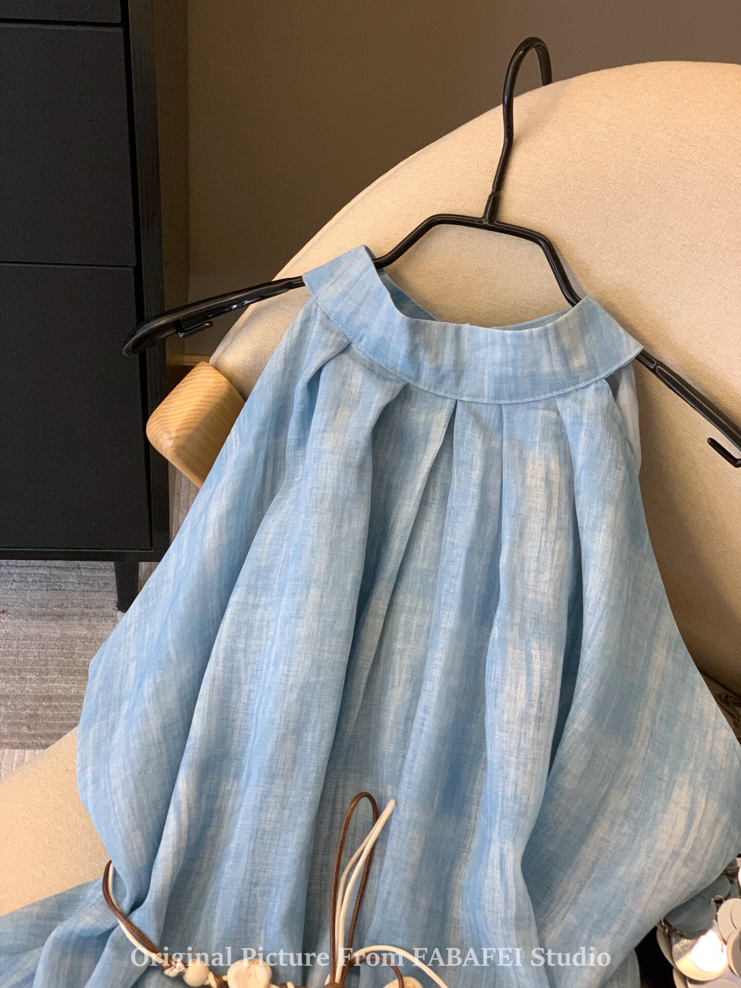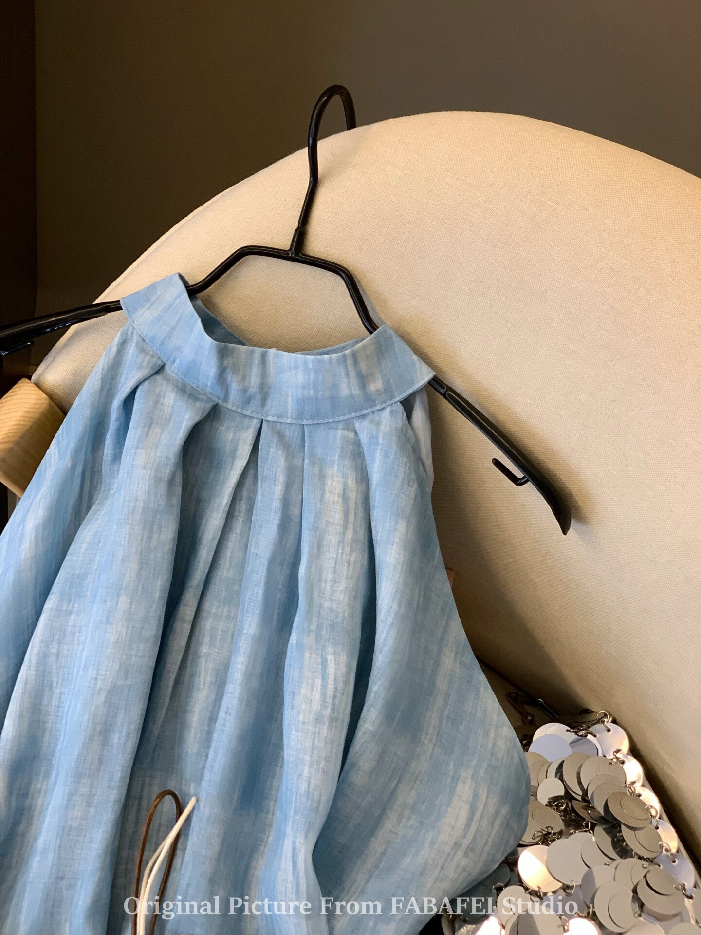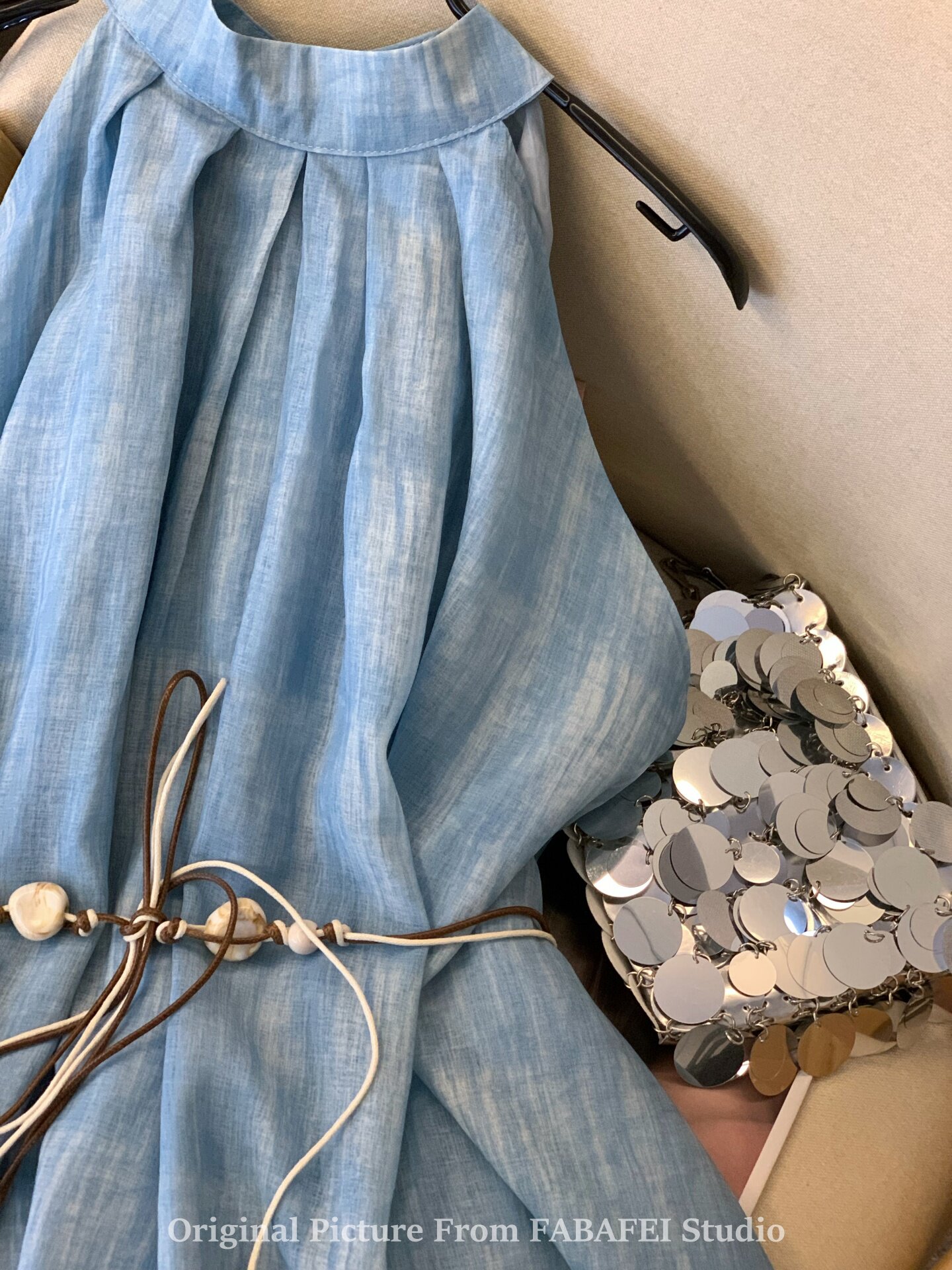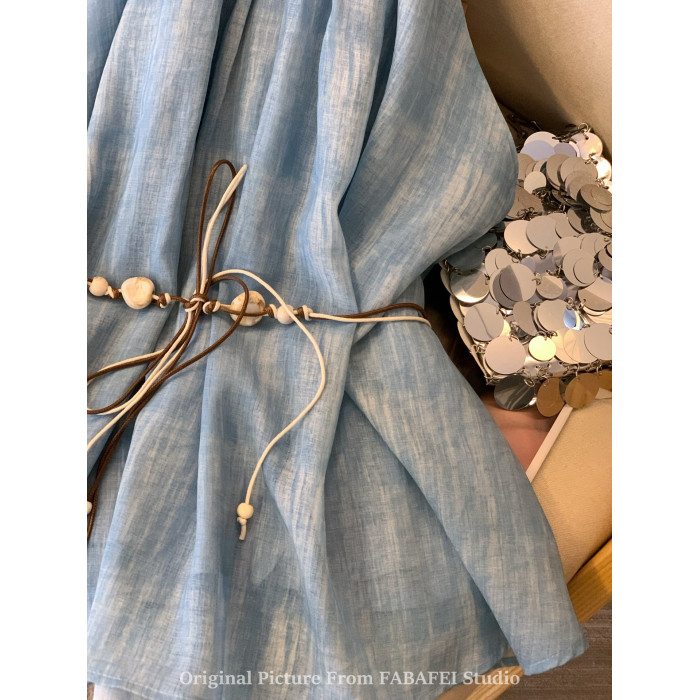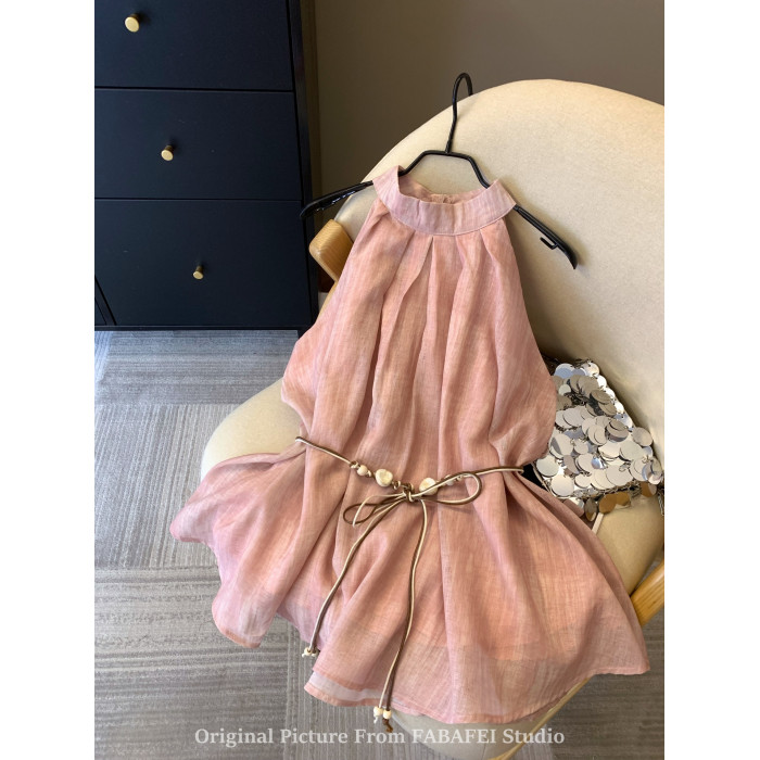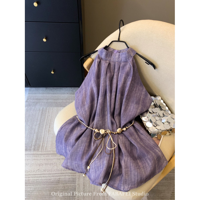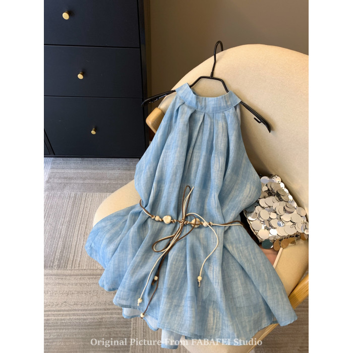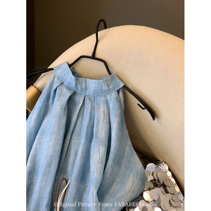 專櫃撤廻剪標波嬉風漸變藍色掛脖背心襯衫女夏季辣妹削肩雪紡上衣