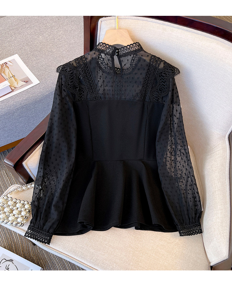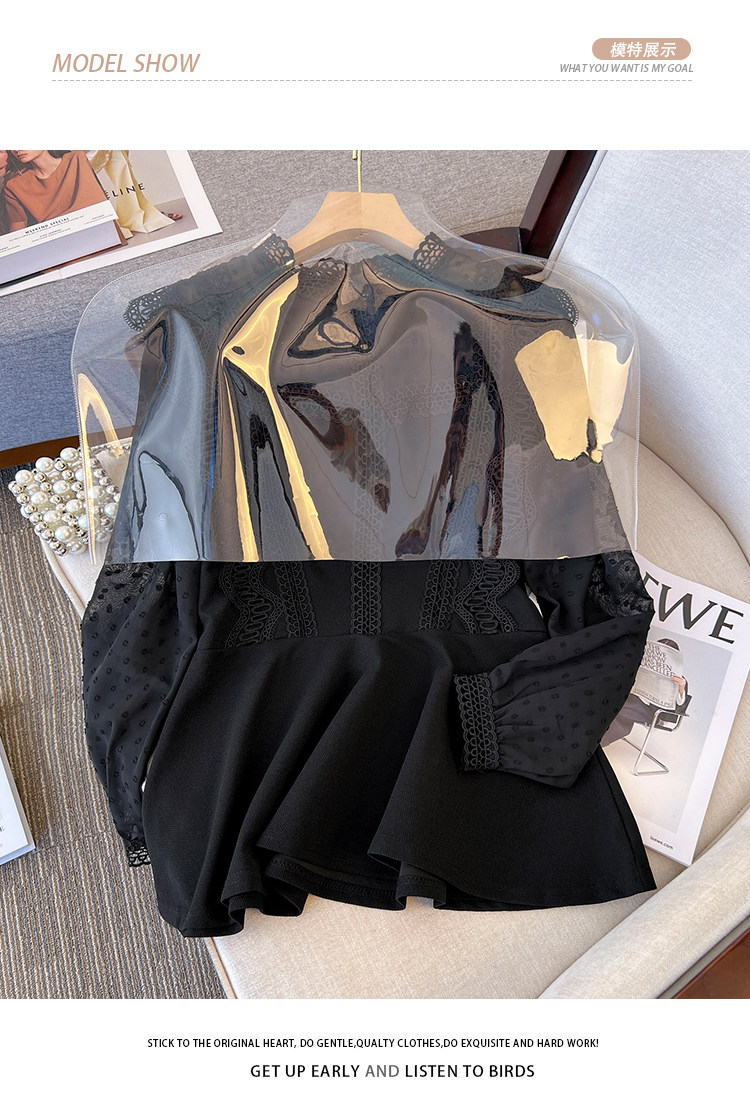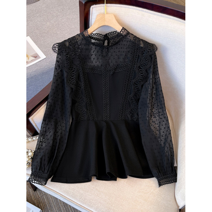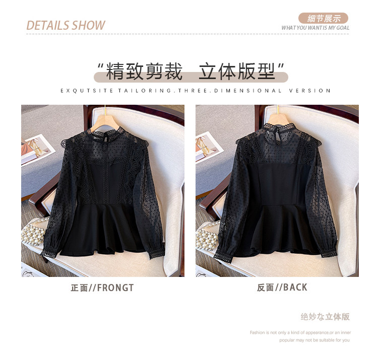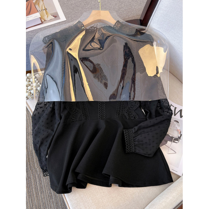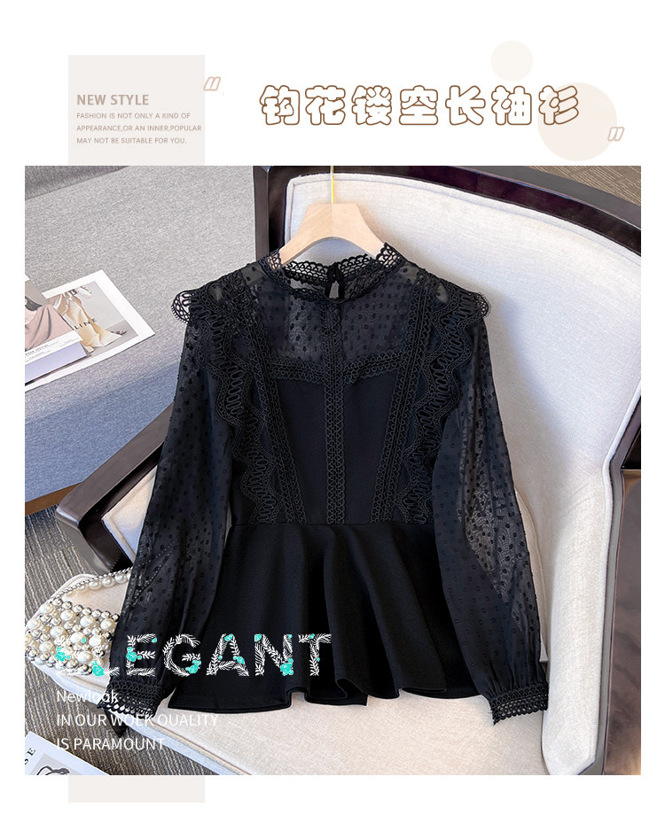 黑色鏤空雪紡長袖襯衫女春秋2025大碼胖mm高級感蕾絲拼接打底上衣