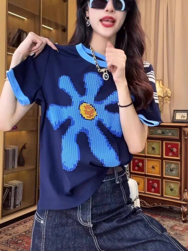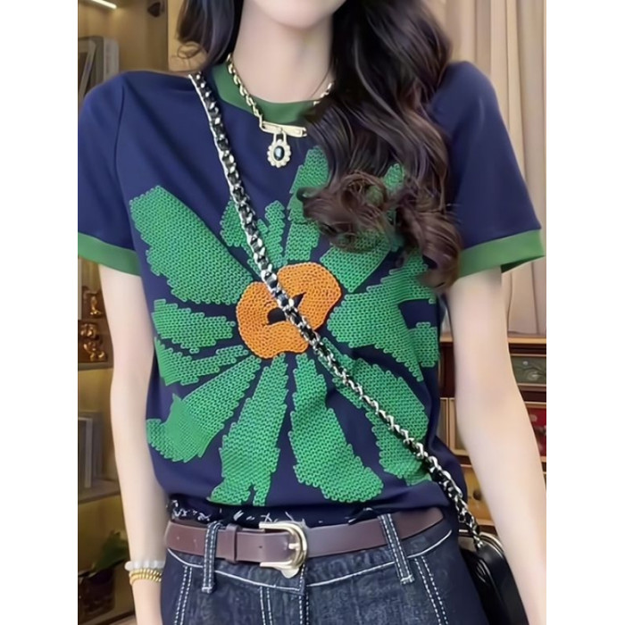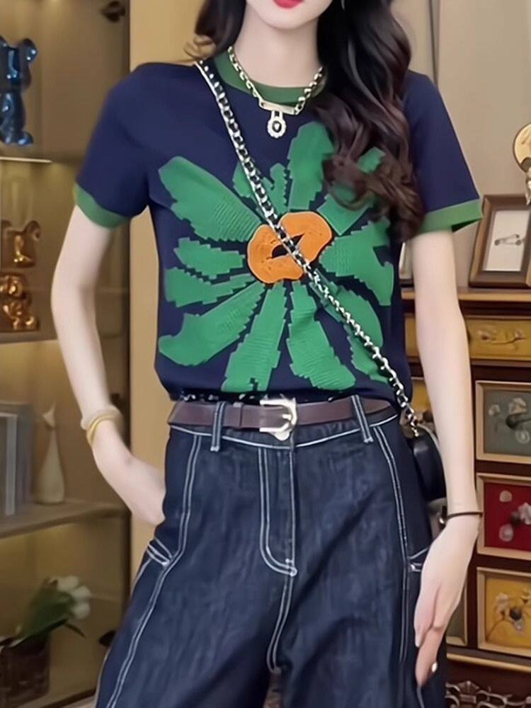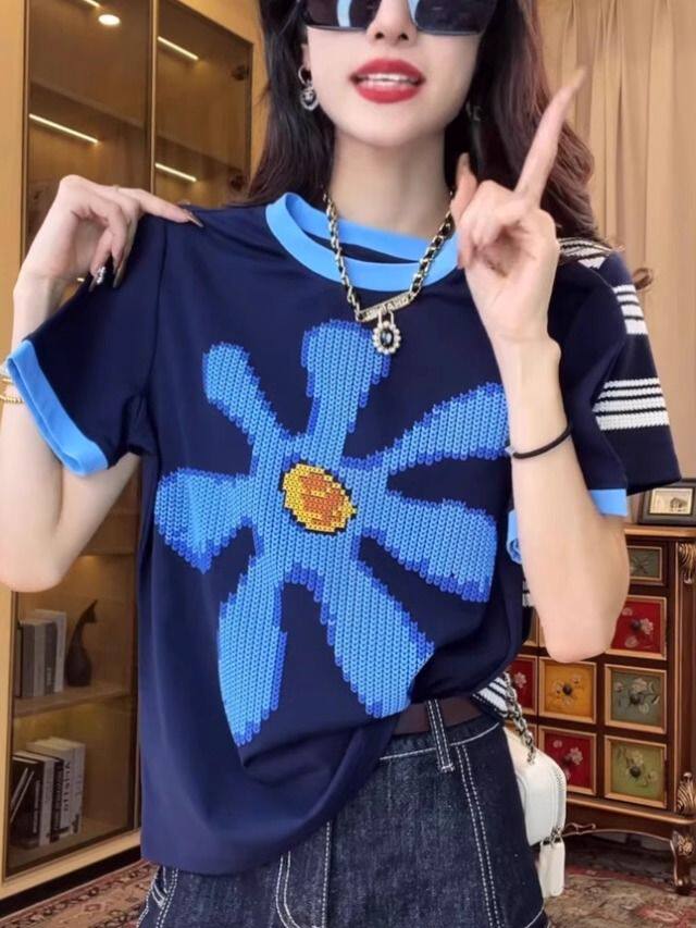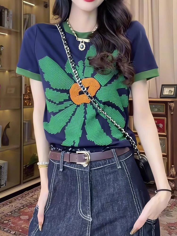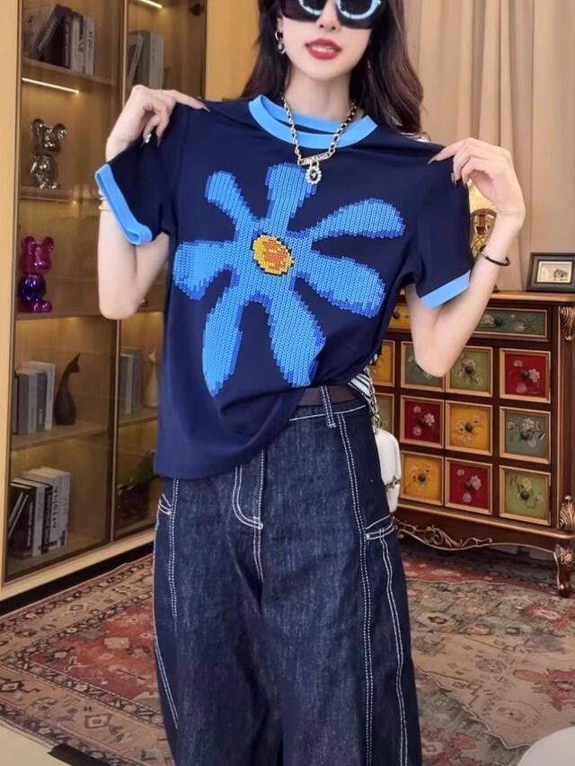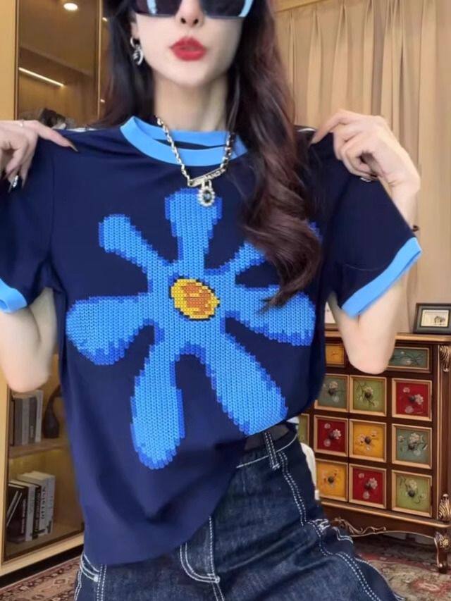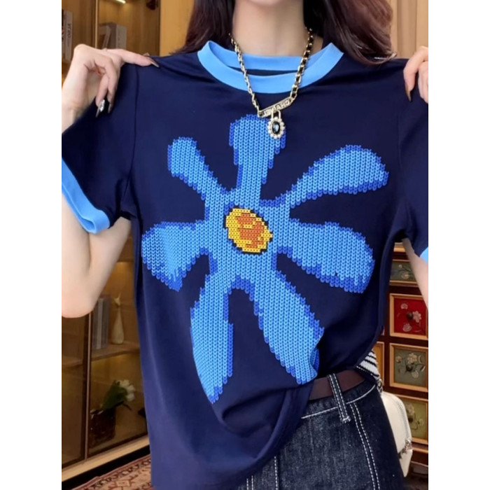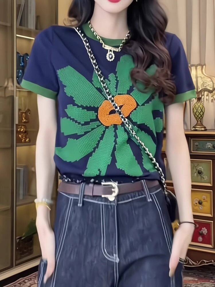 歐貨重工撞色正肩短袖T恤女夏季時尚印花設計感小衆別致純棉上衣