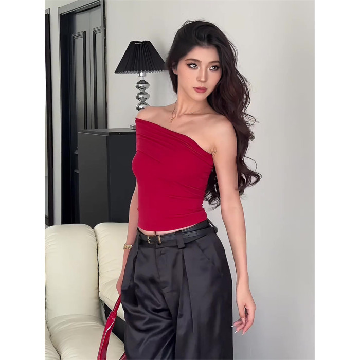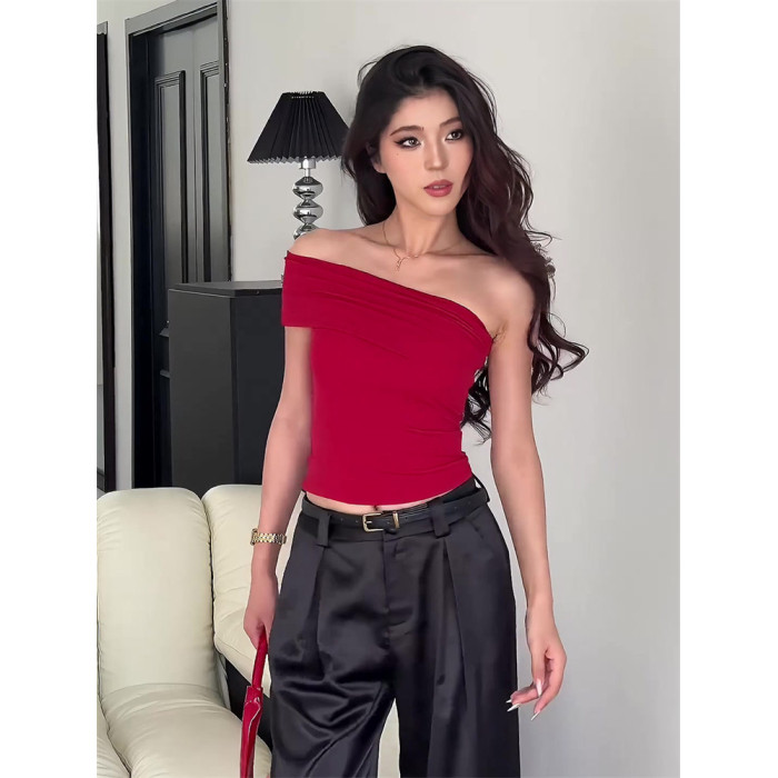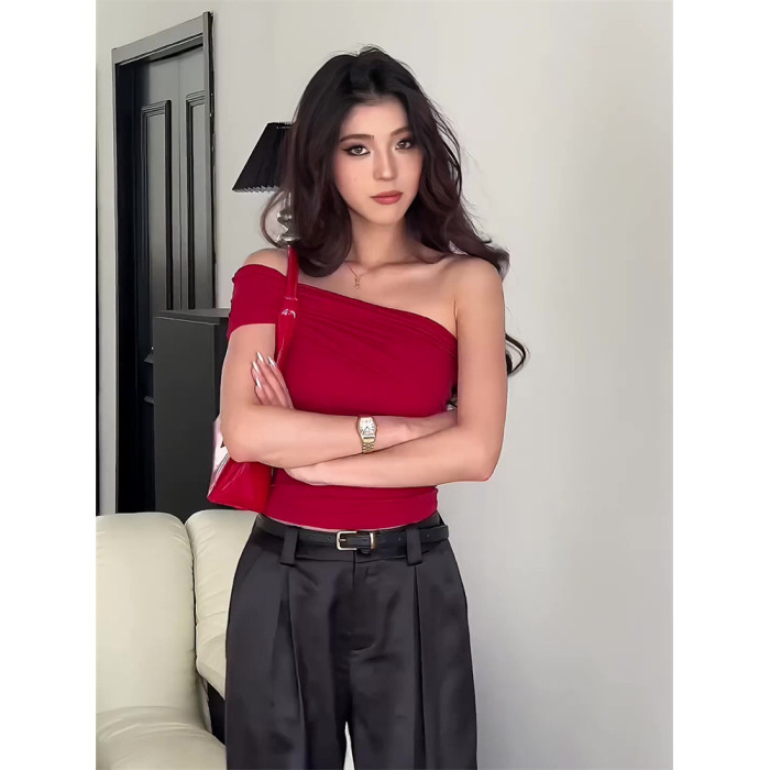斜肩上衣夏季新款薄款辣妹設計感短款T恤女