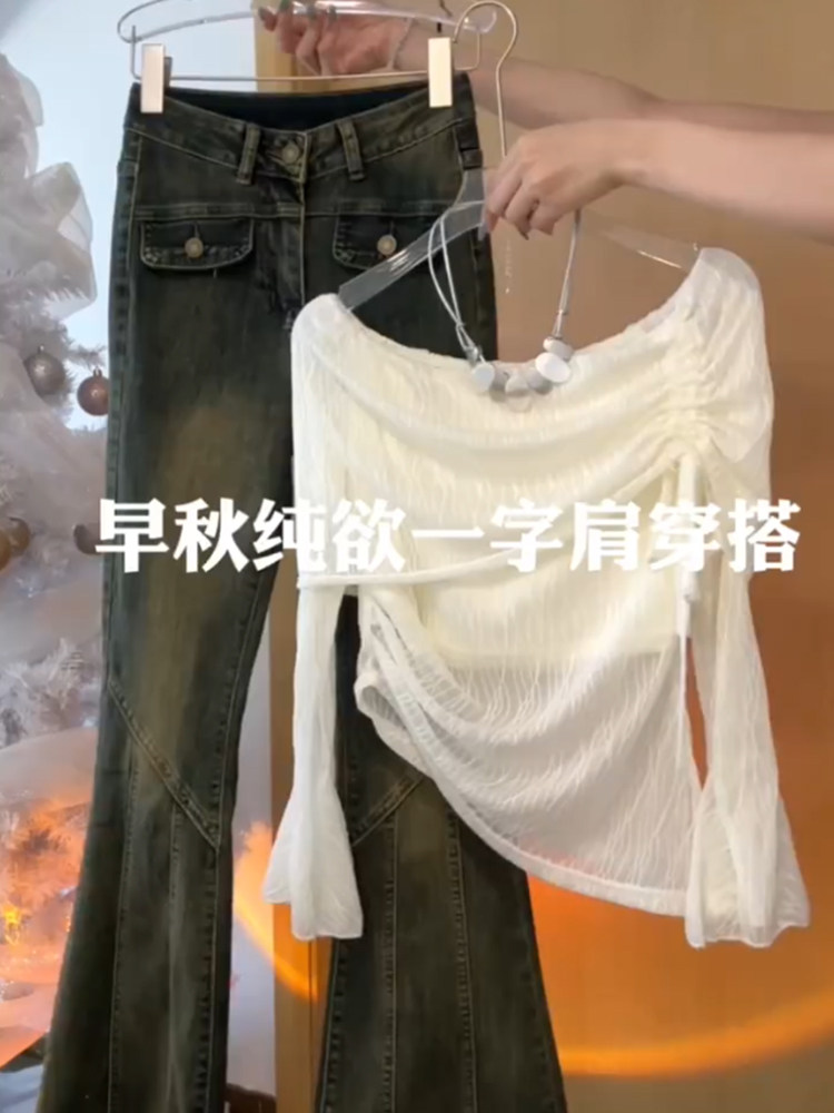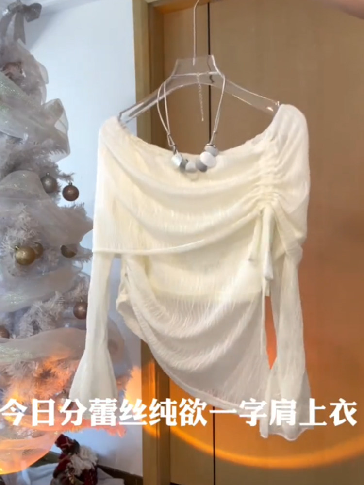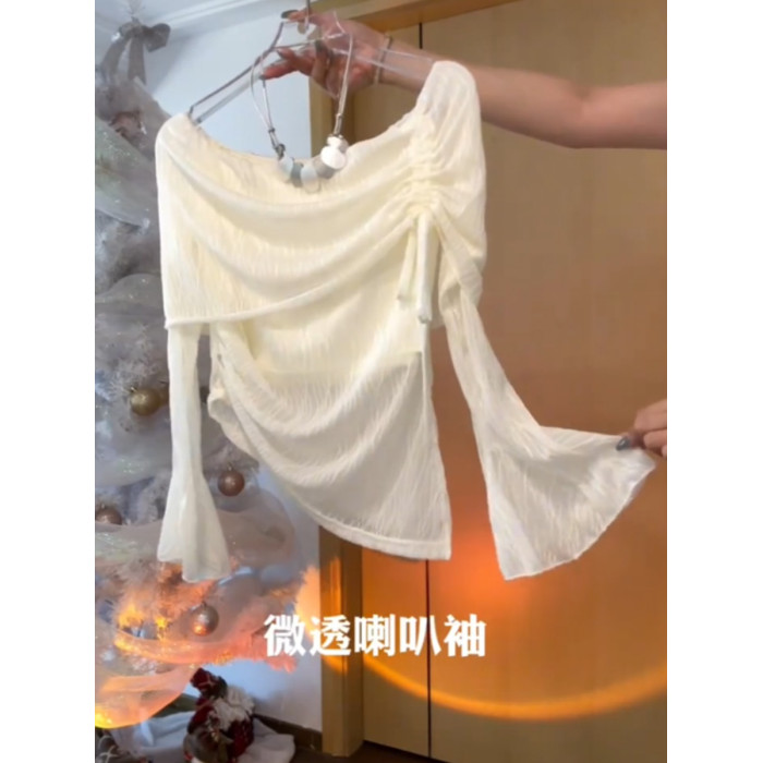 上身巨好看~一字肩喇叭袖辣妹長袖上衣新款不規則薄款防曬T恤套裝
