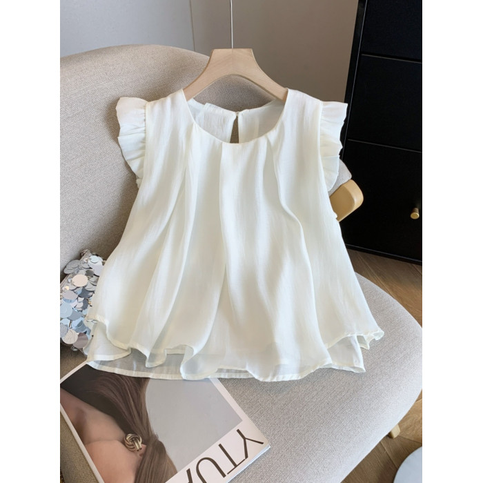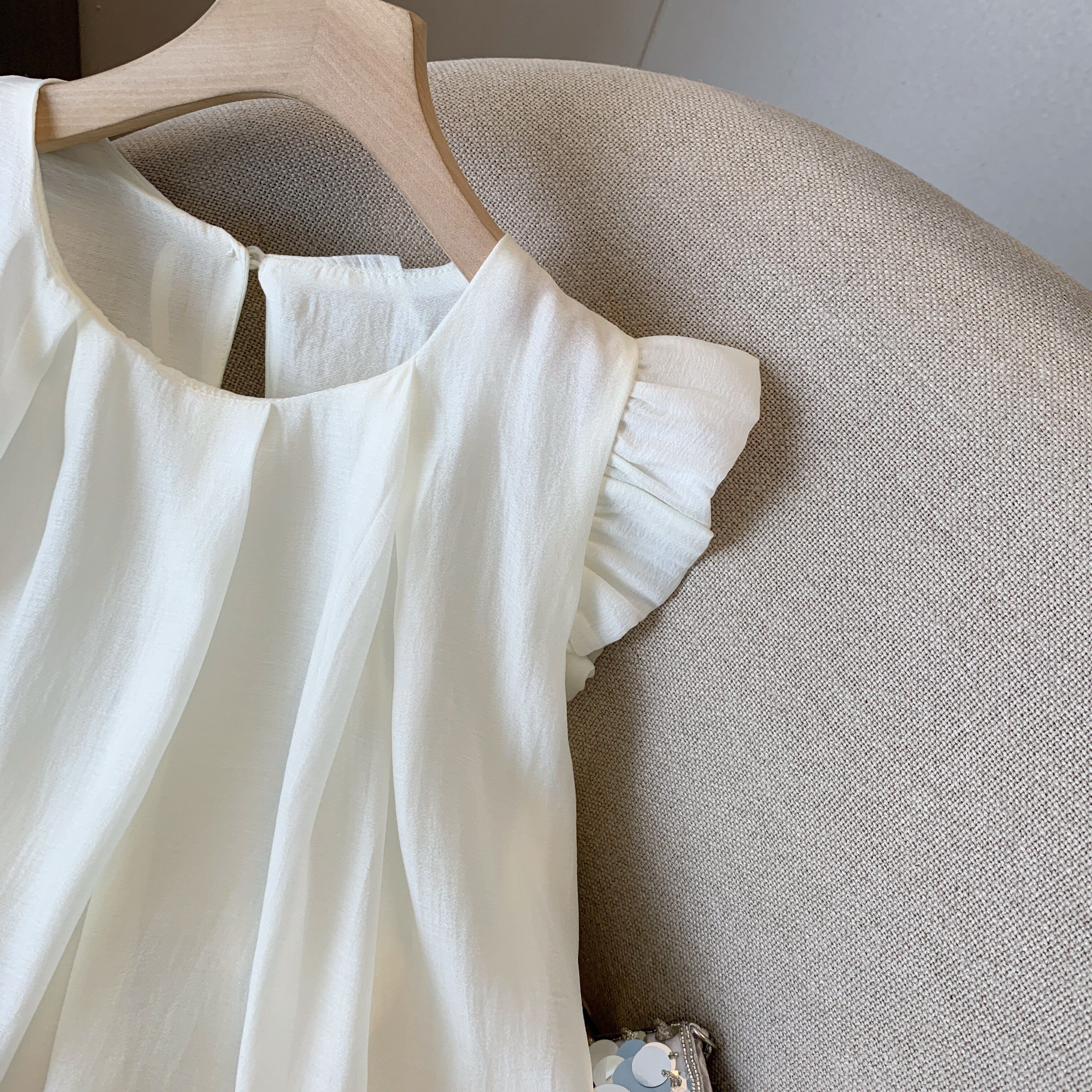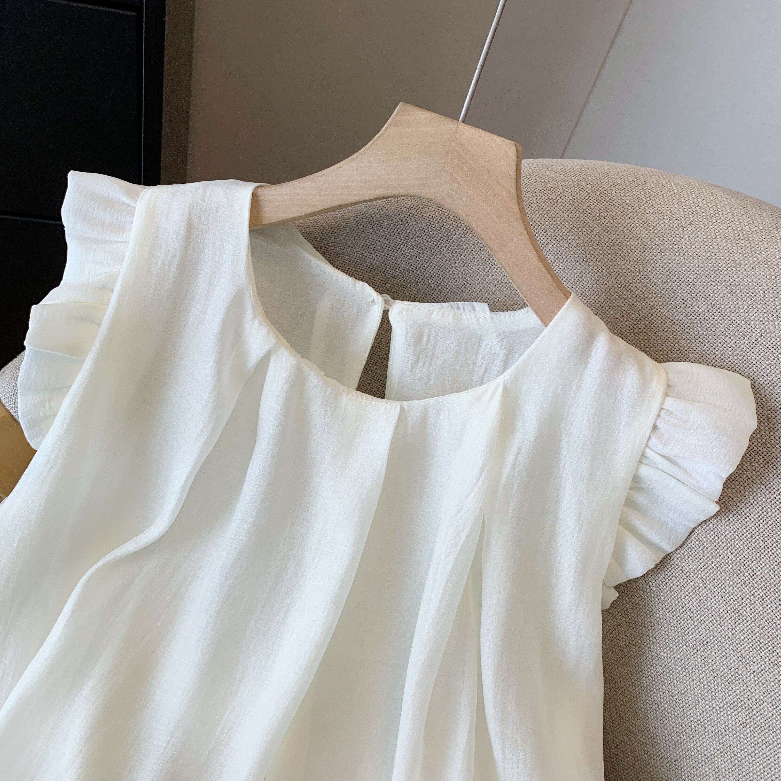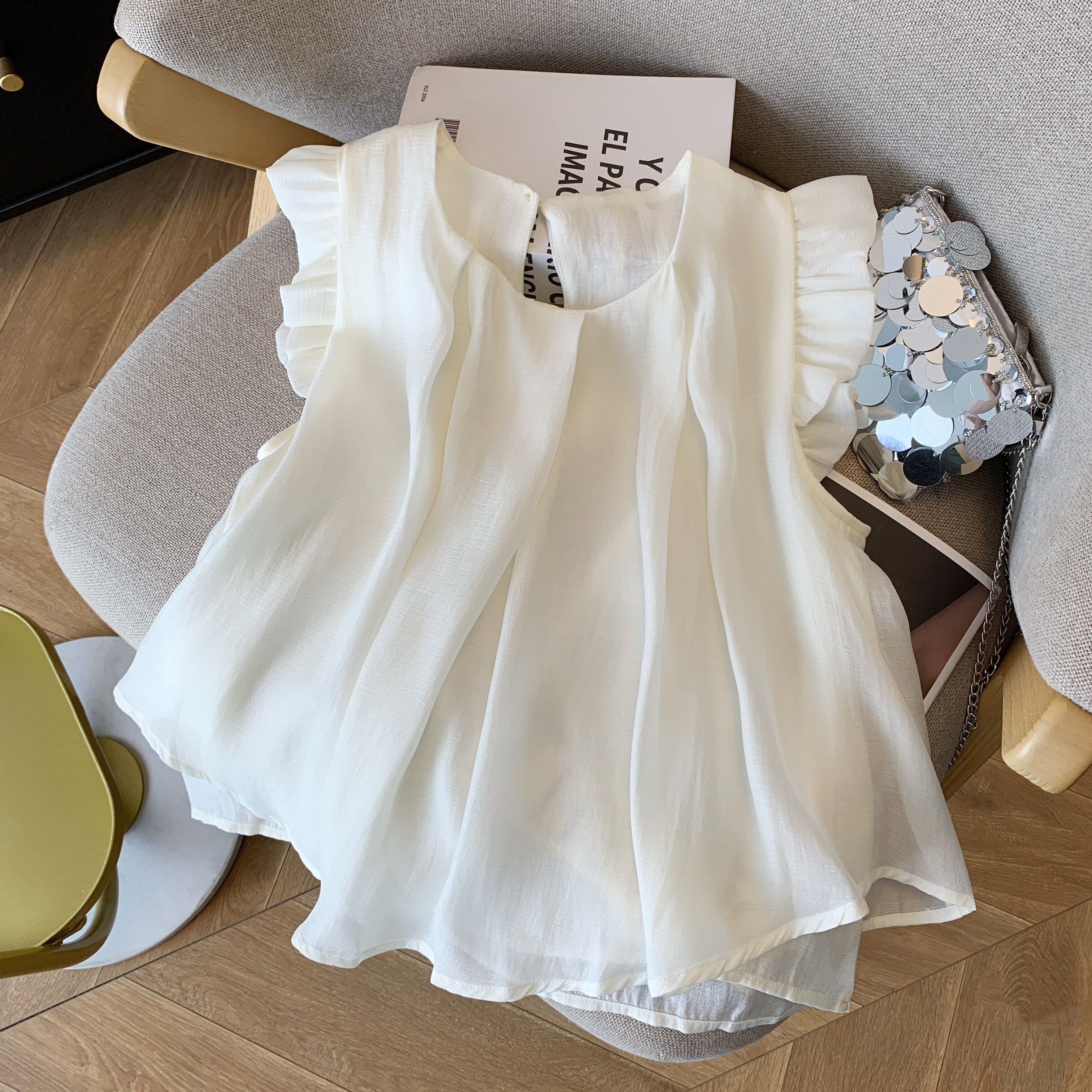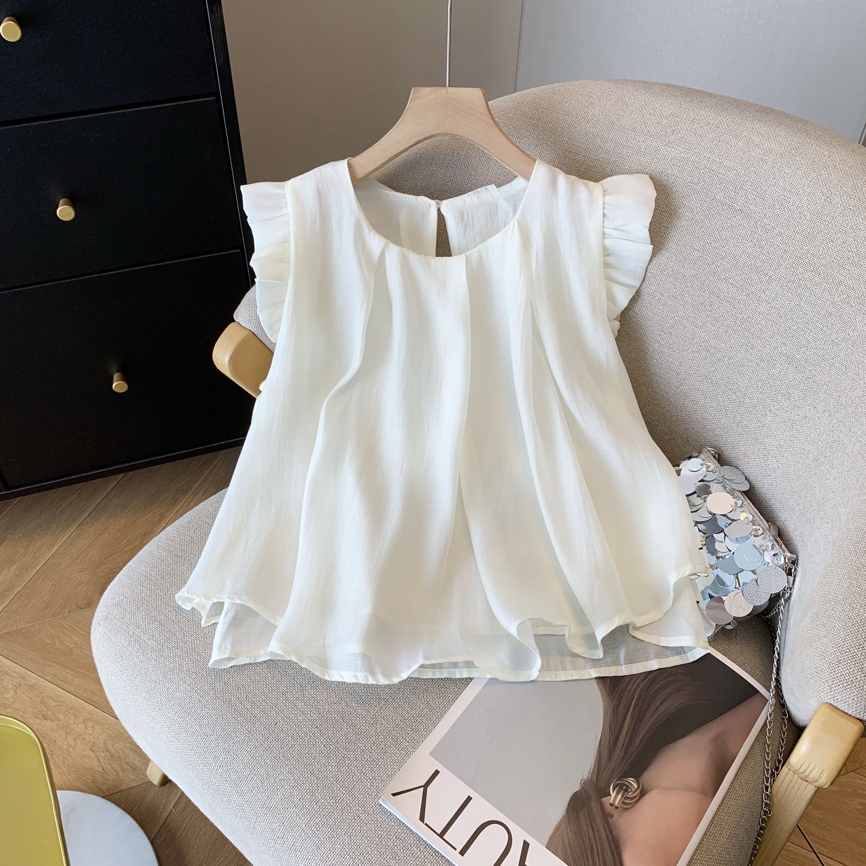 專櫃撤廻大牌剪標女裝法式小飛袖襯衫女夏季別致寬鬆無袖雪紡上衣