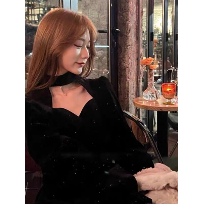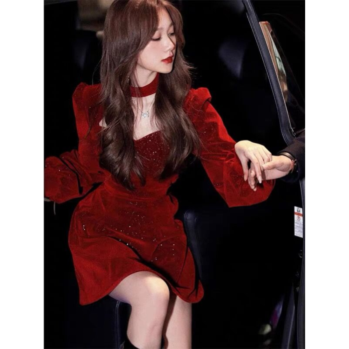 2025新款女裝紅色金絲絨連衣裙年會禮服本命年聖誕新年戰袍小紅裙
