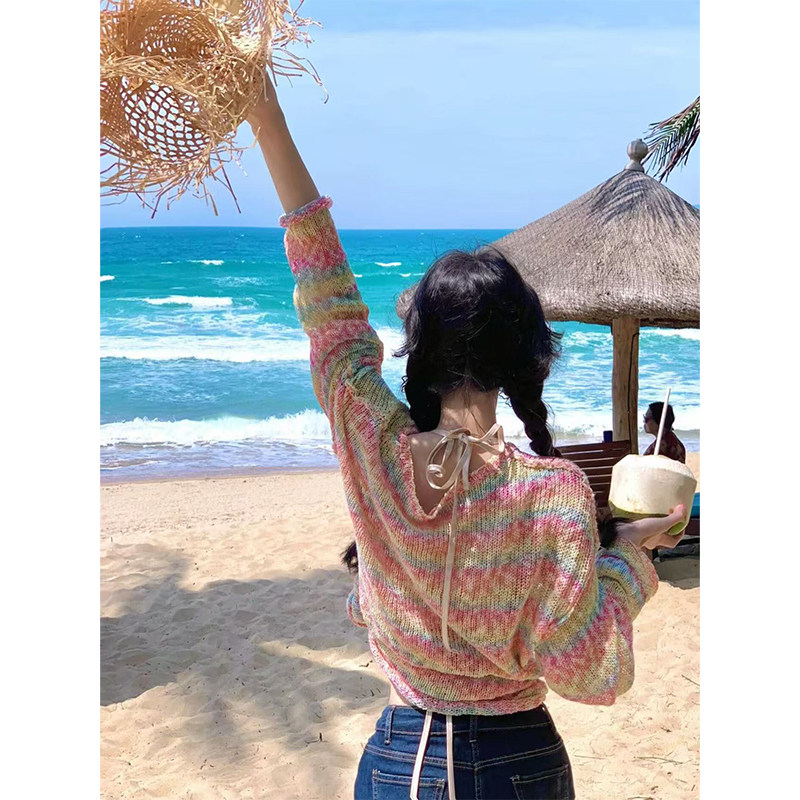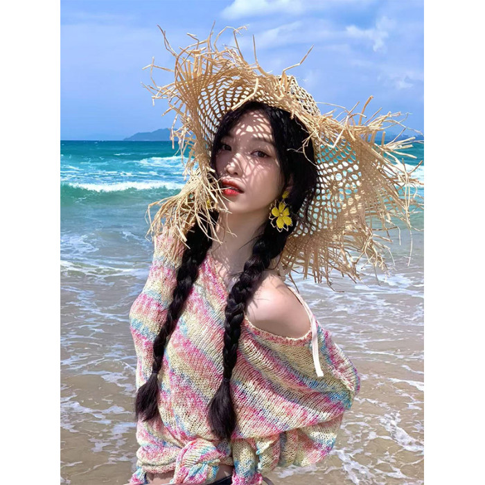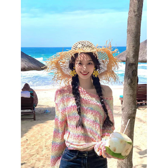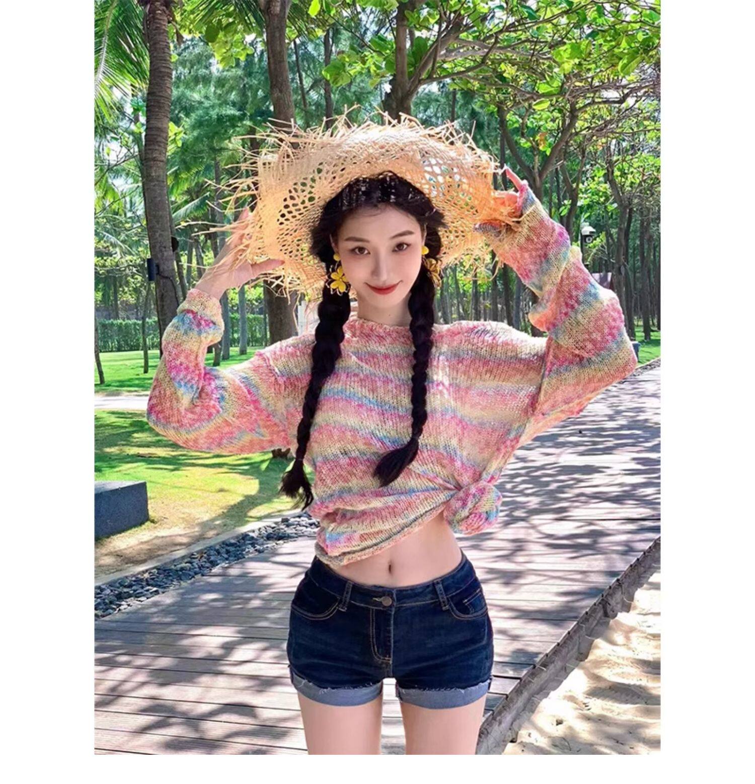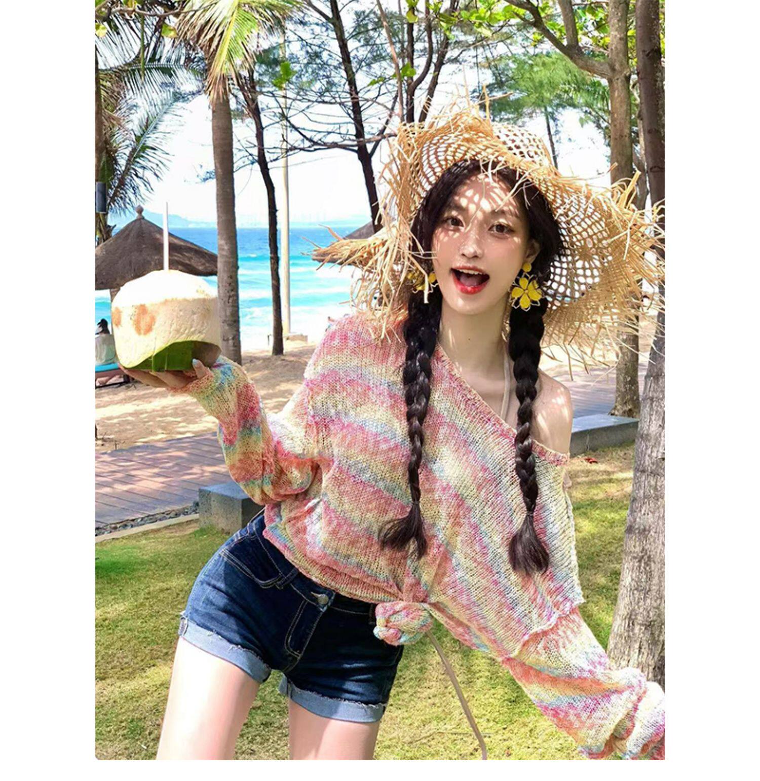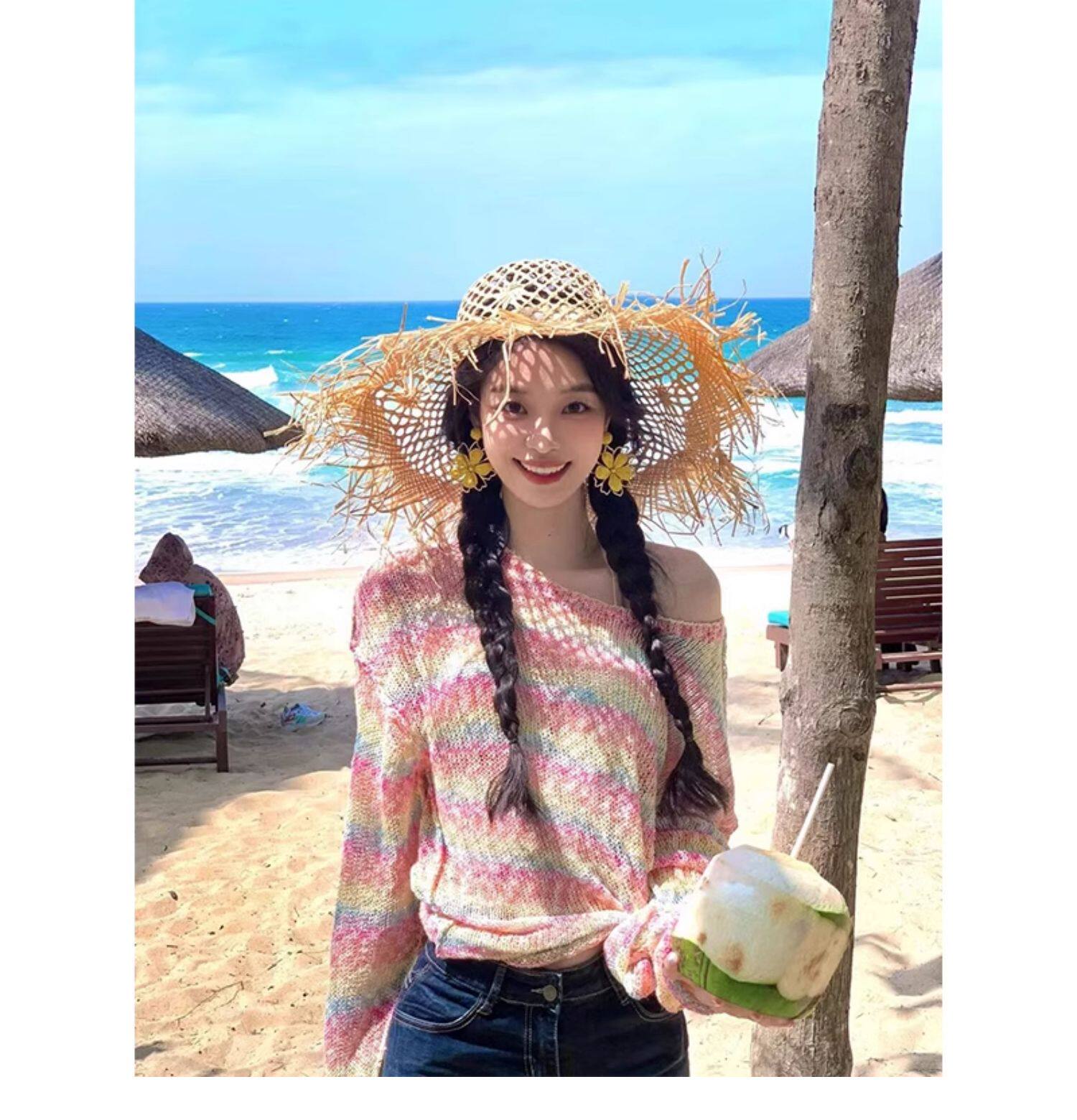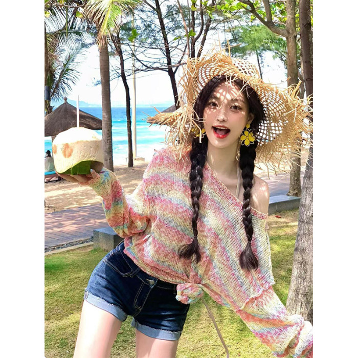 Turn right/陳大腿 彩虹撞色針織T恤女夏季露肩性感寬鬆針織衫ins