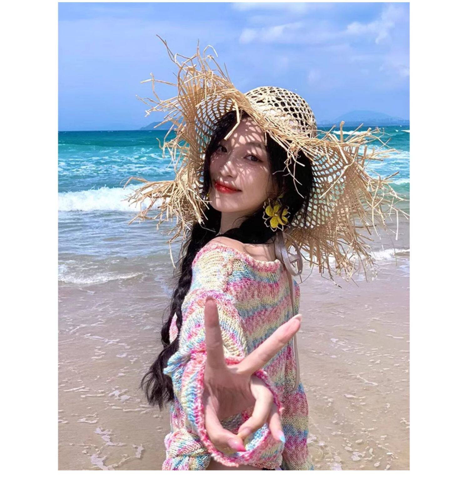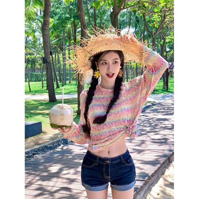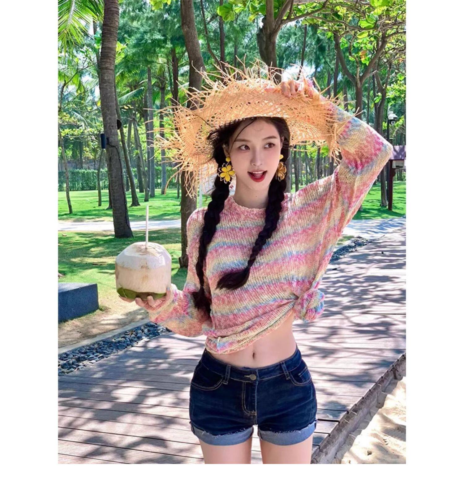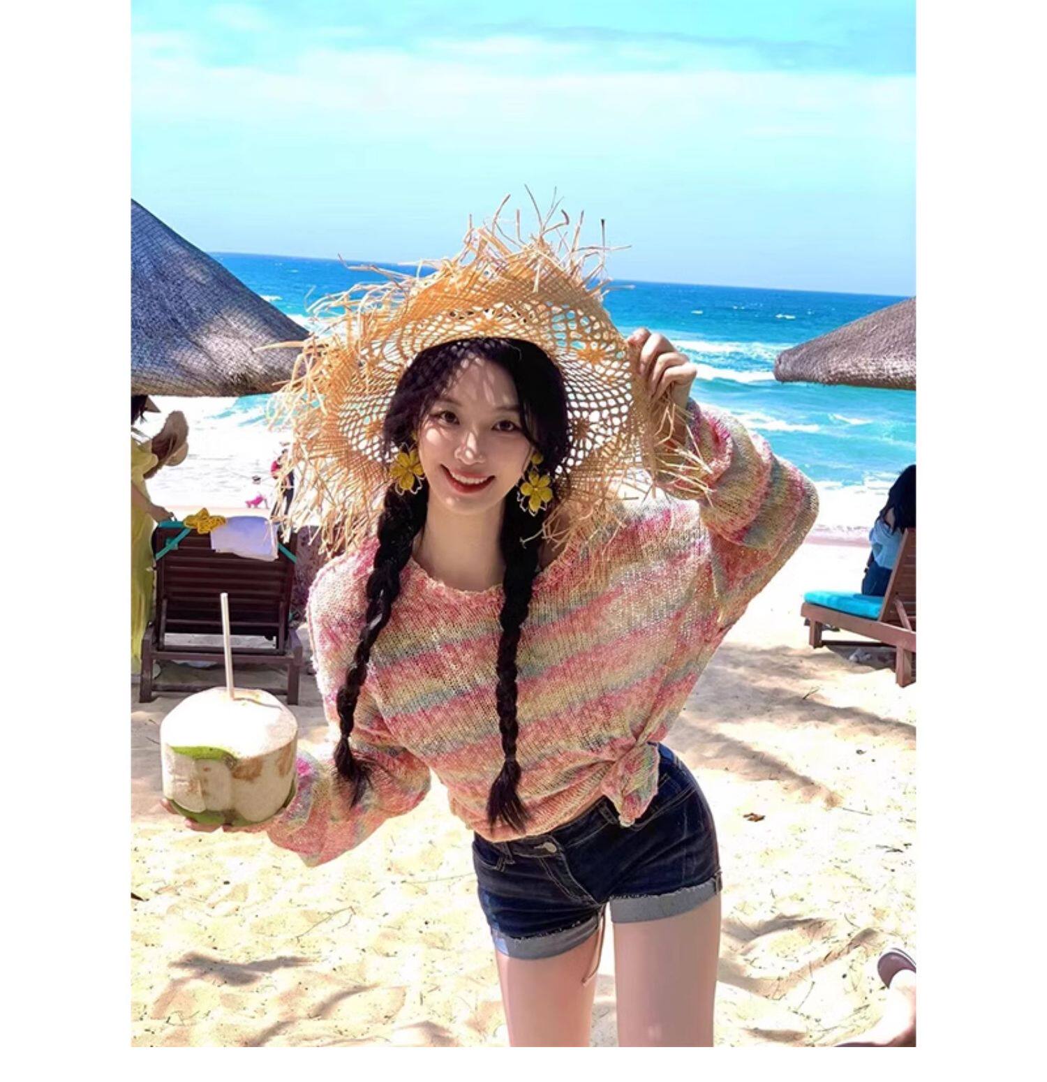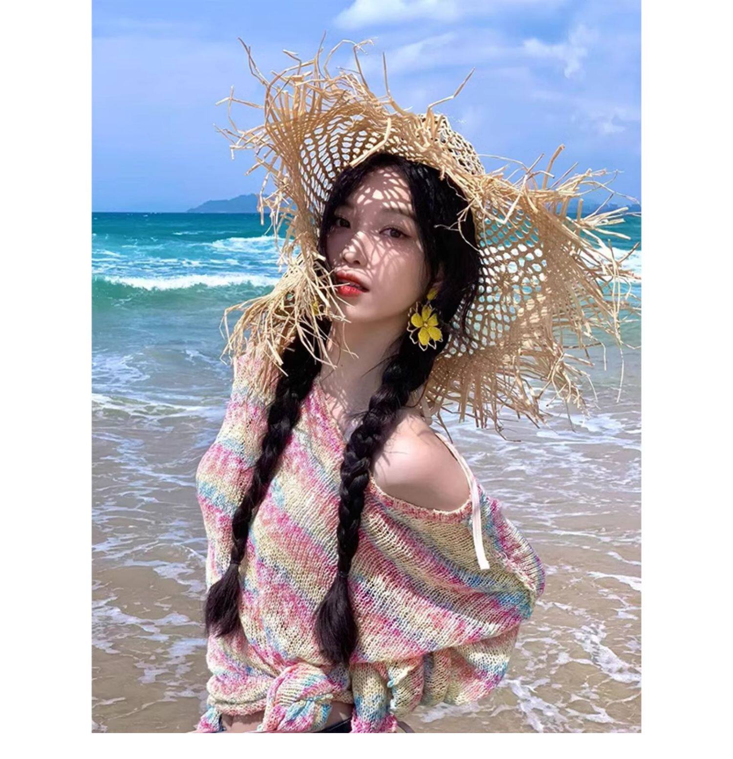 Turn right/陳大腿 彩虹撞色針織T恤女夏季露肩性感寬鬆針織衫ins