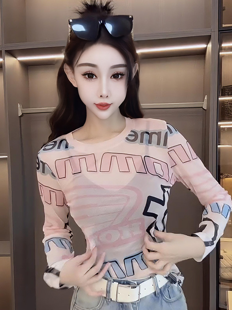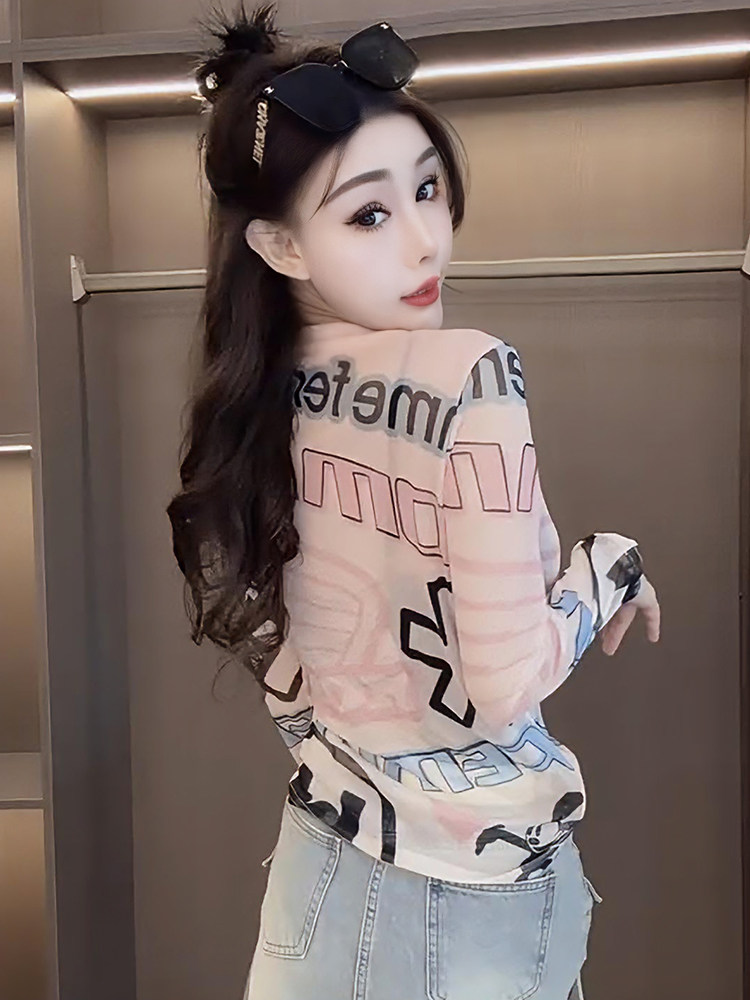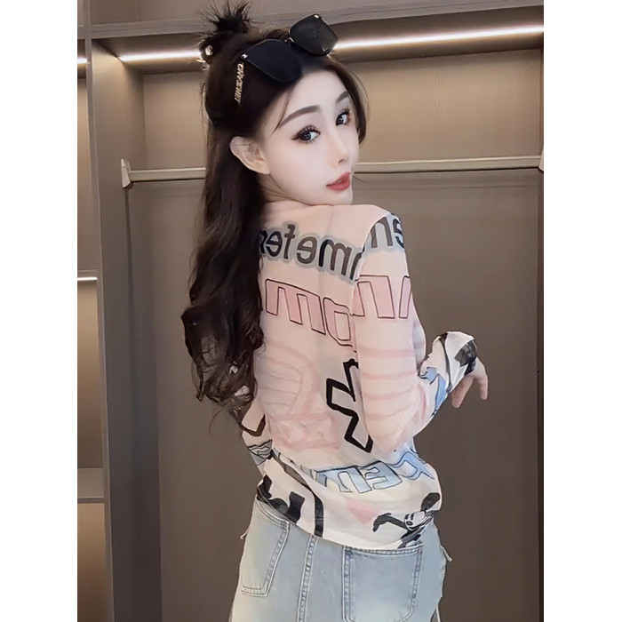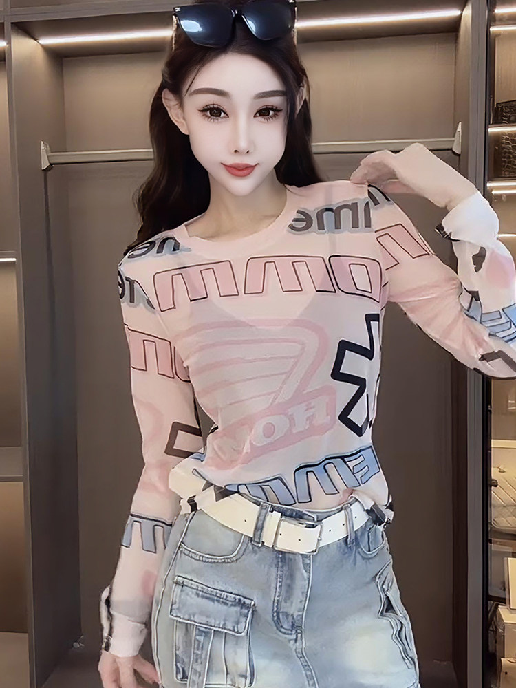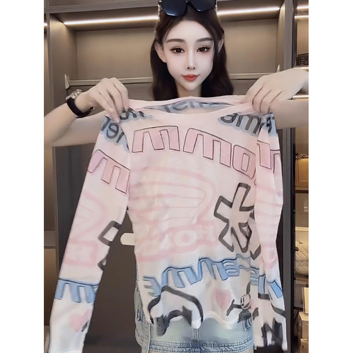 韓版高級感字母冰絲網紗長袖T恤女夏季新款粉色潮牌圓領防曬上衣