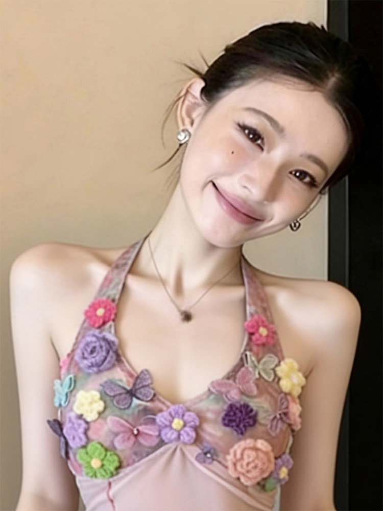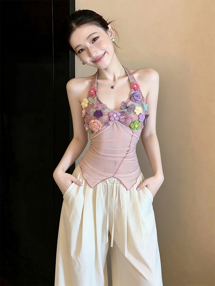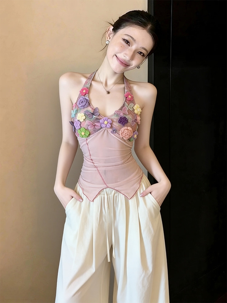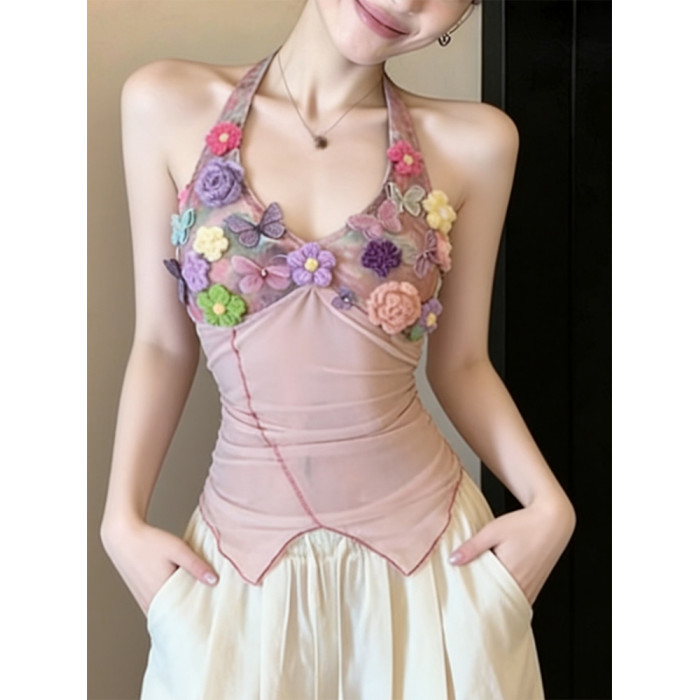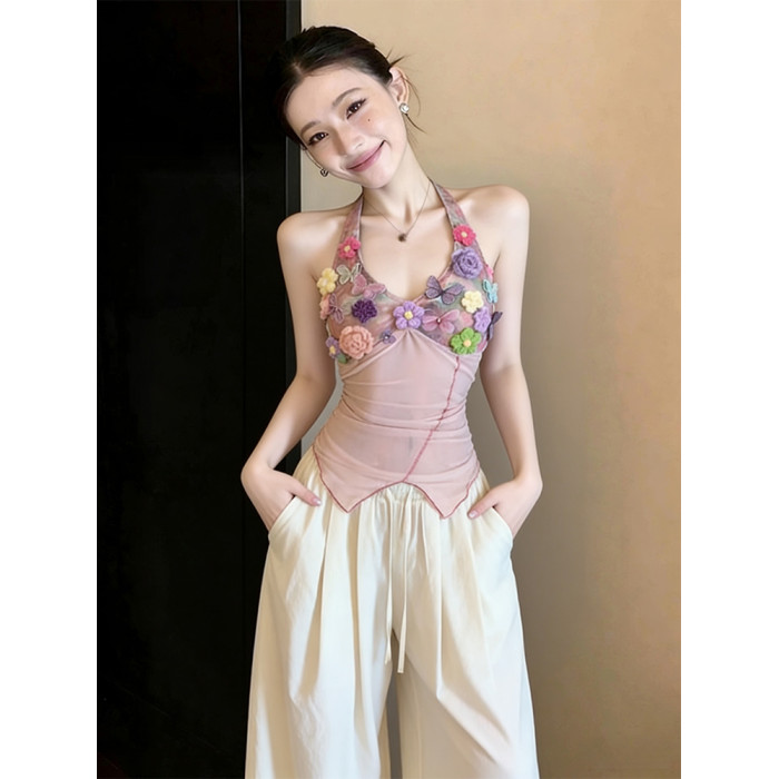 設計感重工立體花朵掛脖背心女裝夏季辣妹別致不規則修身短款上衣