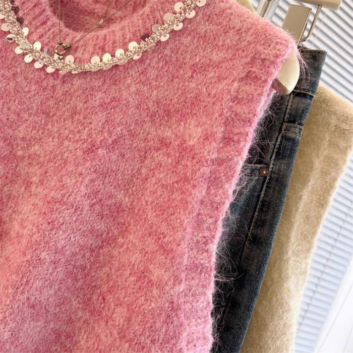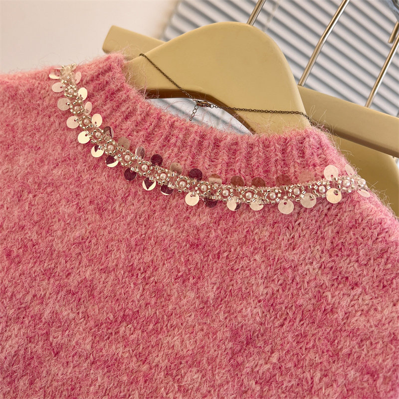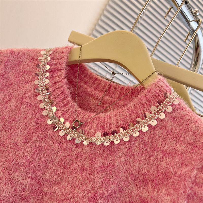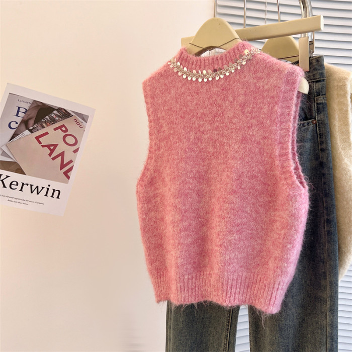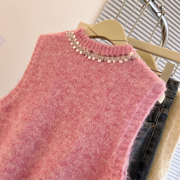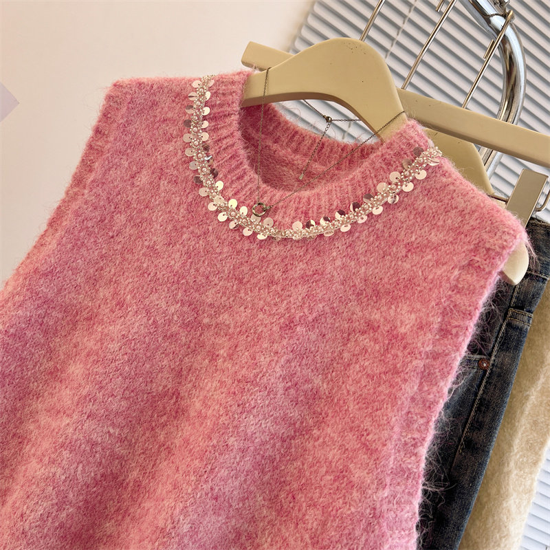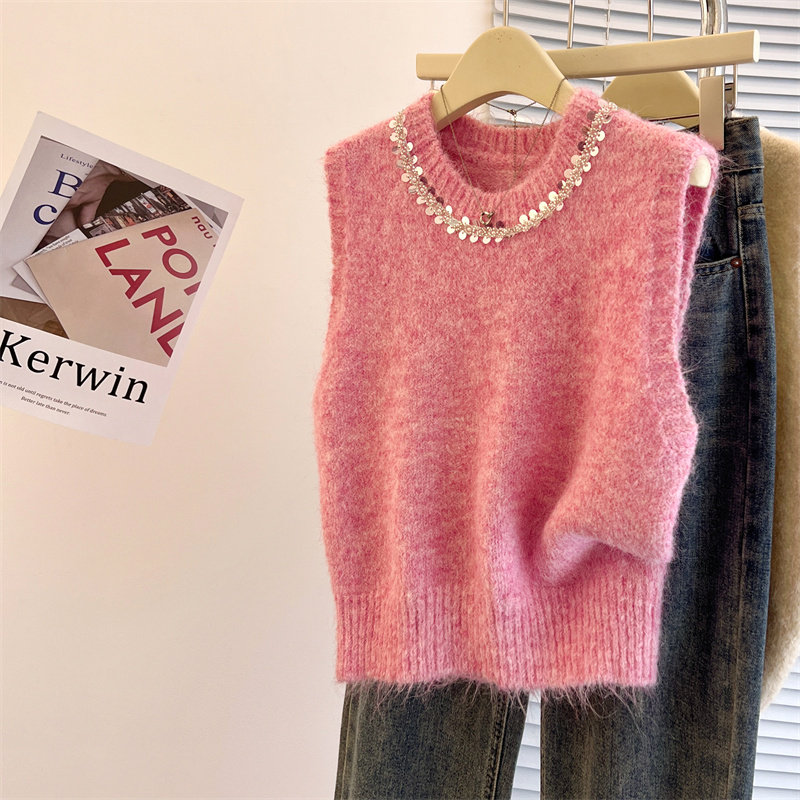 撿漏專櫃撤廻小香風粉色釘珠亮片馬甲背心女早春新款獨特坎肩上衣