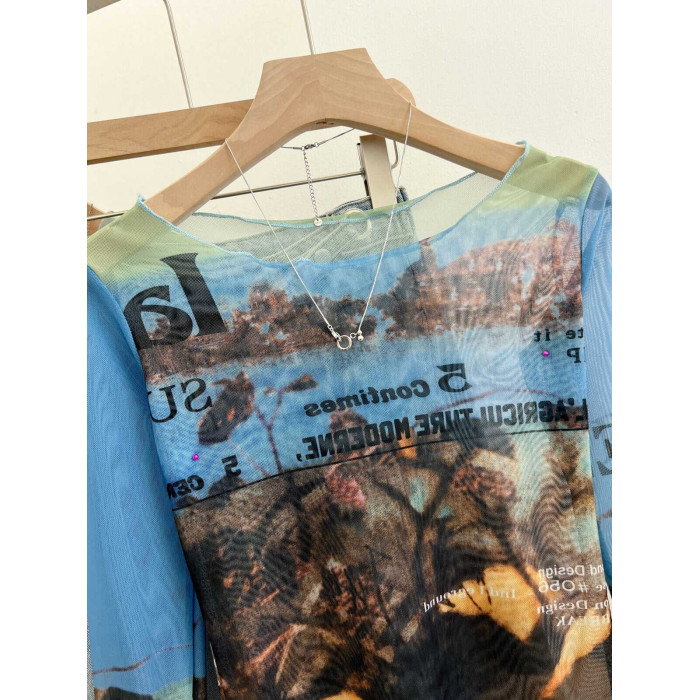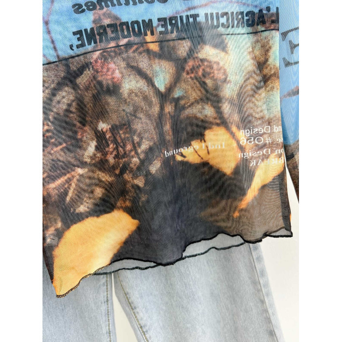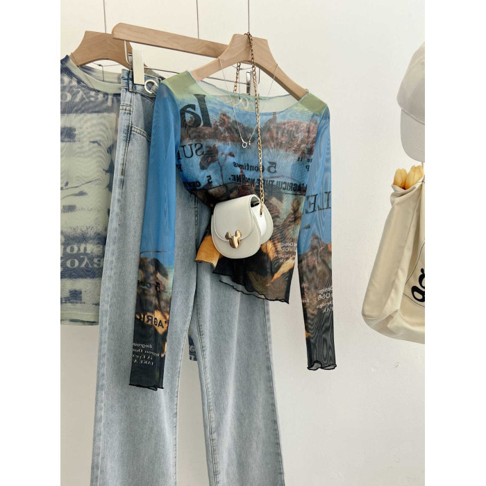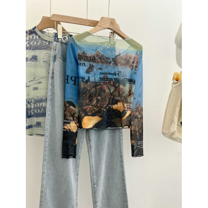 專櫃撤廻剪標美式印花網紗圓領長袖T恤女夏季修身甜酷辣妹防曬衫