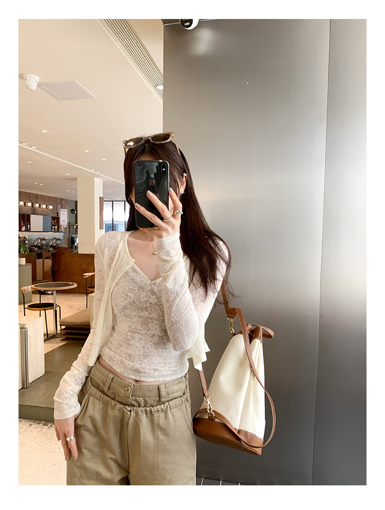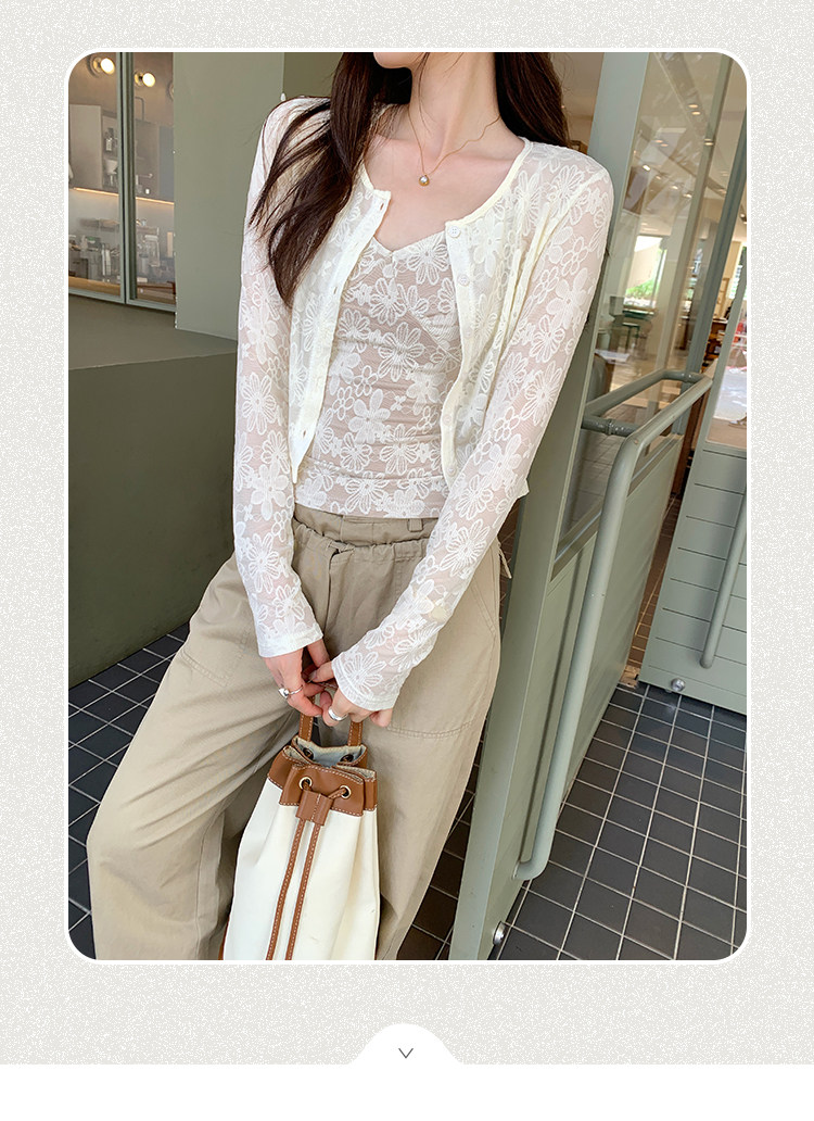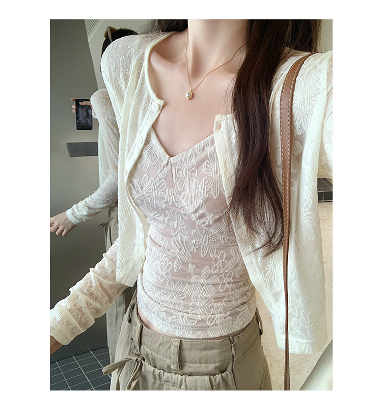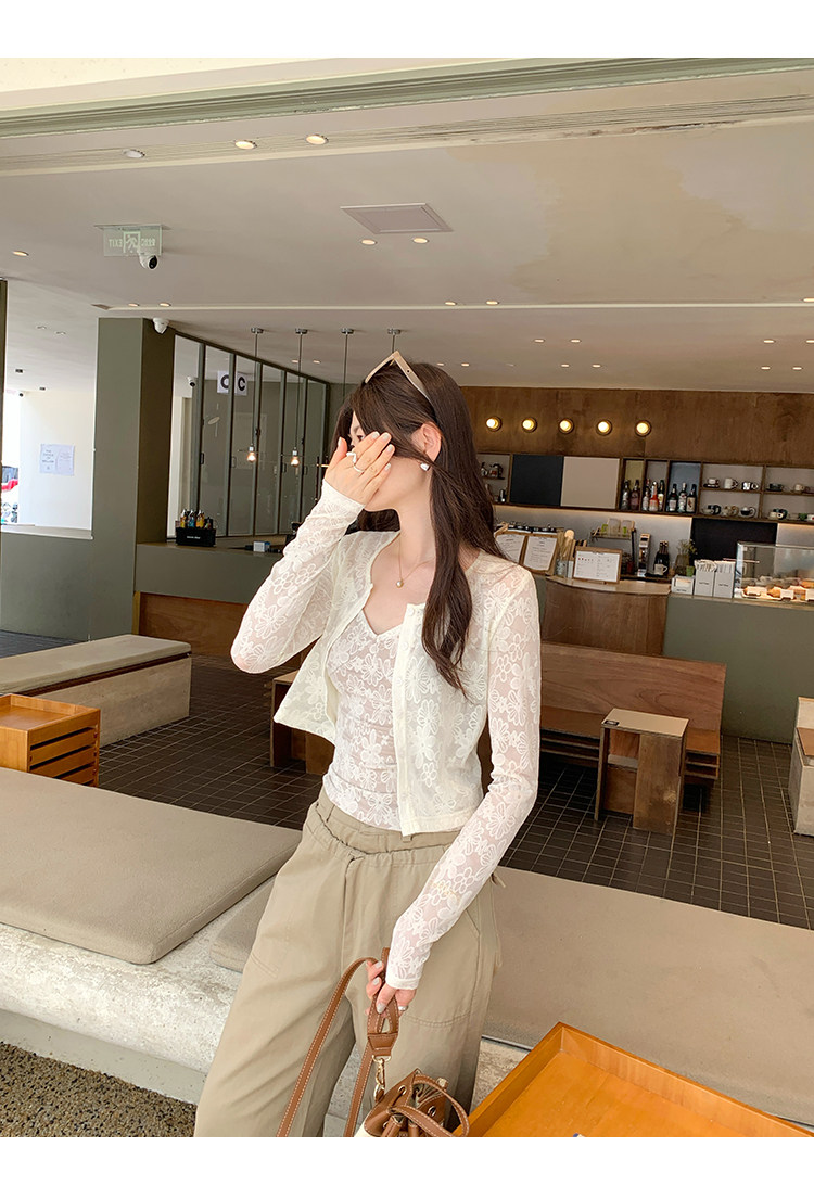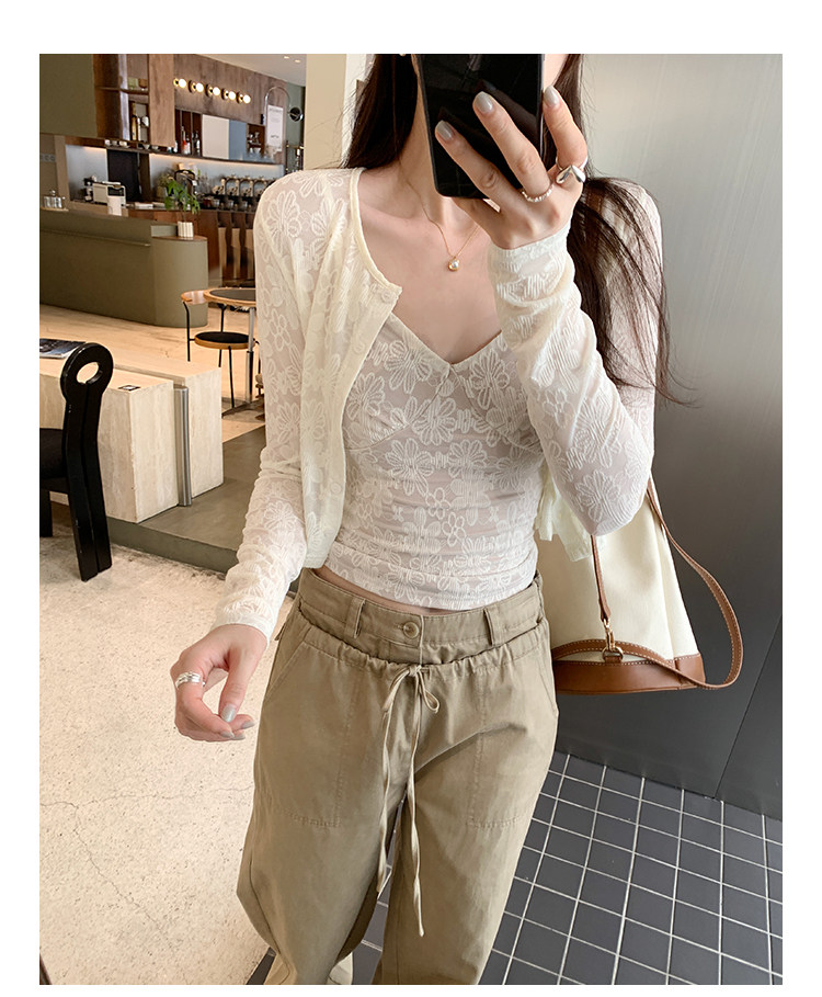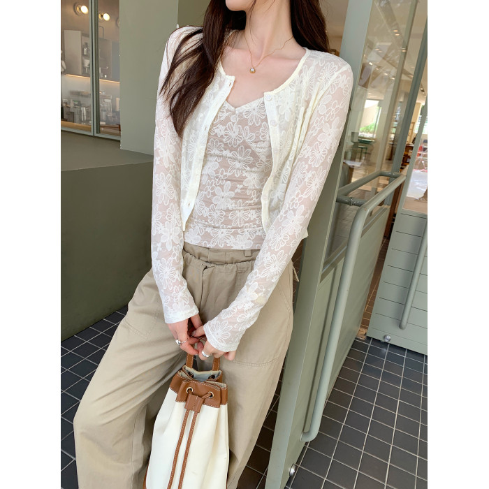 蕾絲吊帶長袖防曬開衫T恤外套兩件套裝女夏季薄款高級感短款上衣