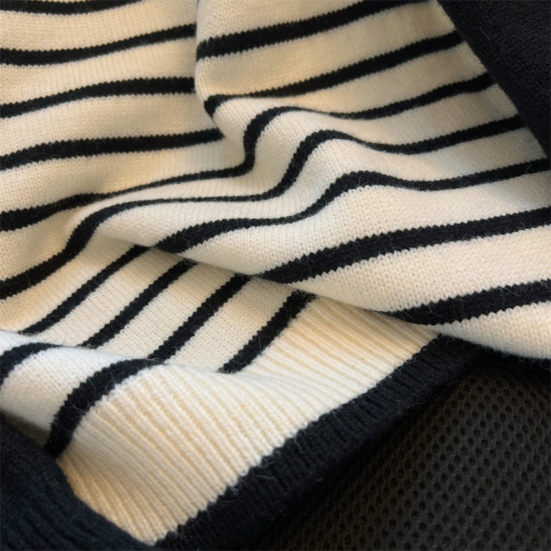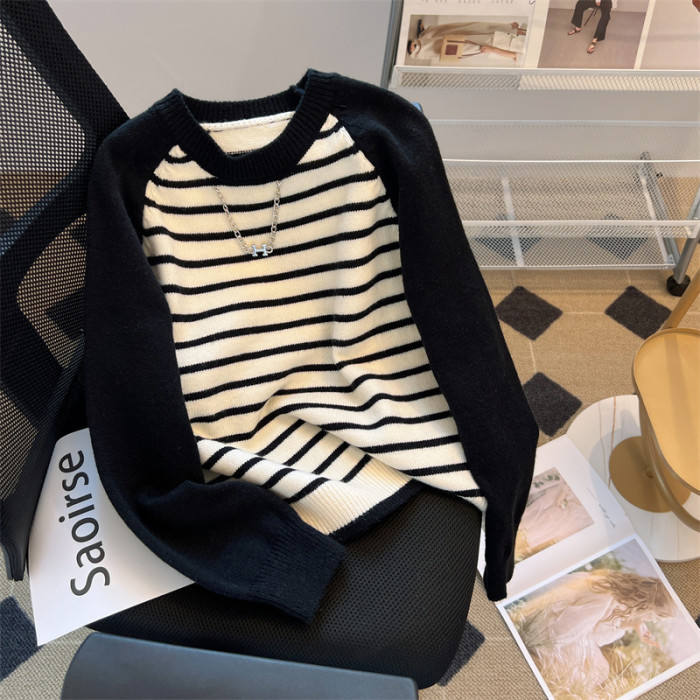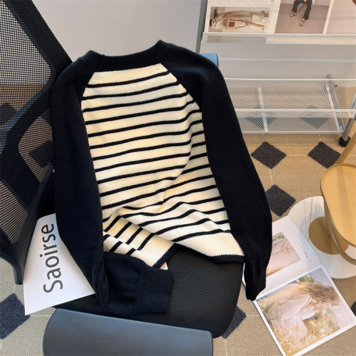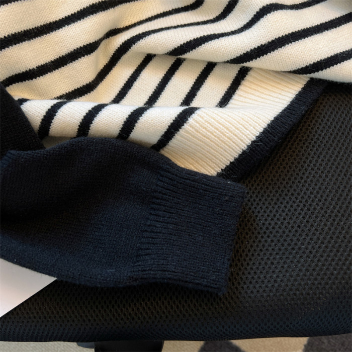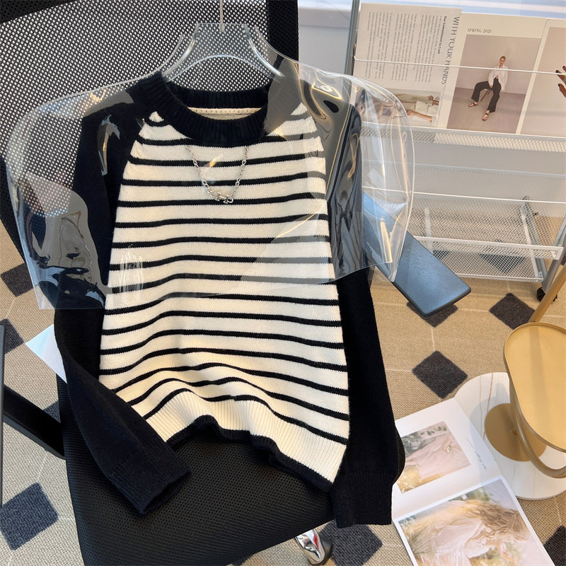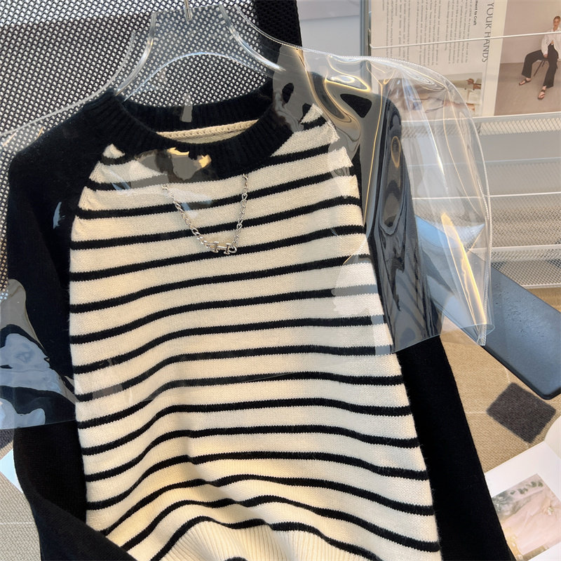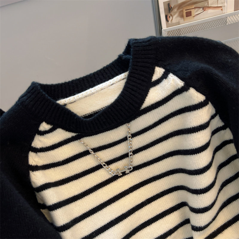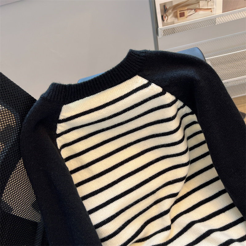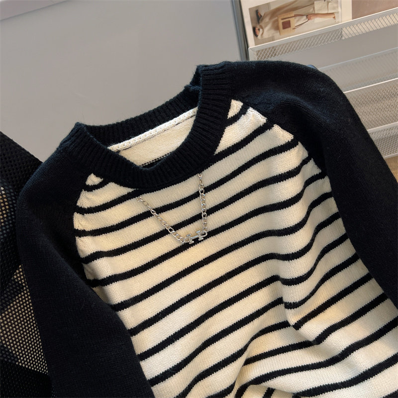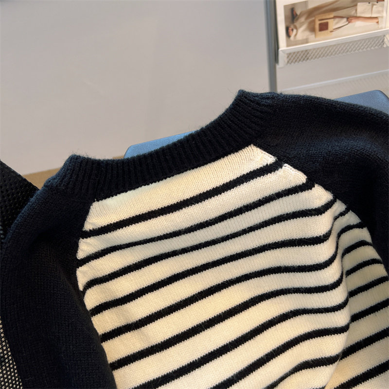 專櫃撤廻!2025春季新款慵懶風條紋圓領毛衣女百搭內搭帶鏈針織衫