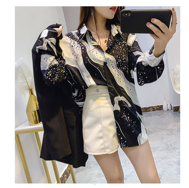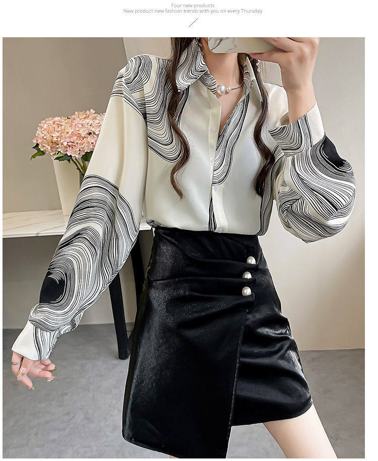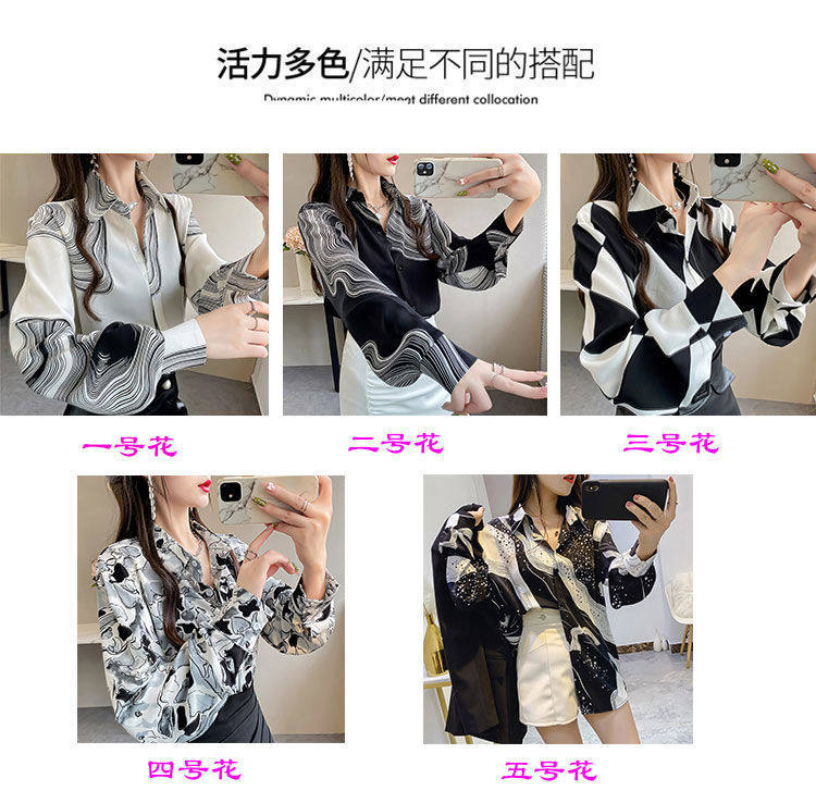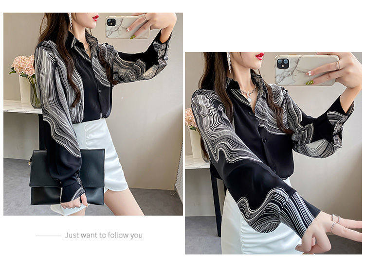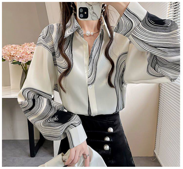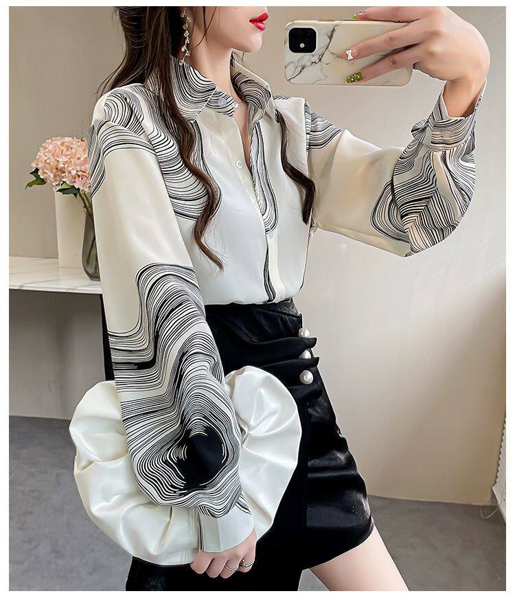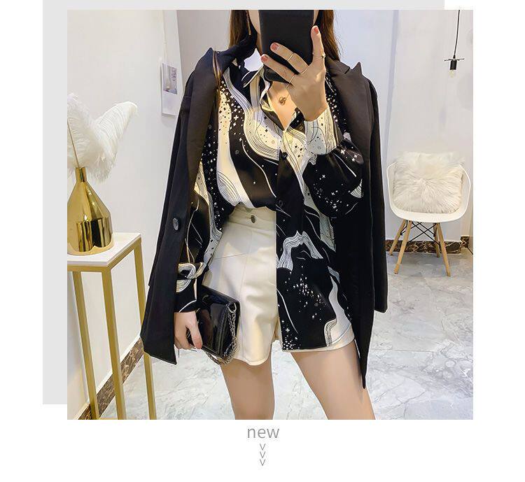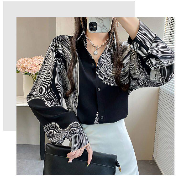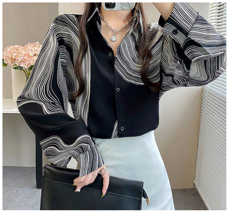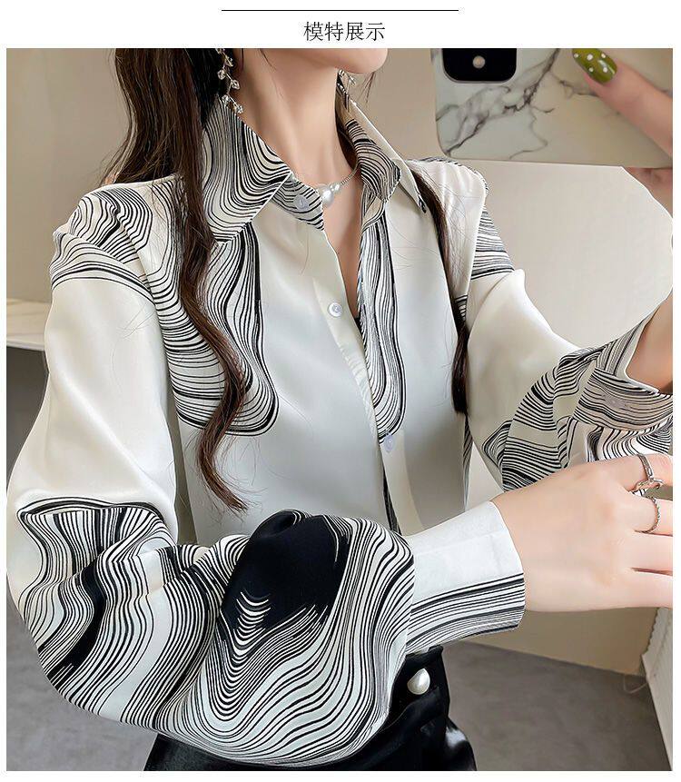長袖上衣設計感女小衆寬鬆百搭印花襯衫女春秋季繙領氣質襯衣女