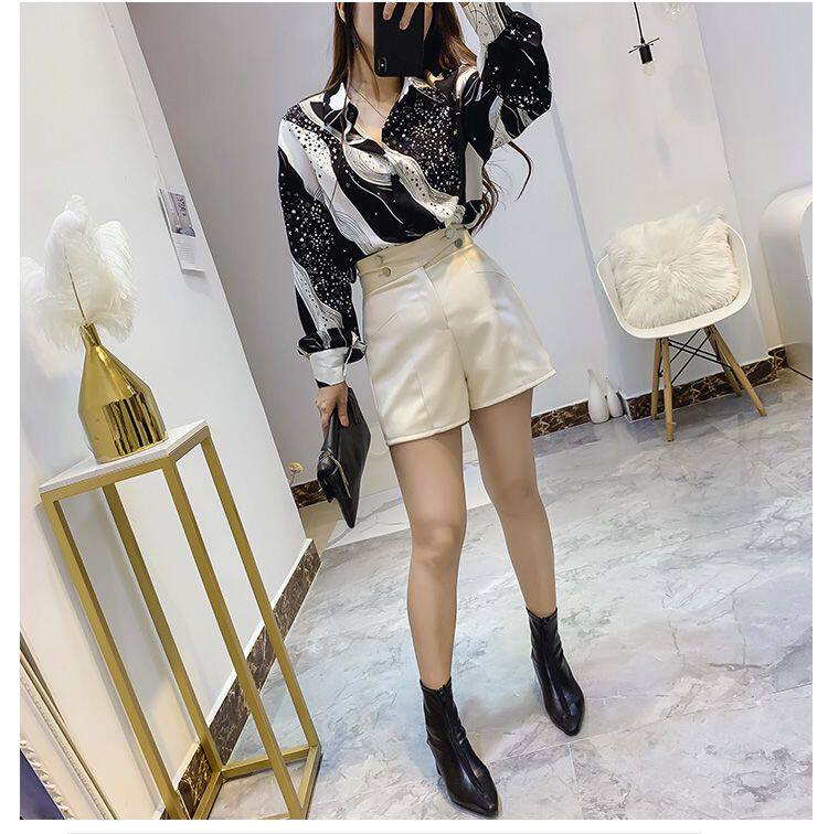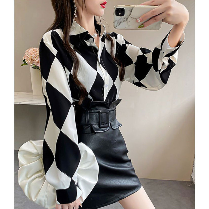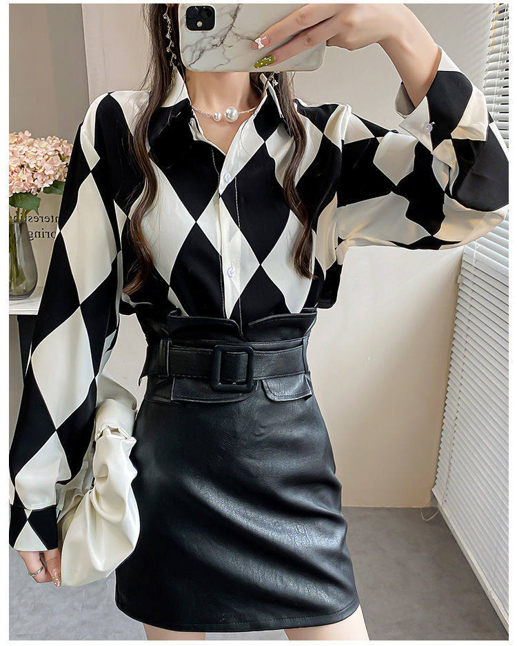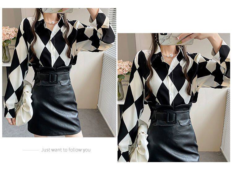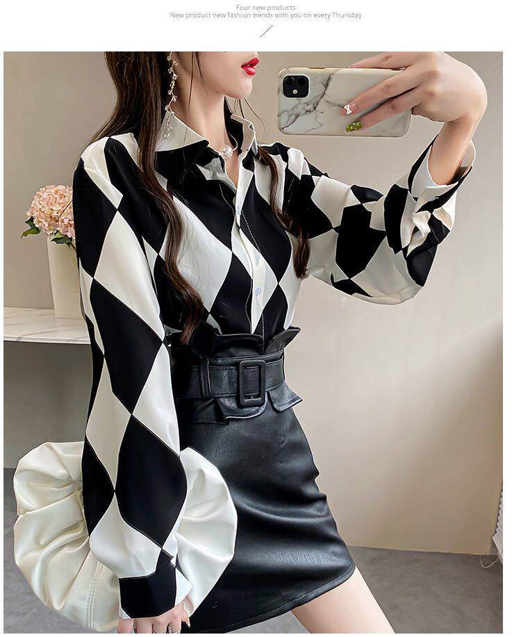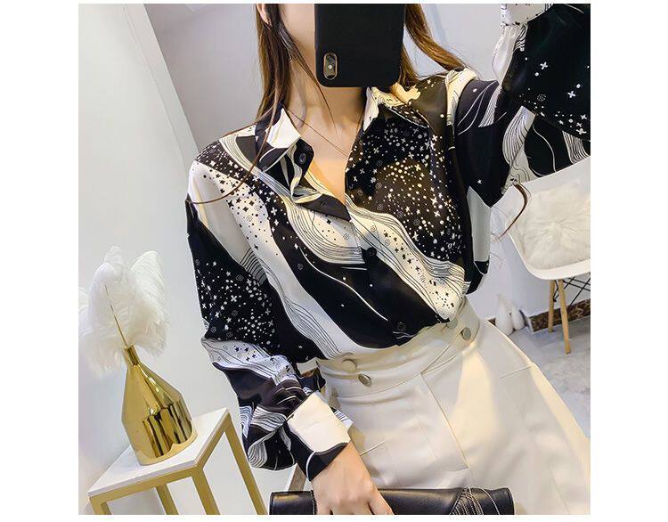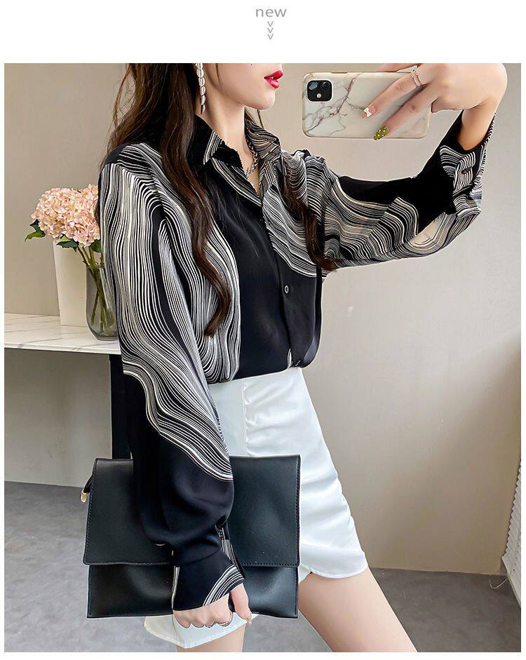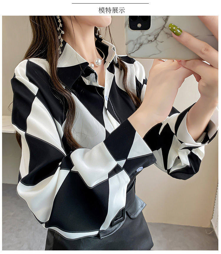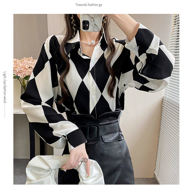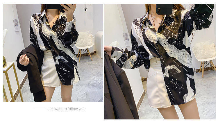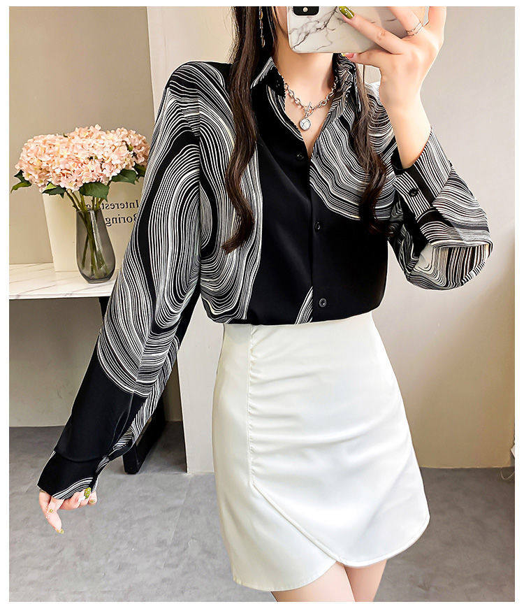長袖上衣設計感女小衆寬鬆百搭印花襯衫女春秋季繙領氣質襯衣女