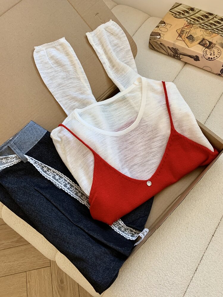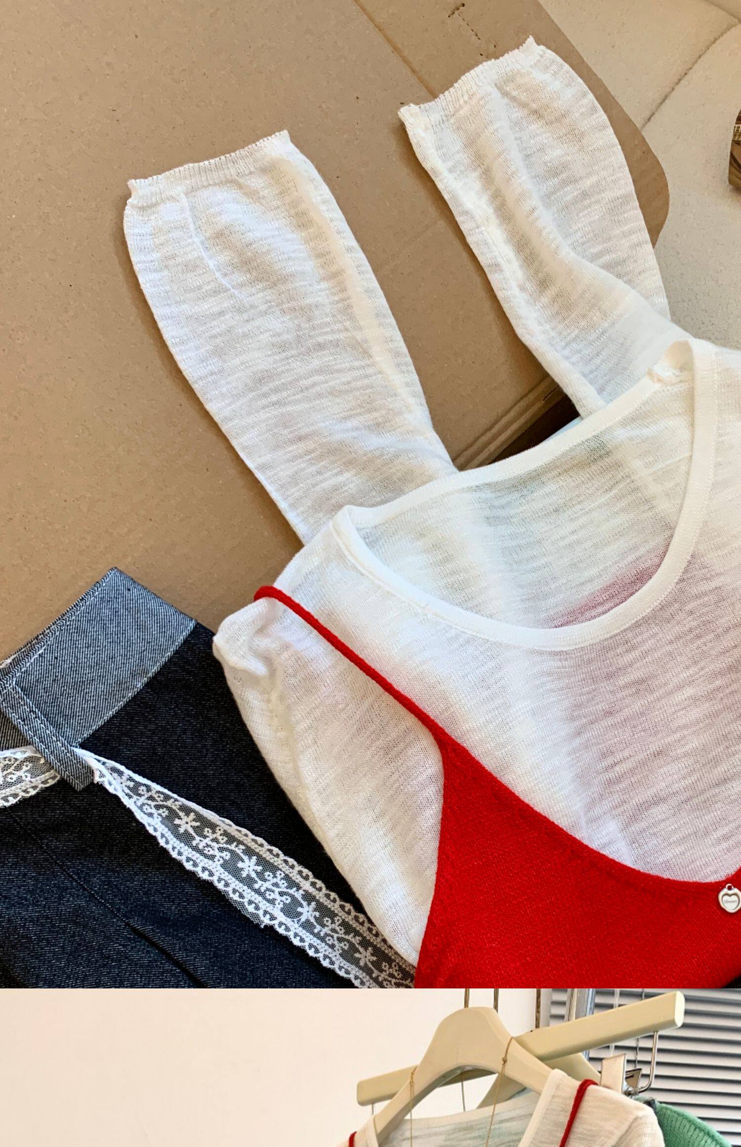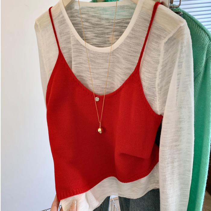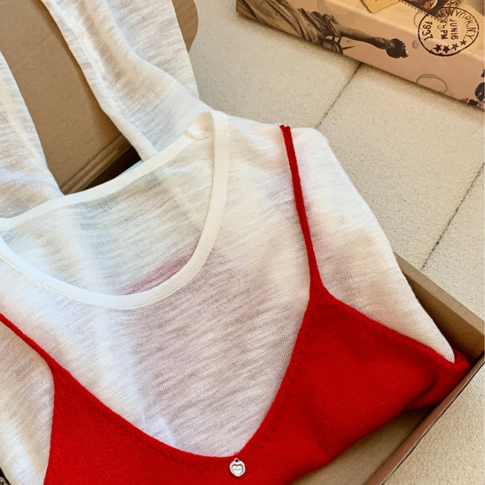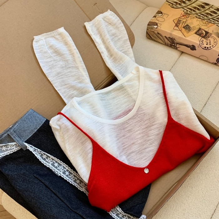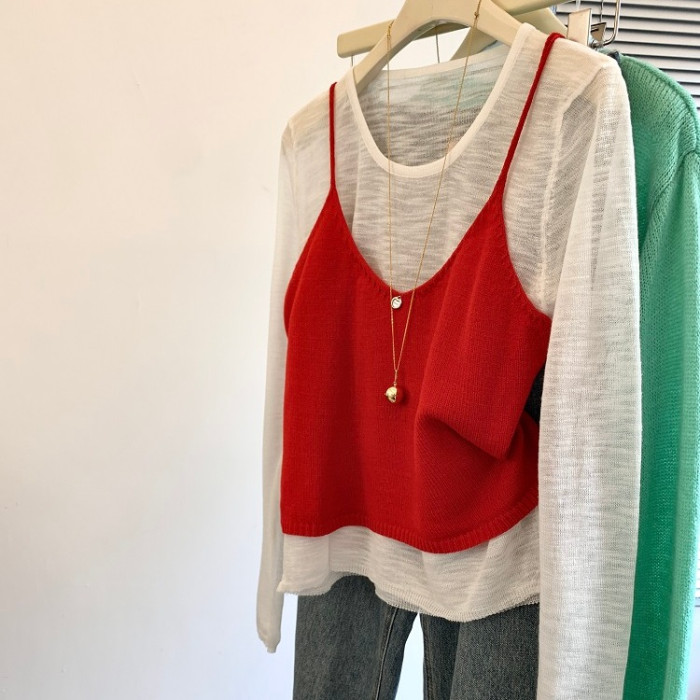 專櫃撤廻剪標韓系圓領薄款長袖T恤女夏季新款針織吊帶曡穿兩件套