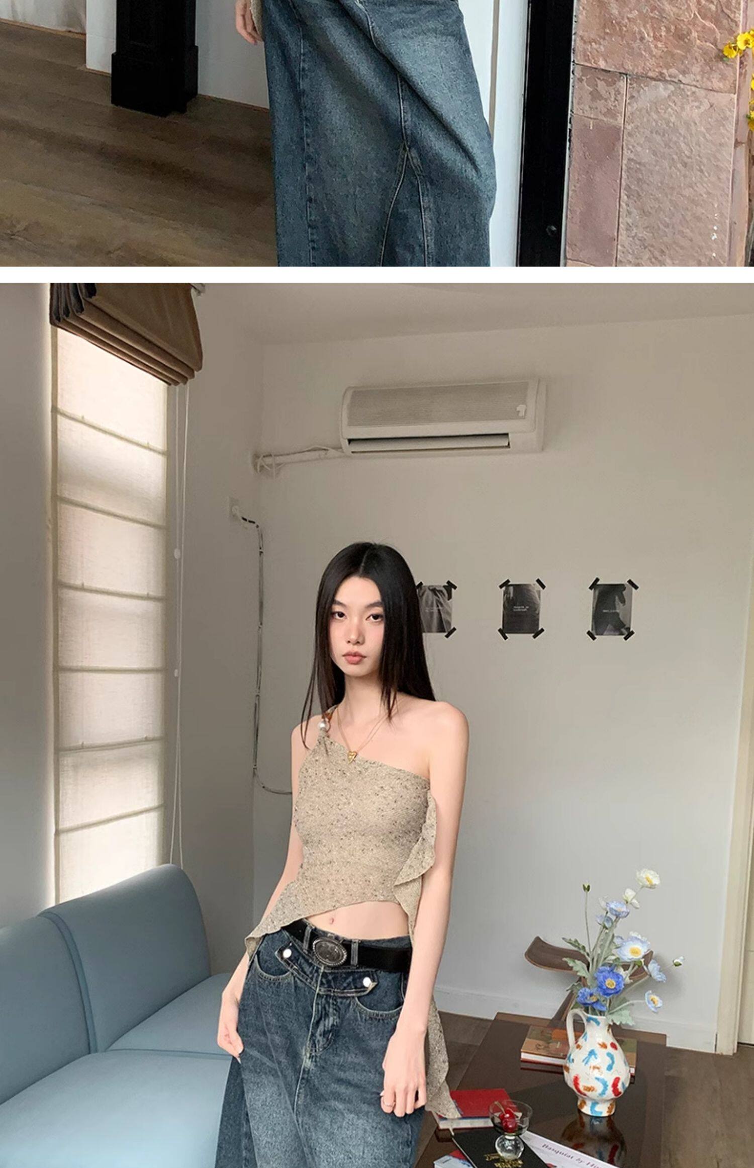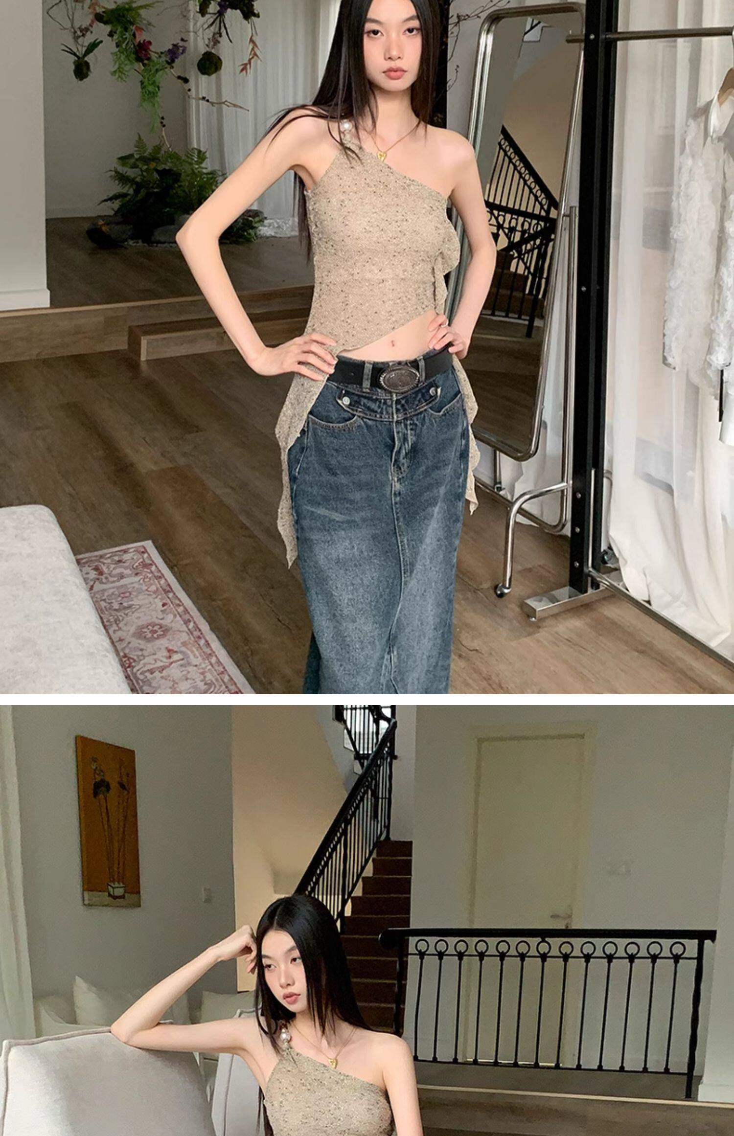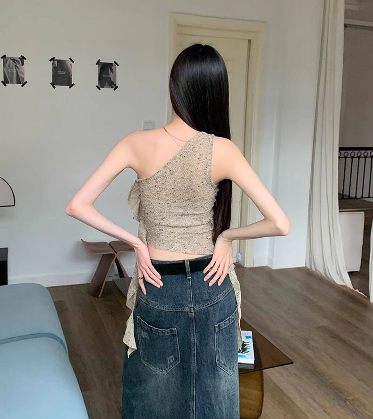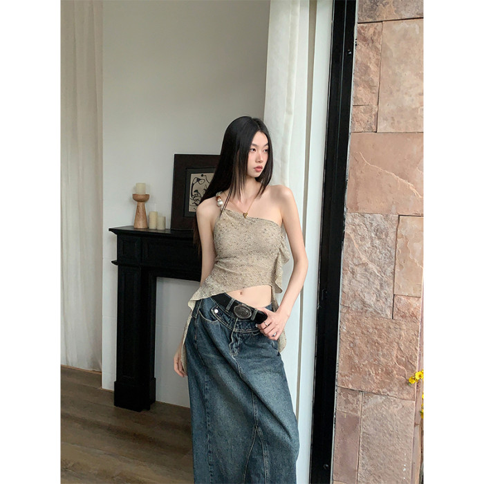 BaiYaShan/白婭衫 性感辣妹不對稱斜肩背心女夏季修身飄帶上衣ins