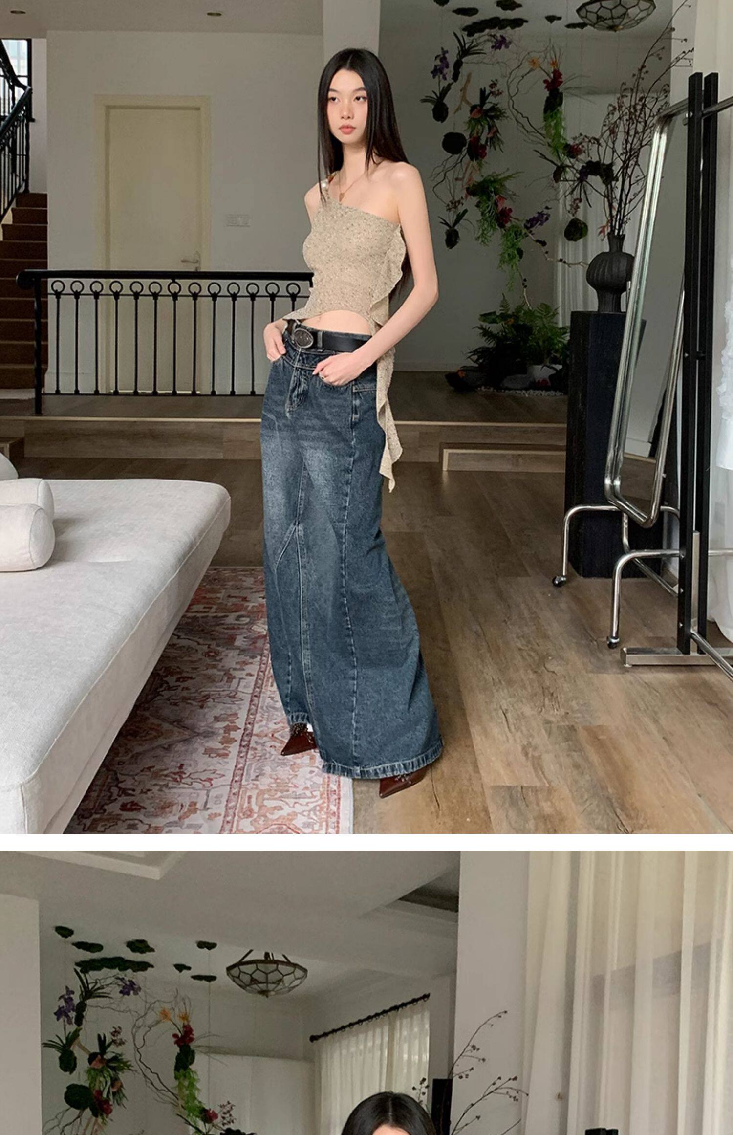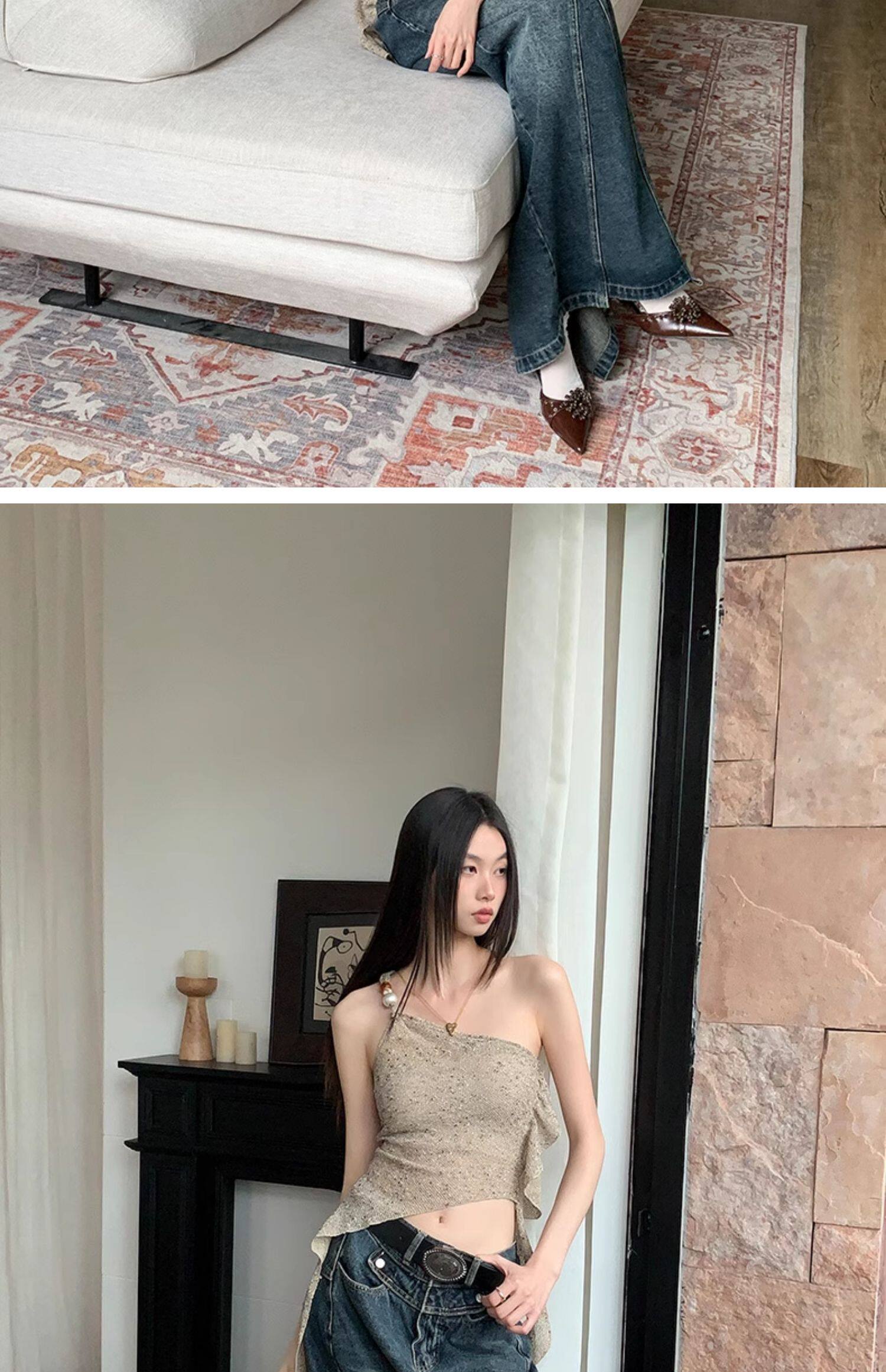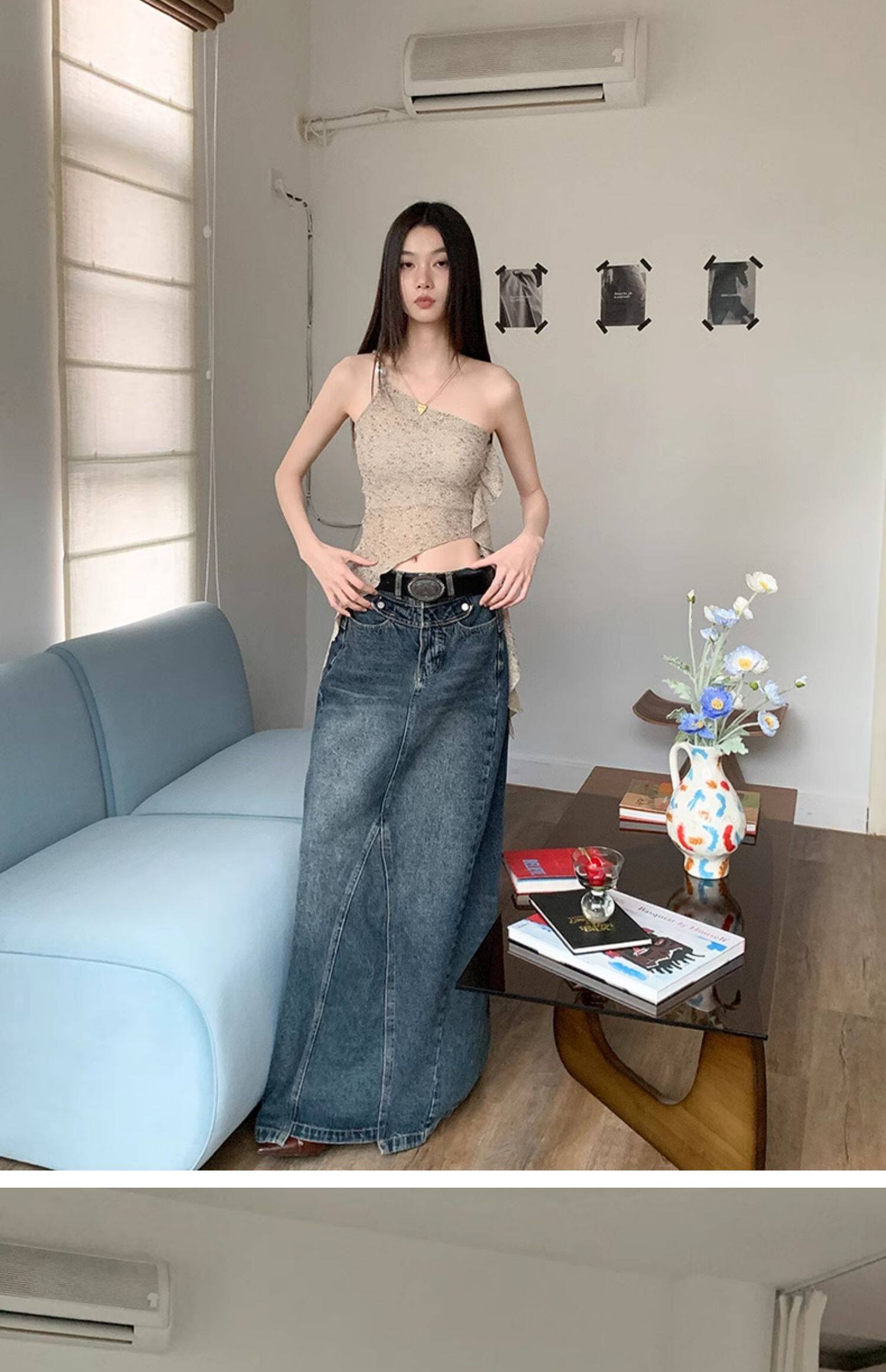 BaiYaShan/白婭衫 性感辣妹不對稱斜肩背心女夏季修身飄帶上衣ins