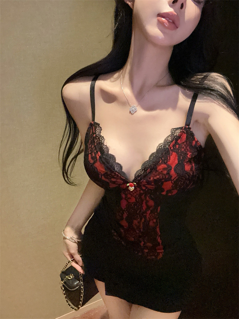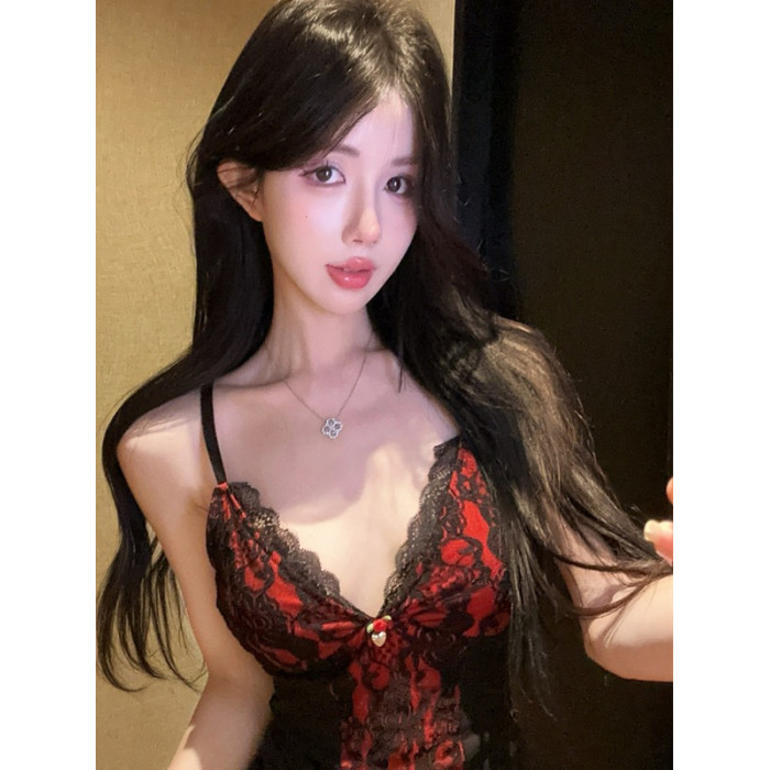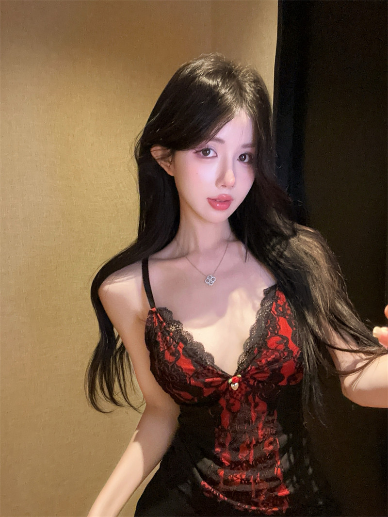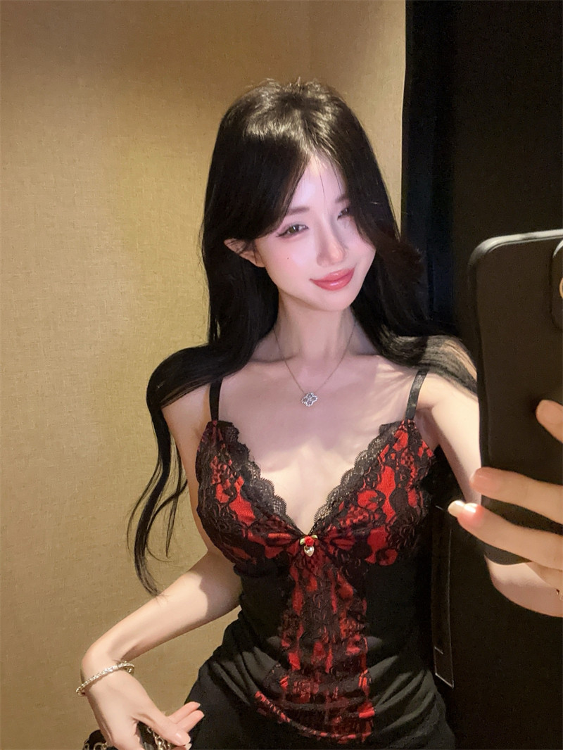 法式赫本風撞色蕾絲V領吊帶背心女時髦高級感熱辣玫瑰花修身上衣