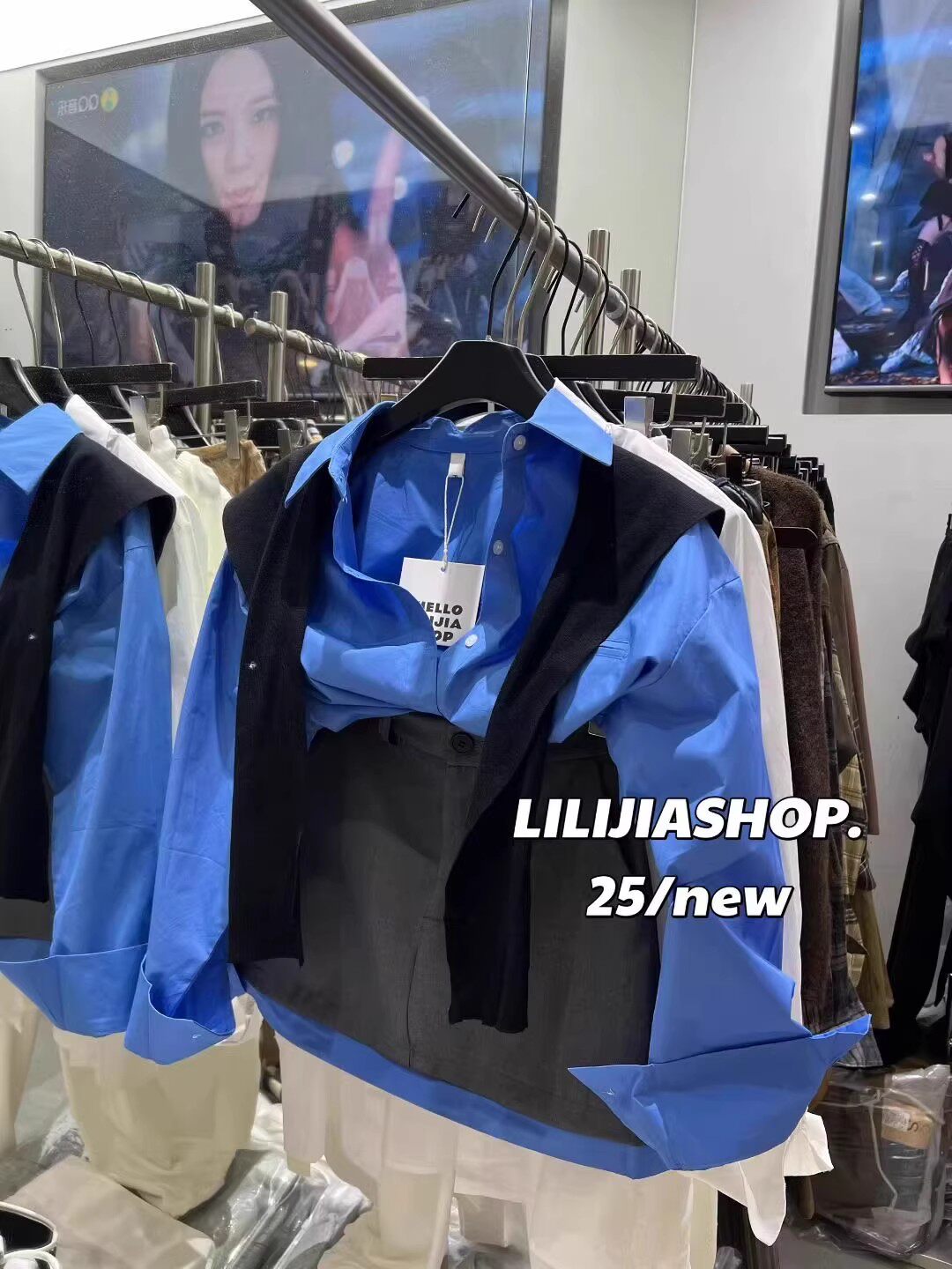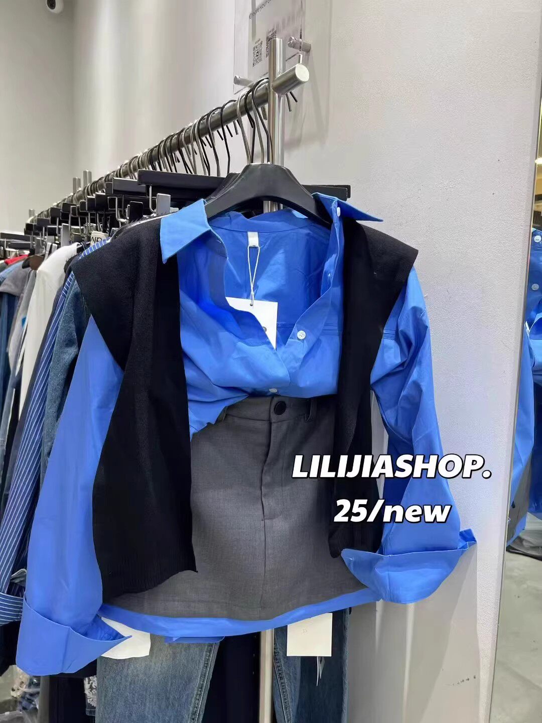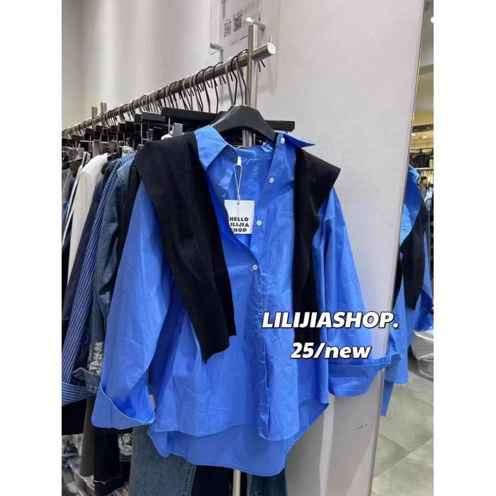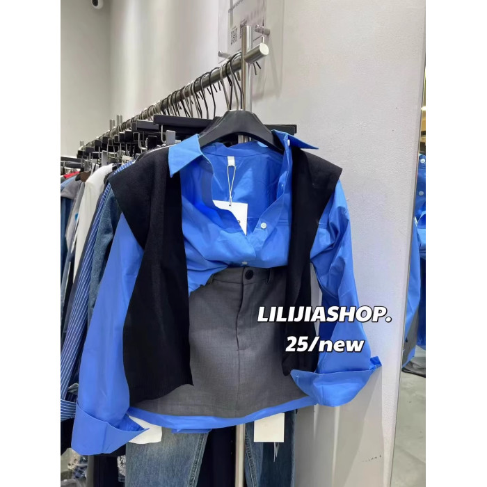 韓國東大門秋季新款高級感氣質藍色長袖襯衫+針織披肩兩件套上衣