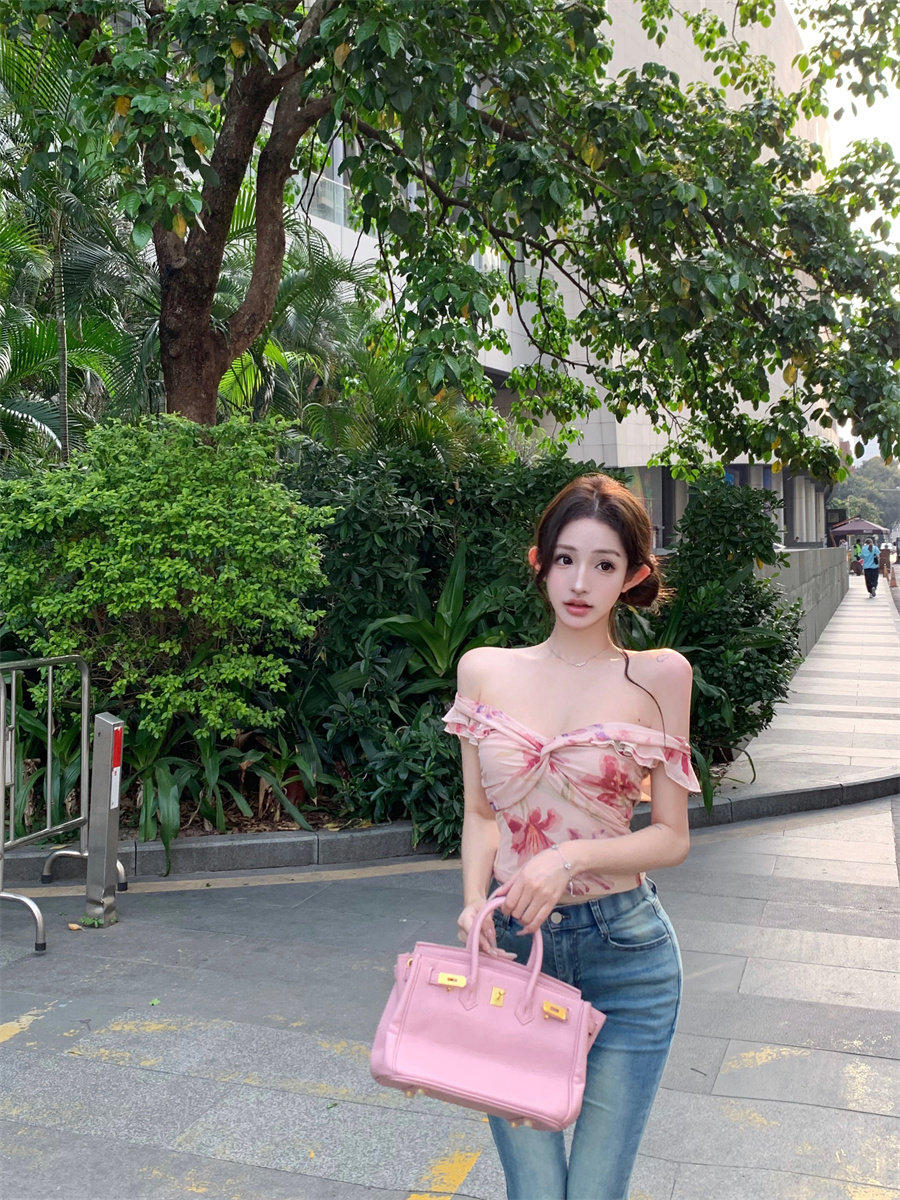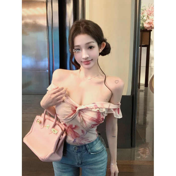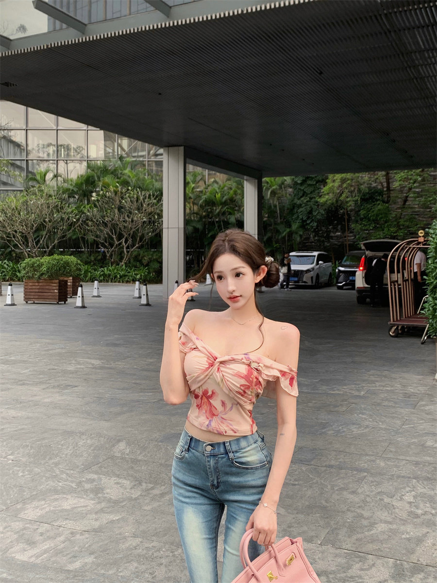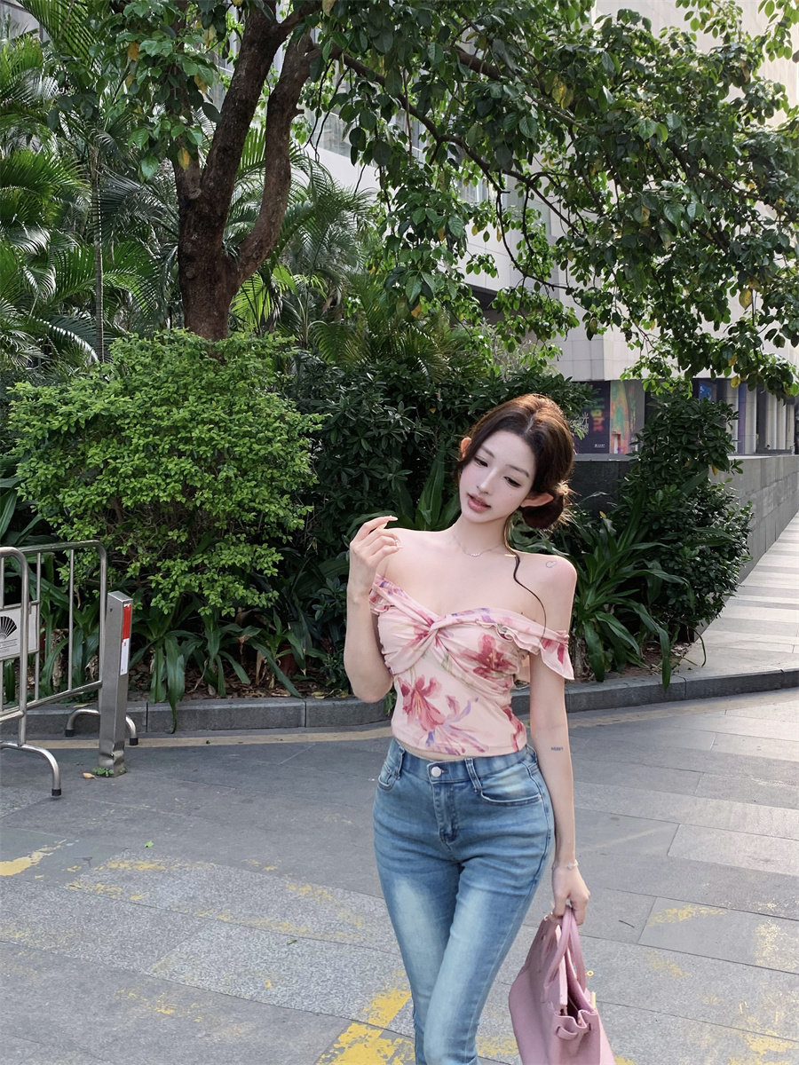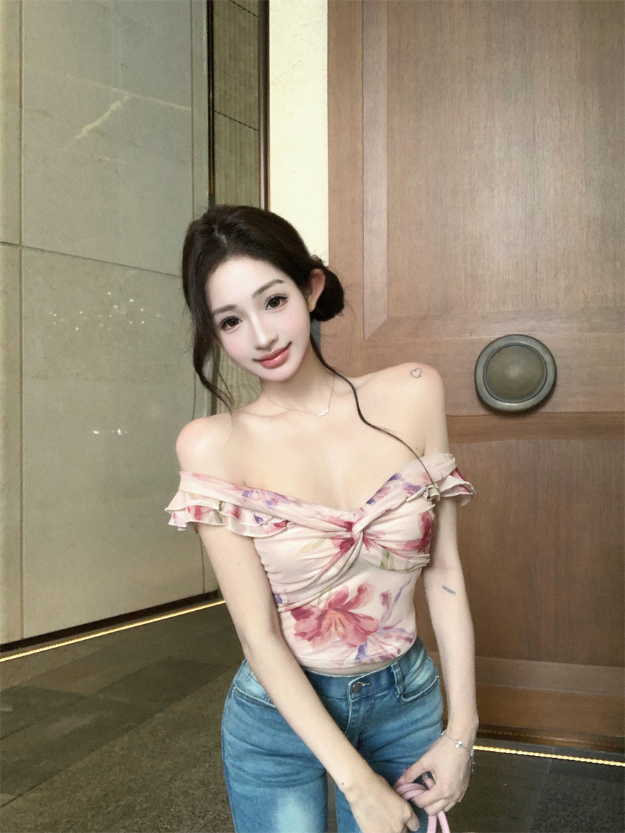 V領露肩印花T恤氣質設計感修身扭結荷葉邊短款上衣