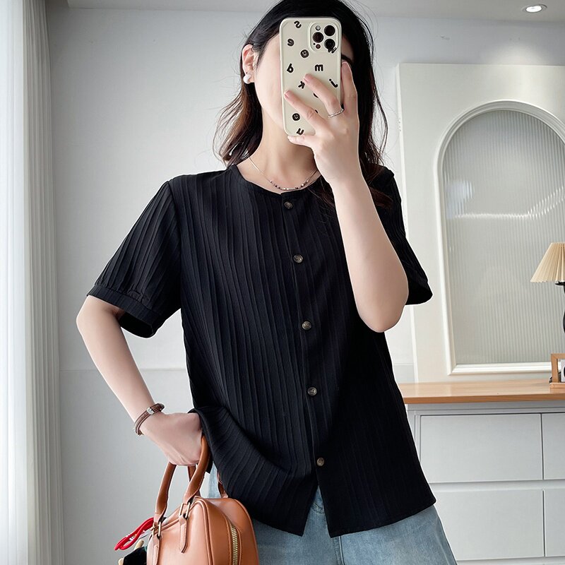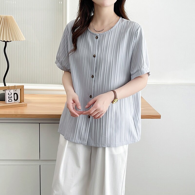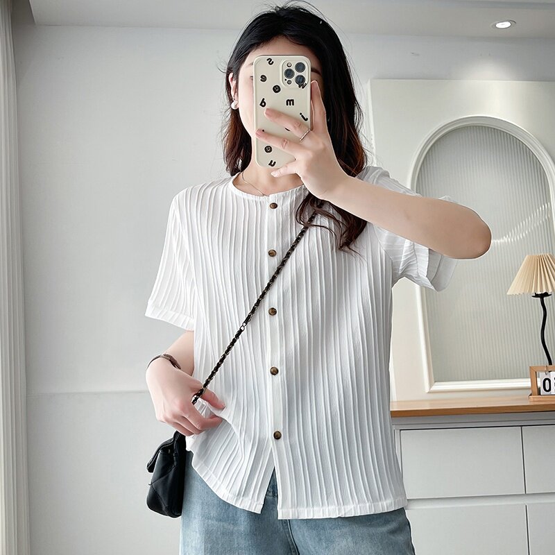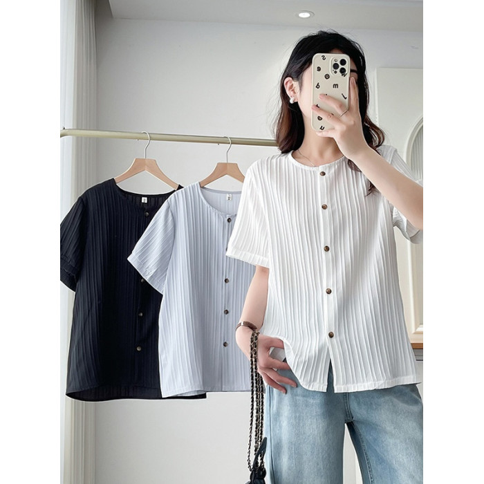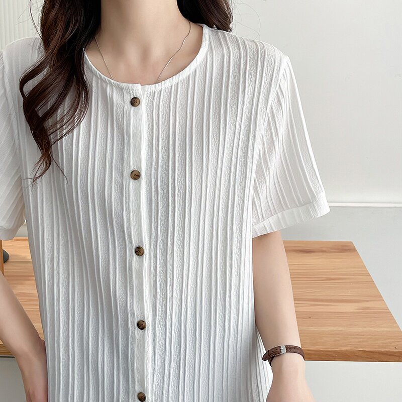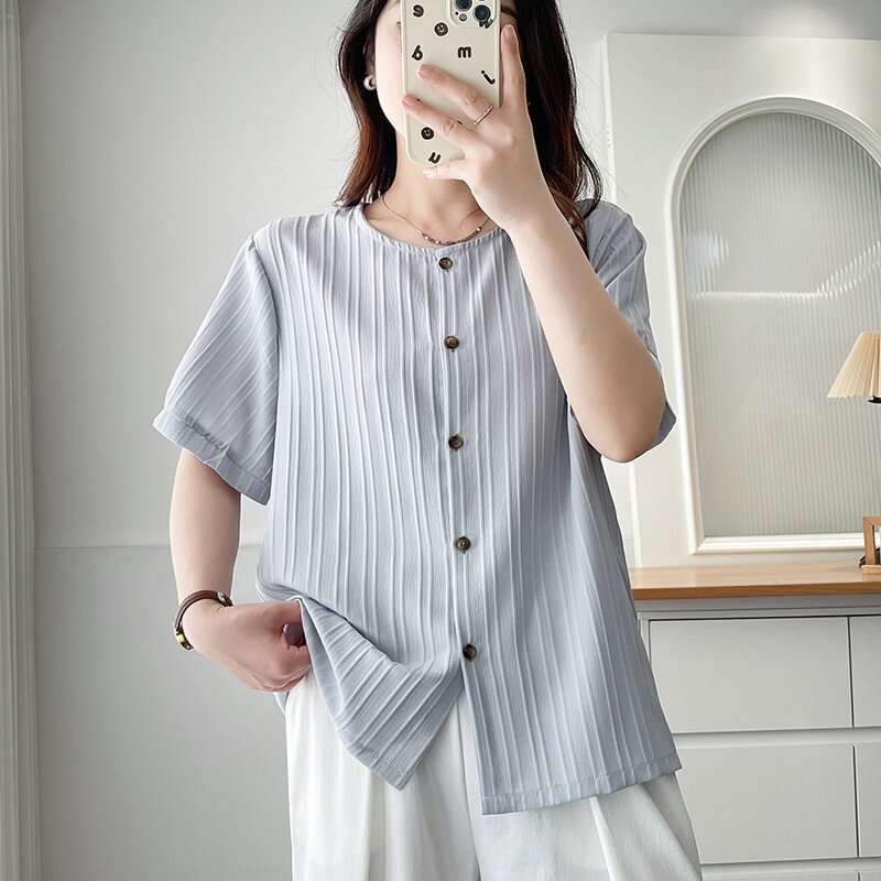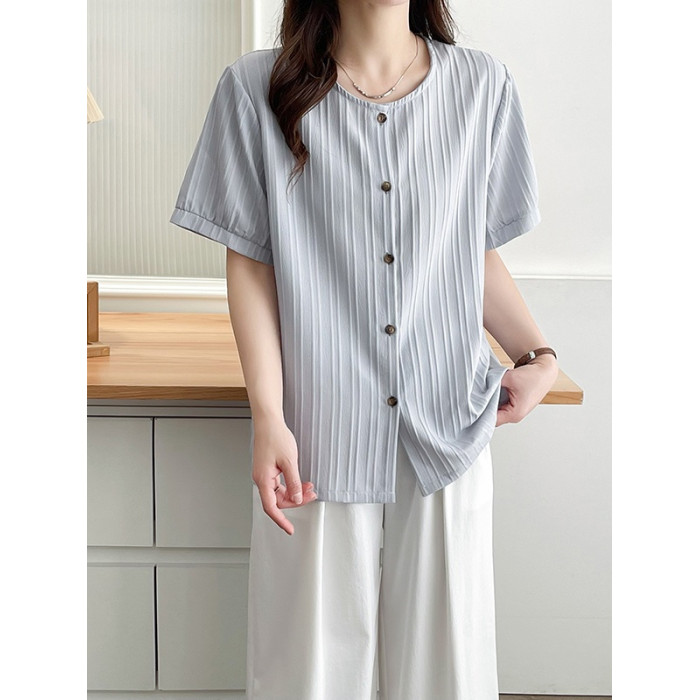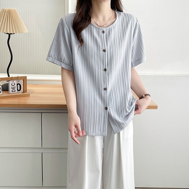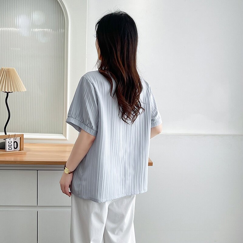 夏裝韓版新款休閒上衣設計感圓領洋氣減齡海浪條短袖大碼文藝襯衫