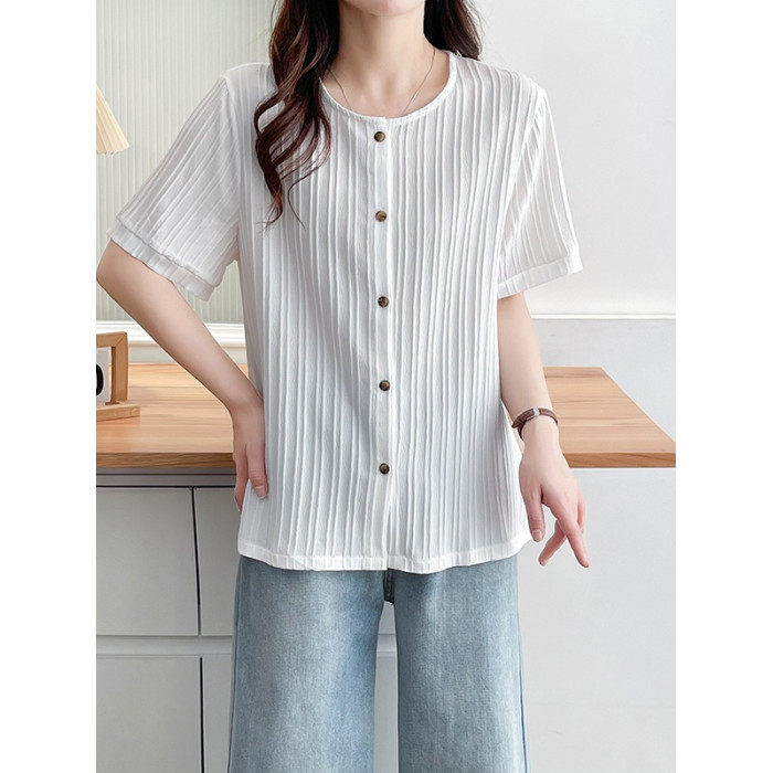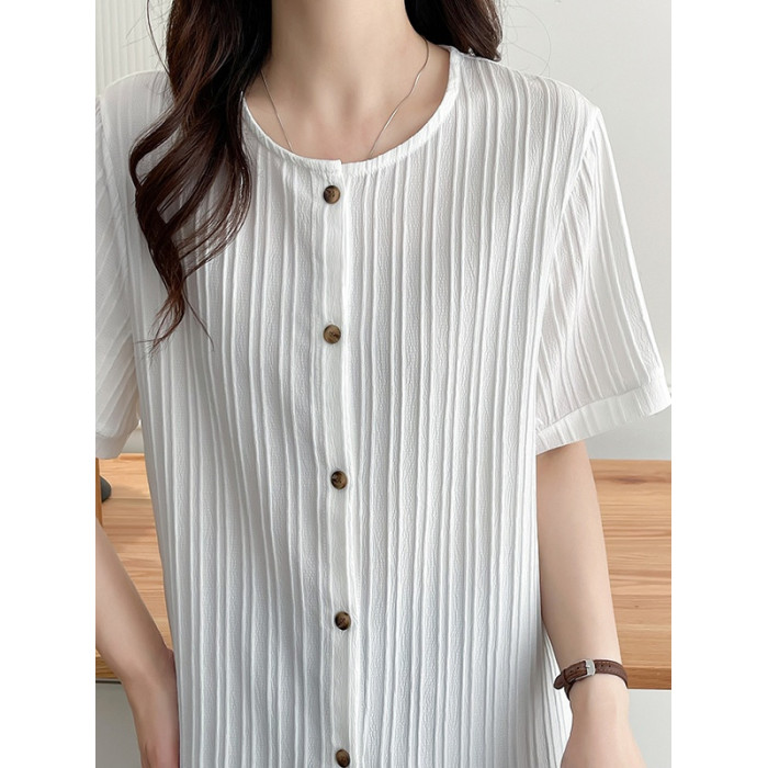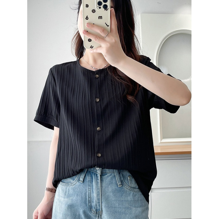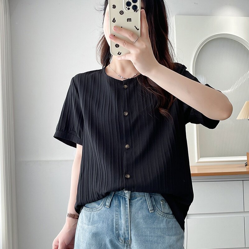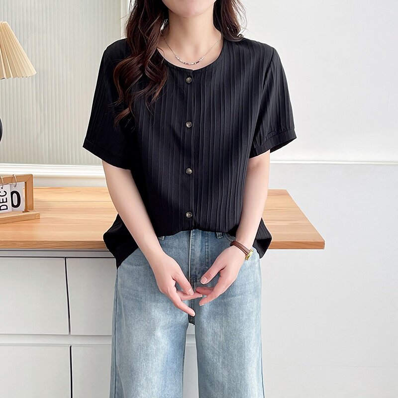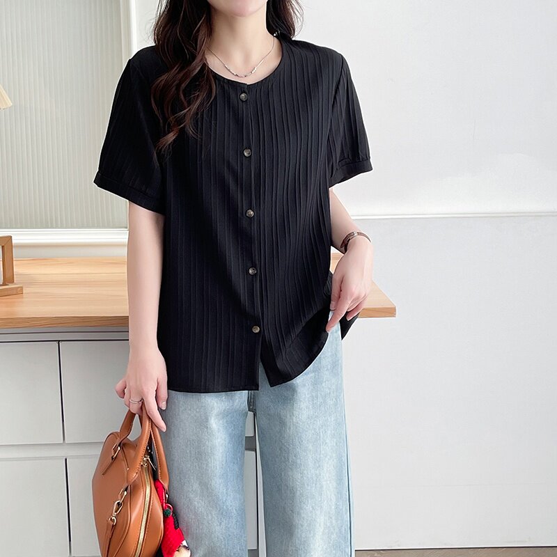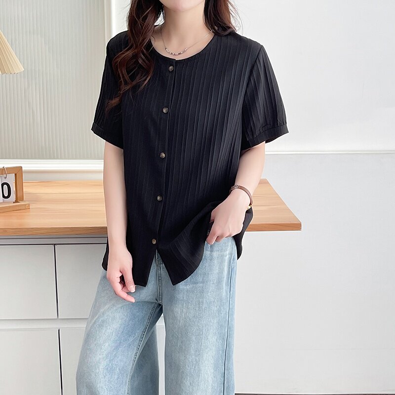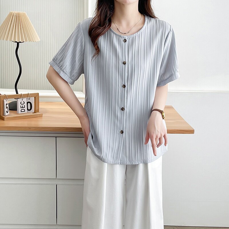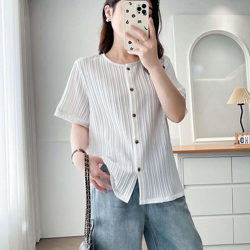 夏裝韓版新款休閒上衣設計感圓領洋氣減齡海浪條短袖大碼文藝襯衫