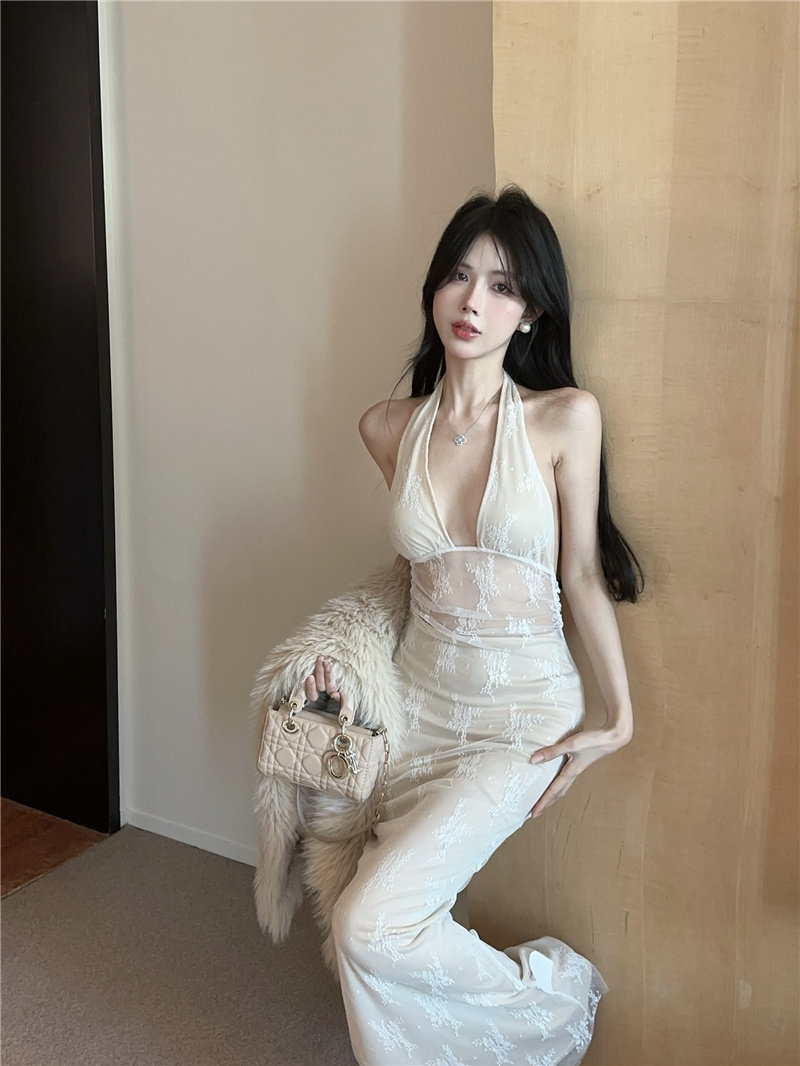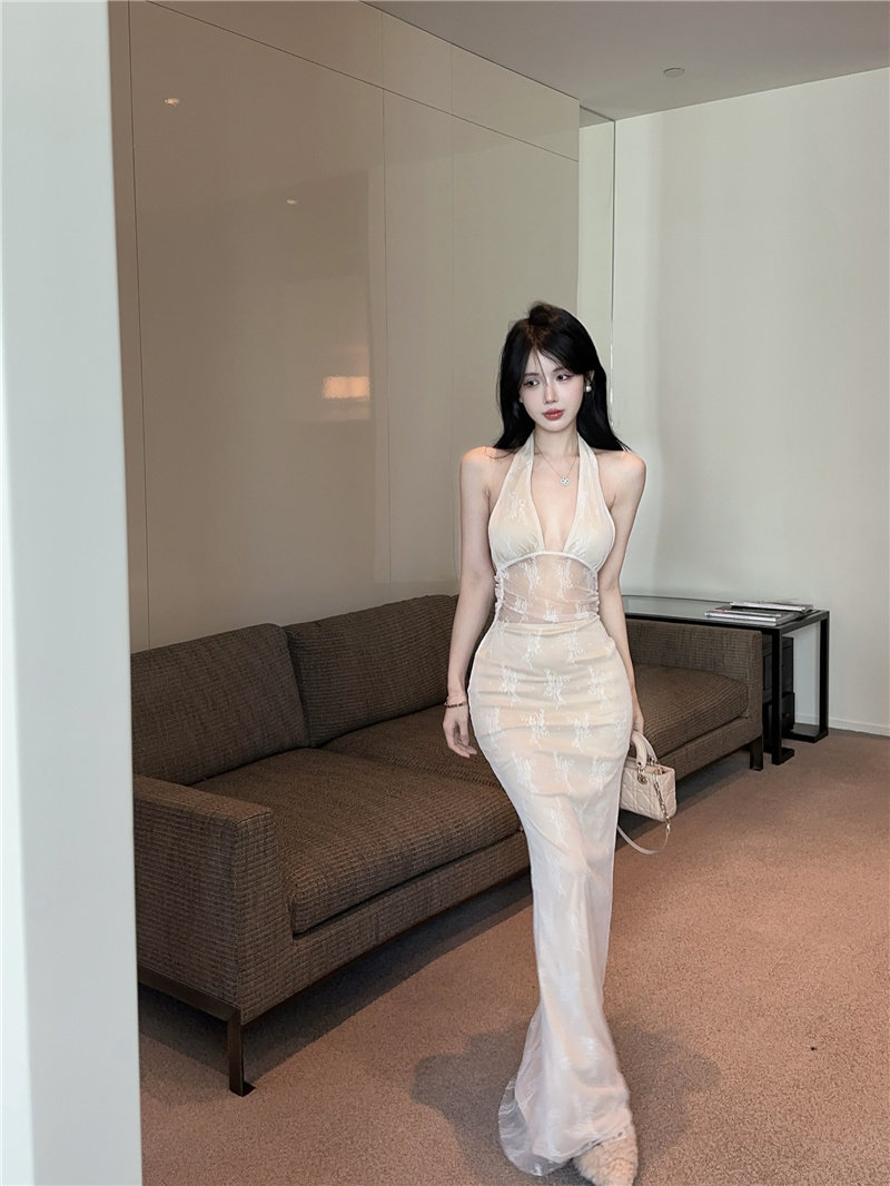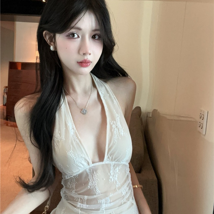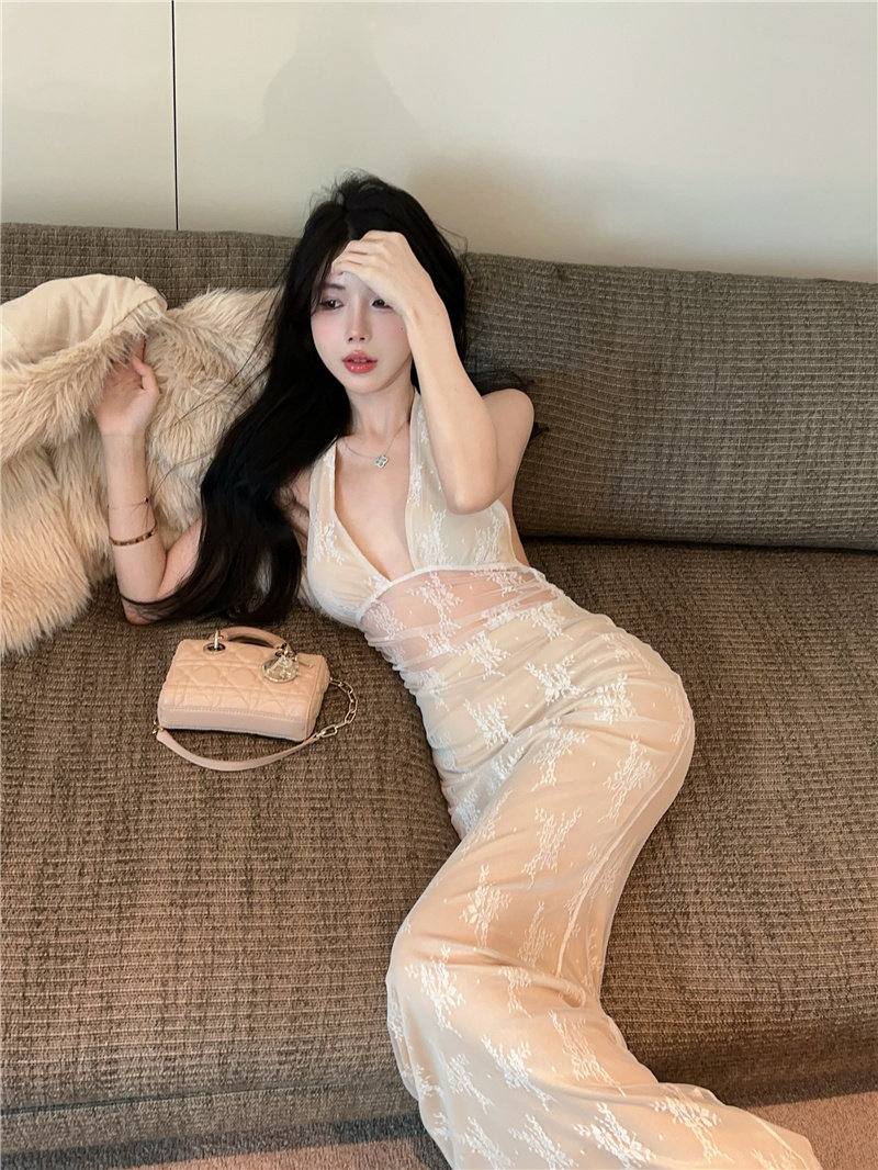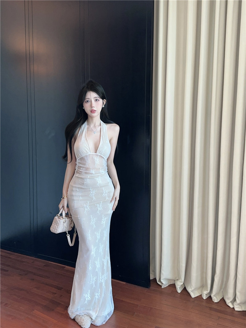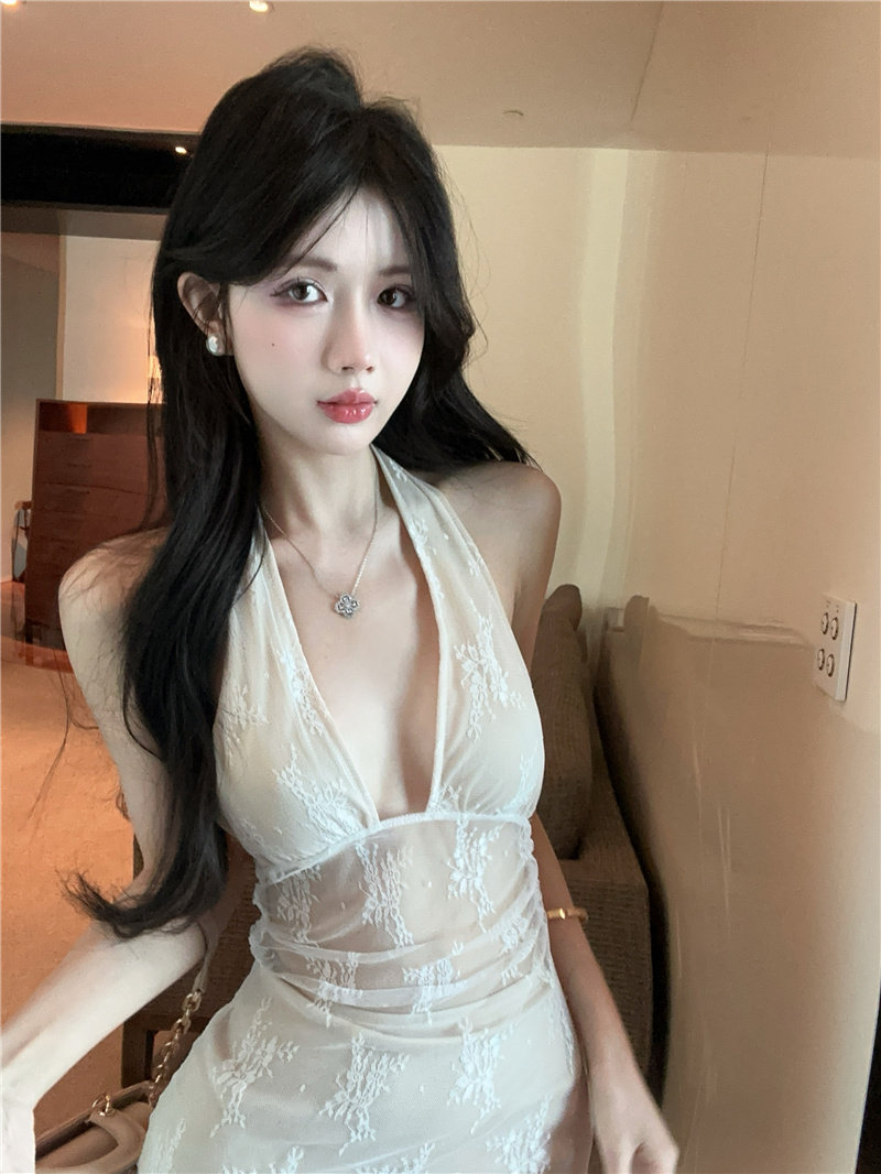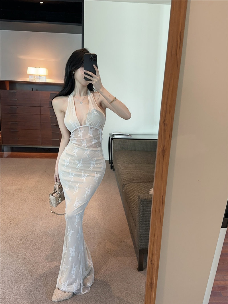 法式輕熟風氣質絕美蕾絲露背綁帶掛脖連衣裙性感V領修身長裙子女