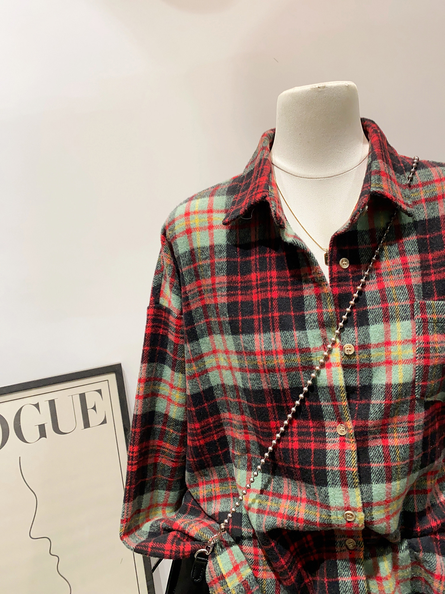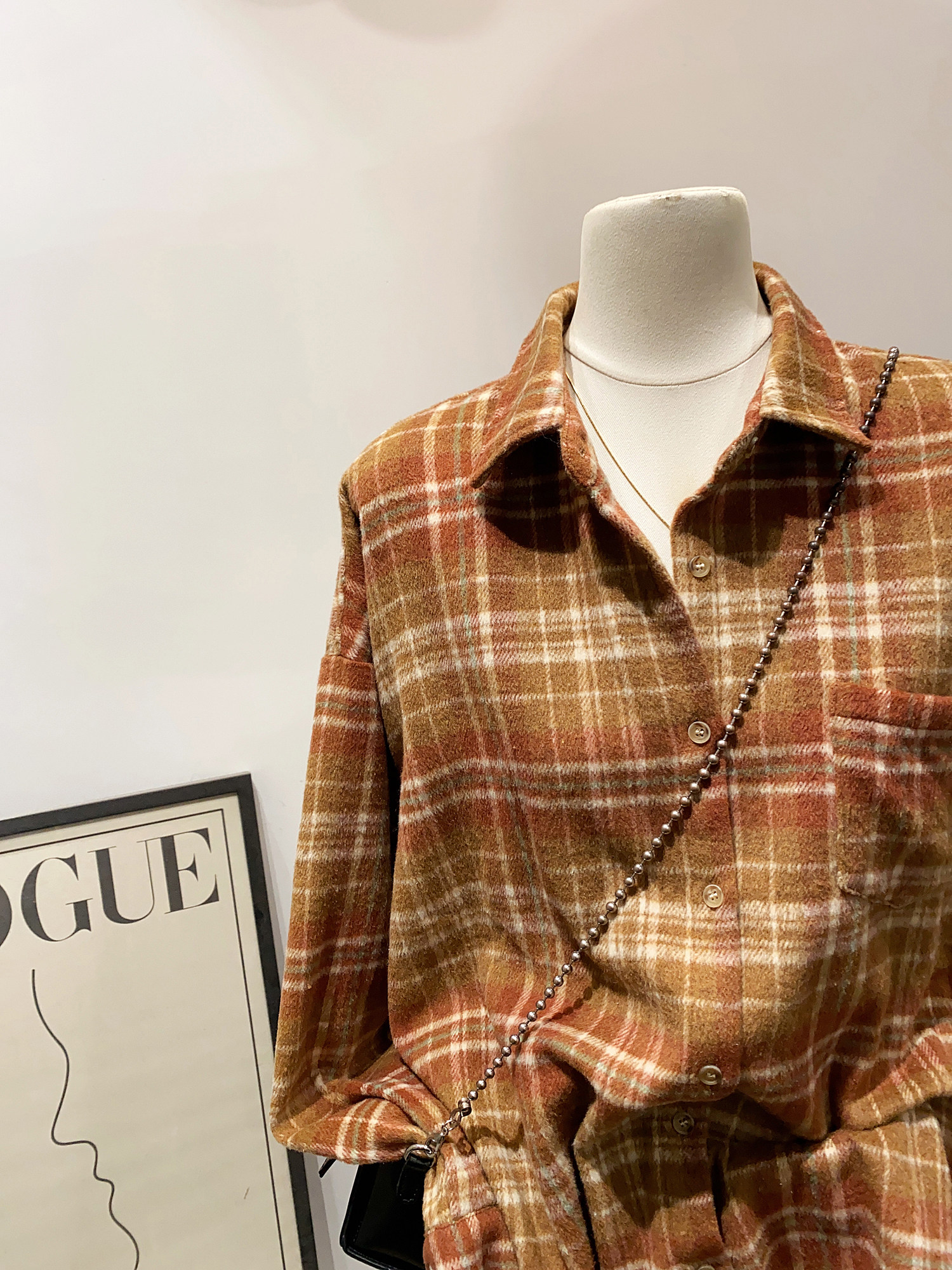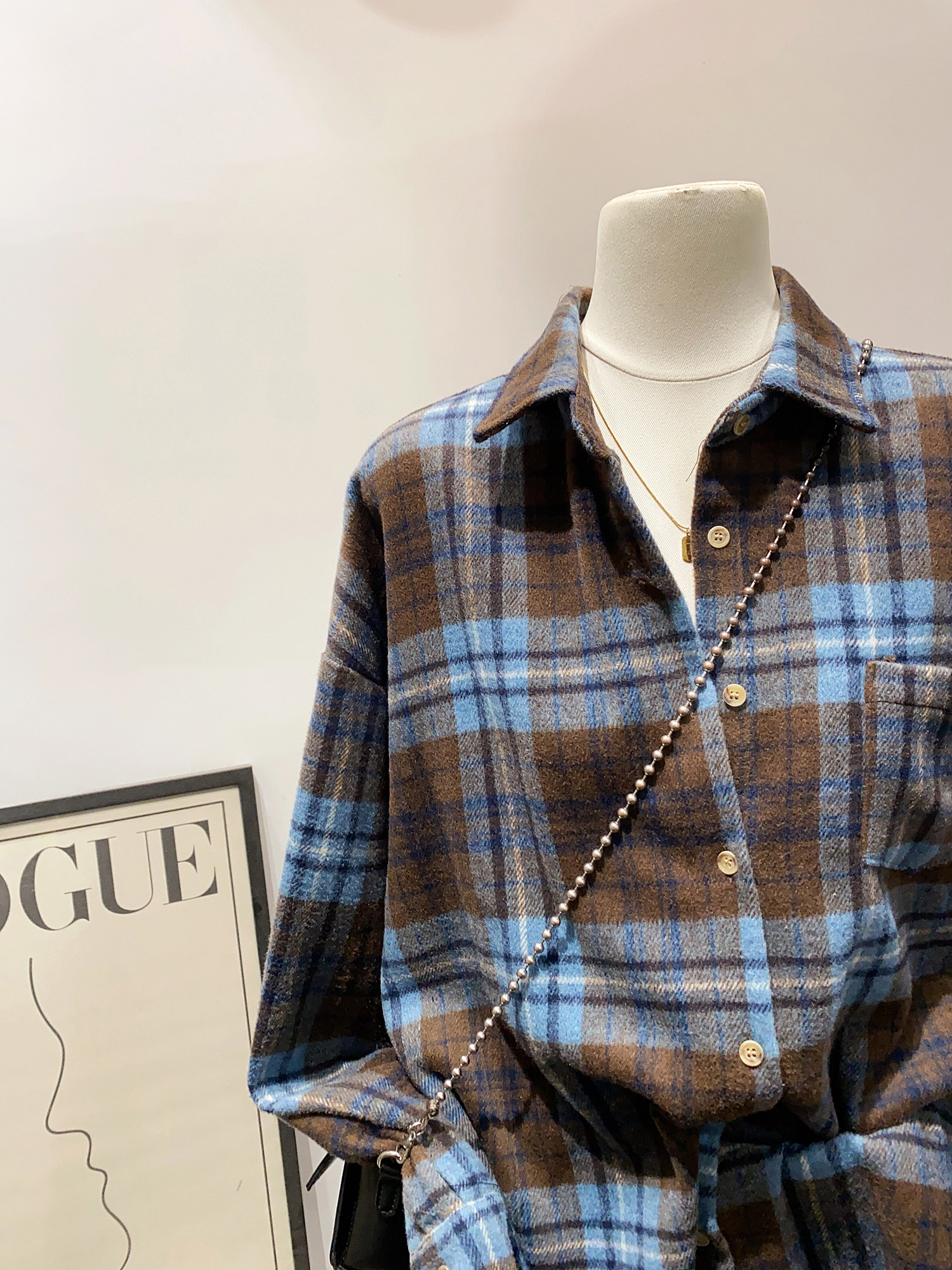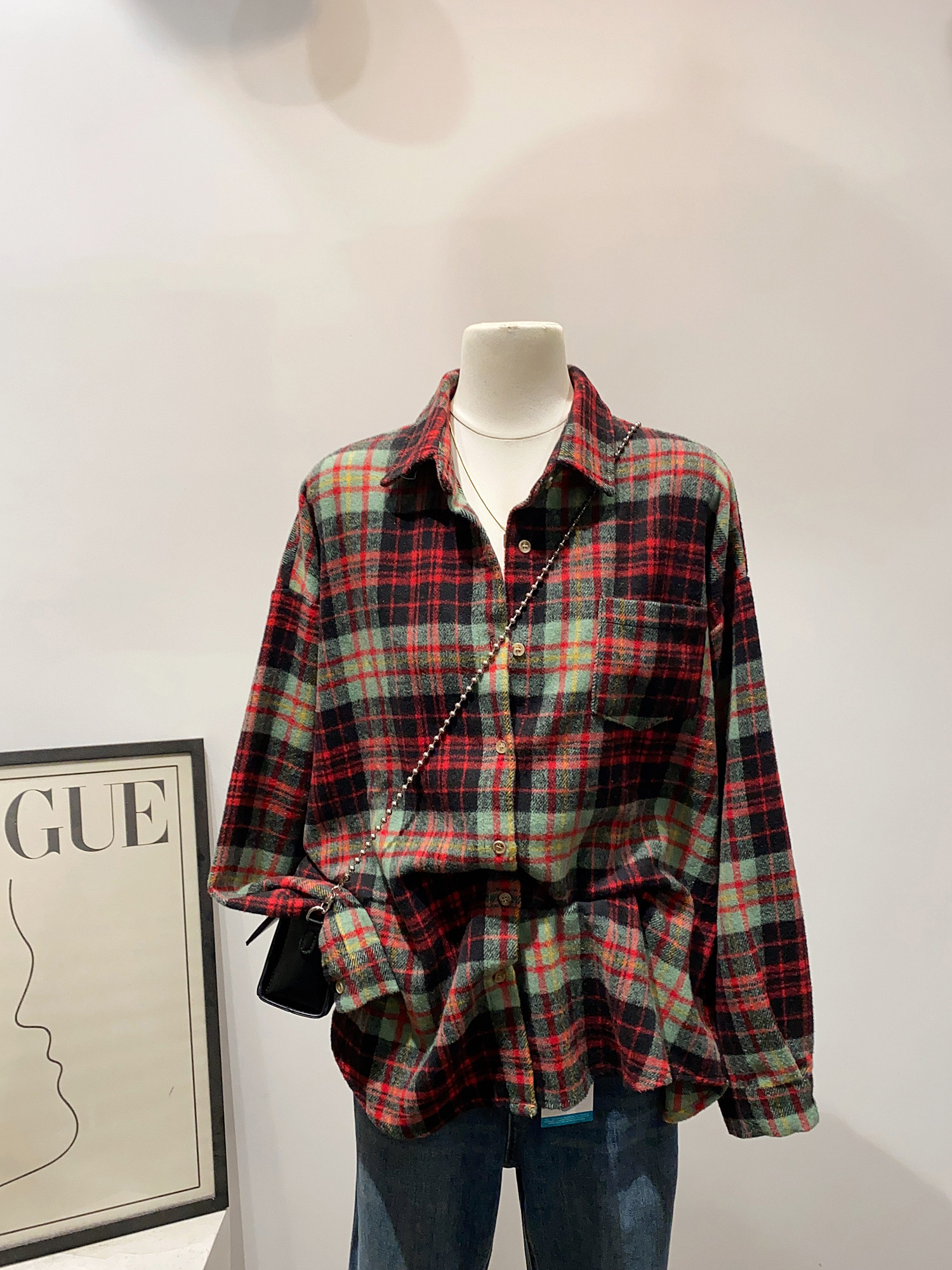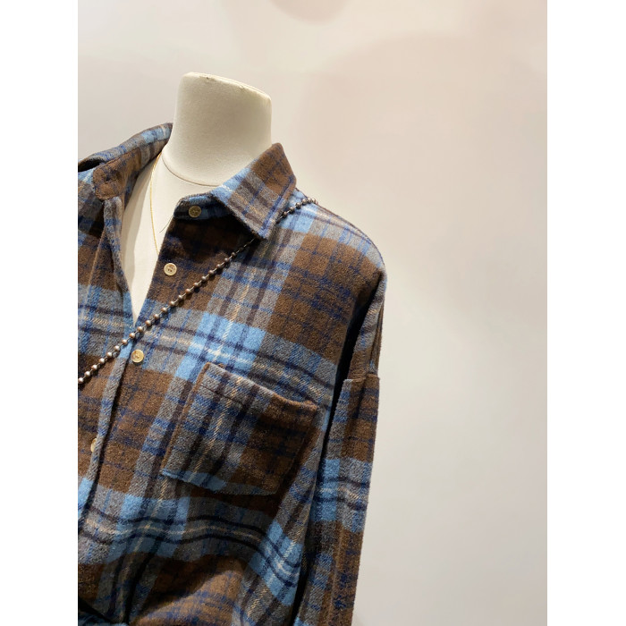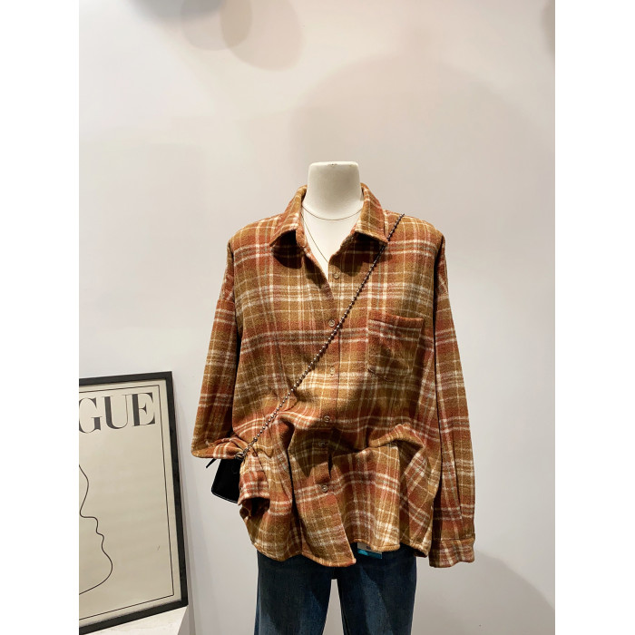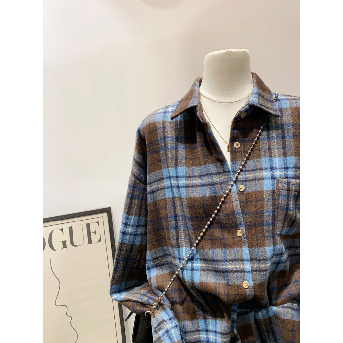 怎麽搭都好看~日系文藝感單口袋磨毛格子襯衫女秋冬款慵懶感上衣