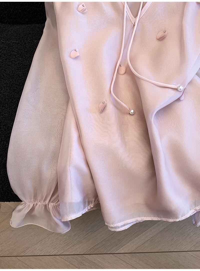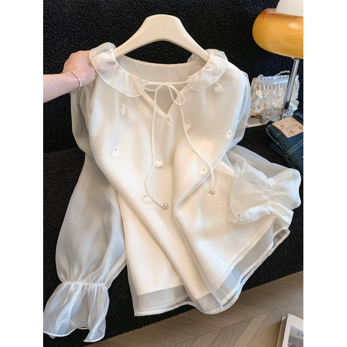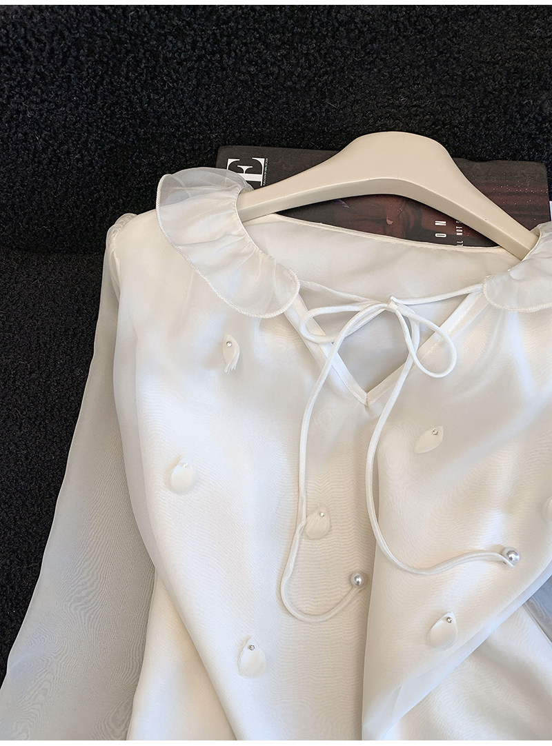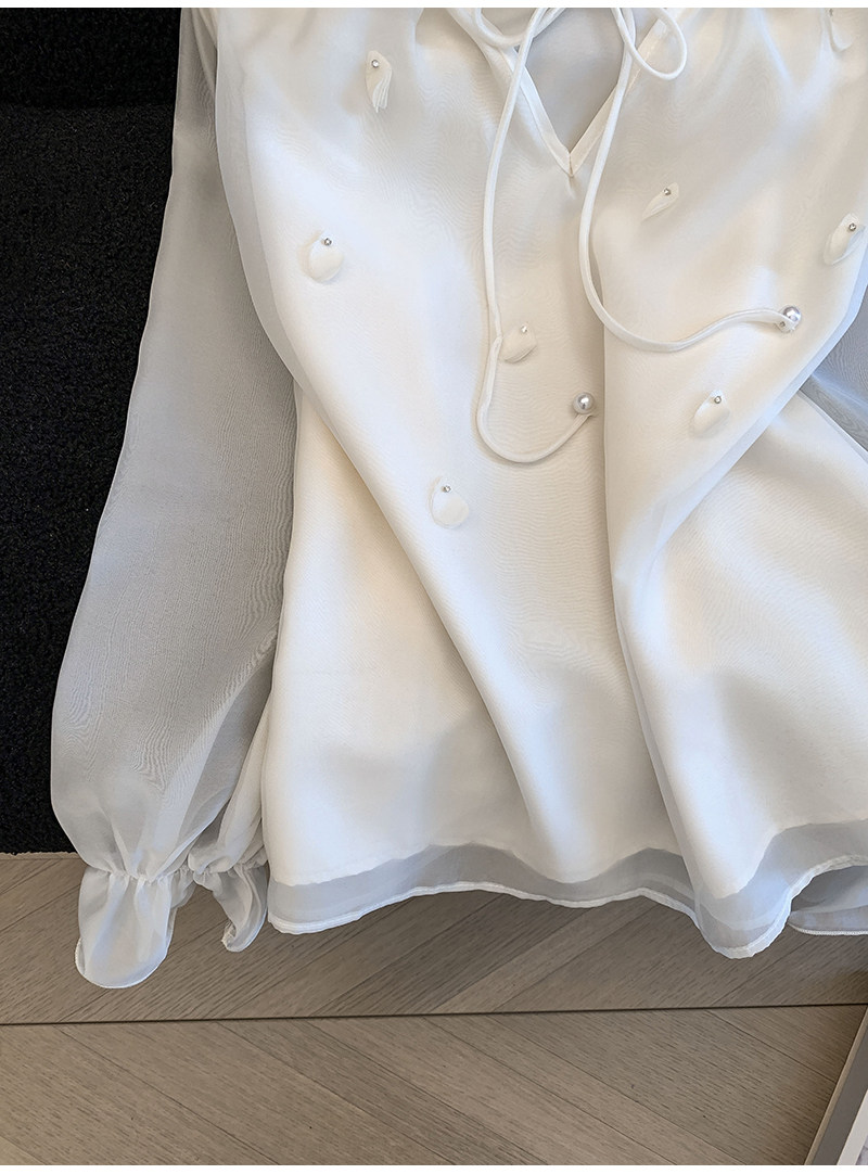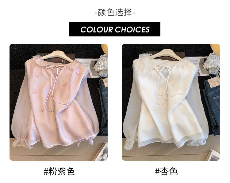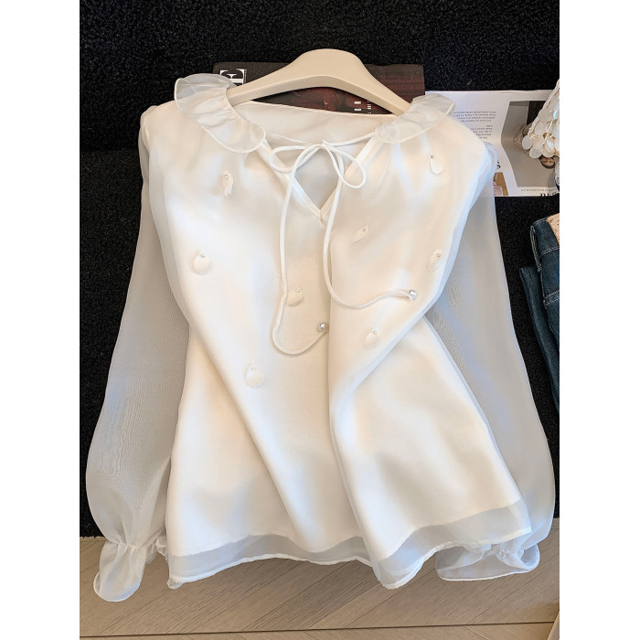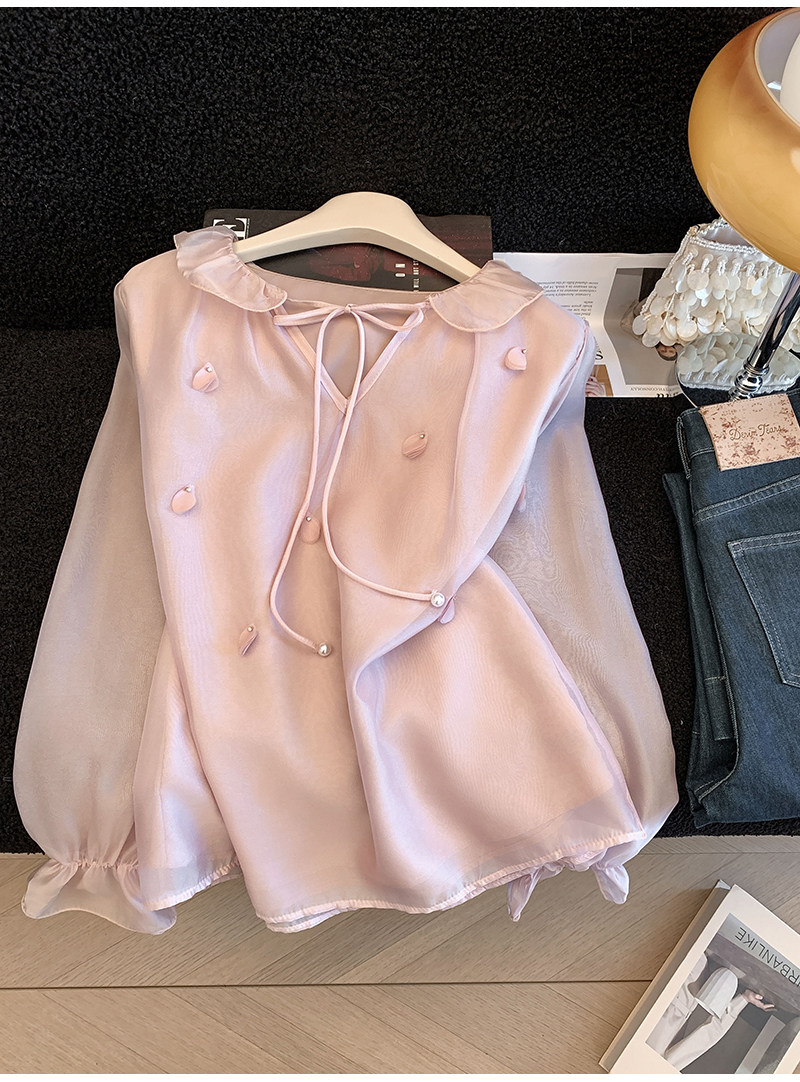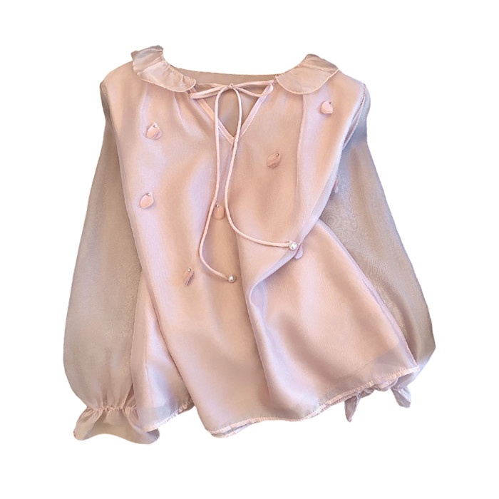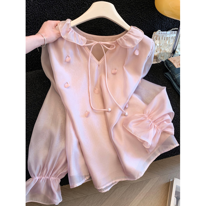 自畱款推薦~溫柔風立體花朵釘珠系帶襯衫女2026春季新款減齡上衣