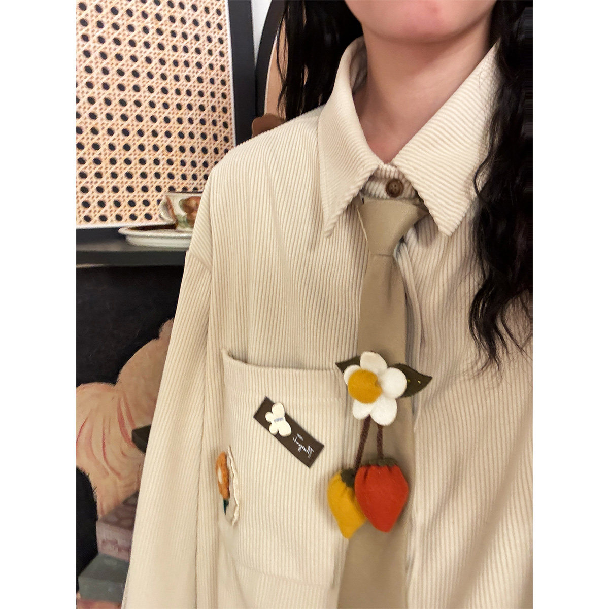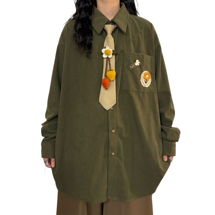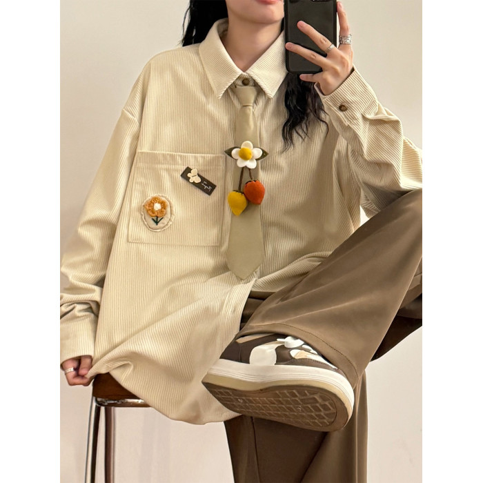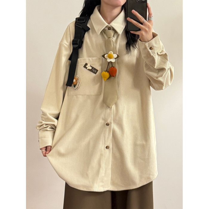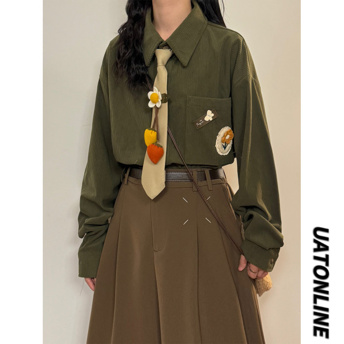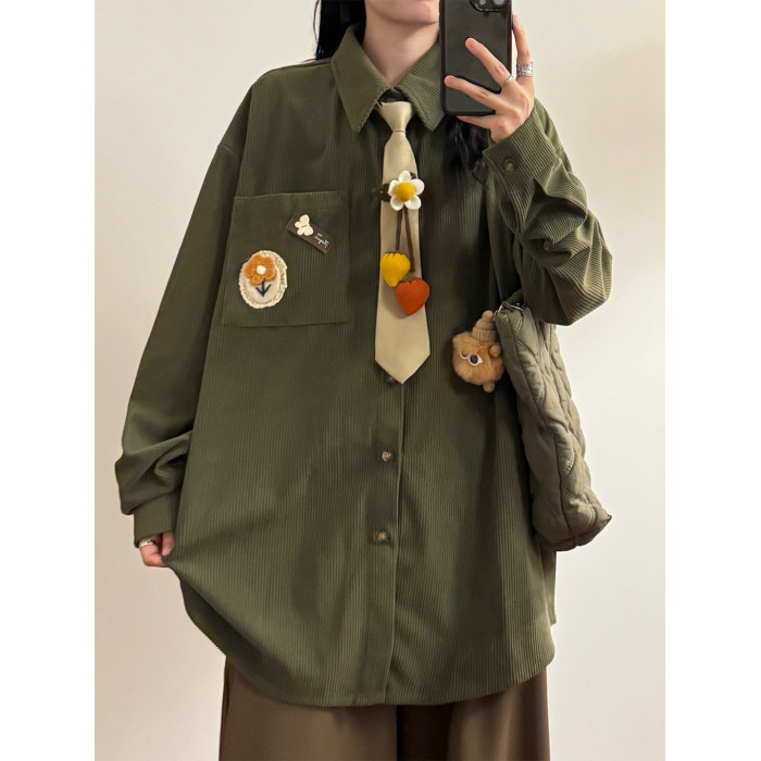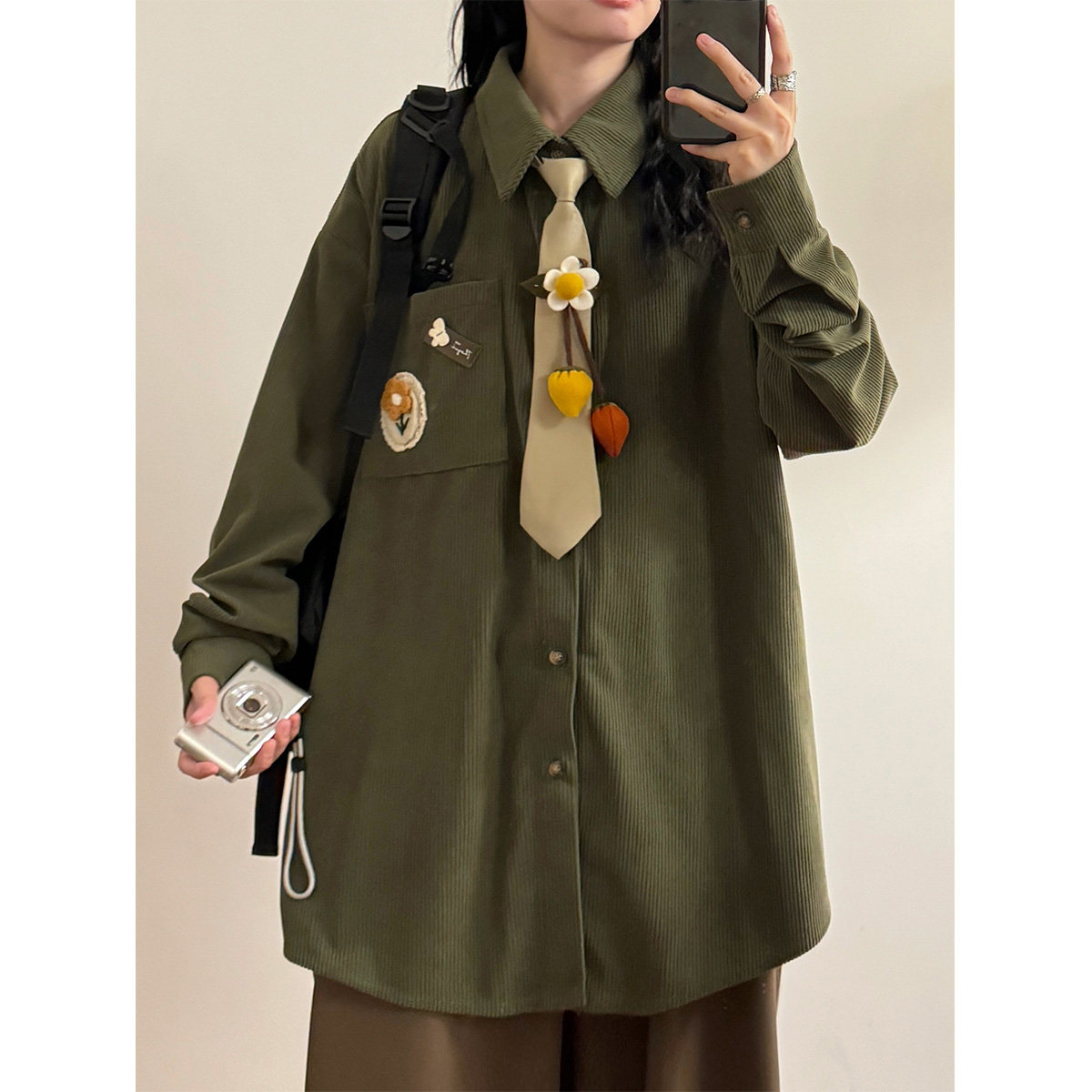 UATONLINE春秋日系復古文藝風寬鬆純色燈芯絨休閒長袖襯衫上衣女