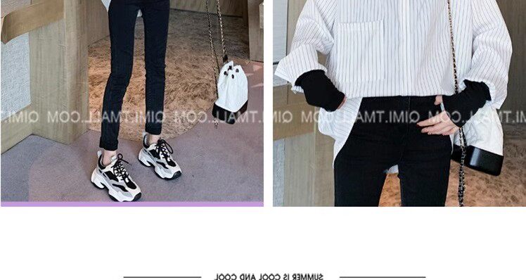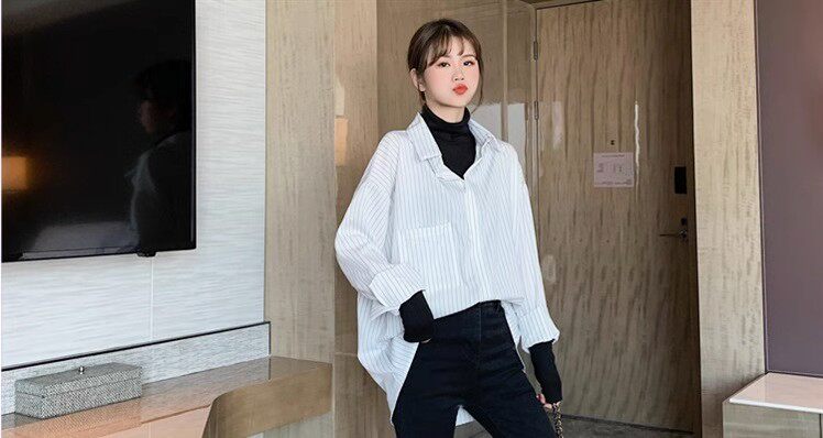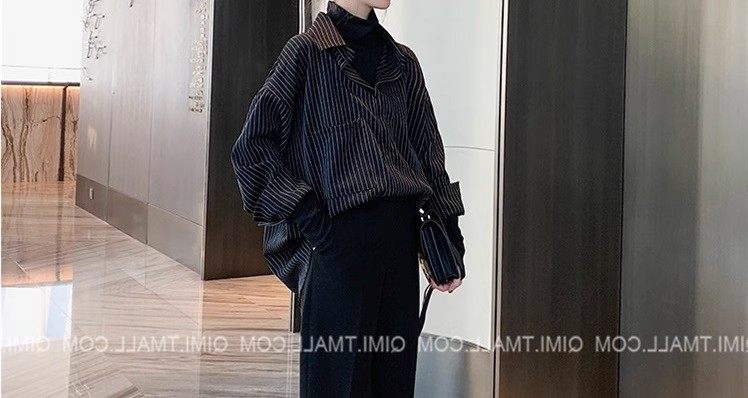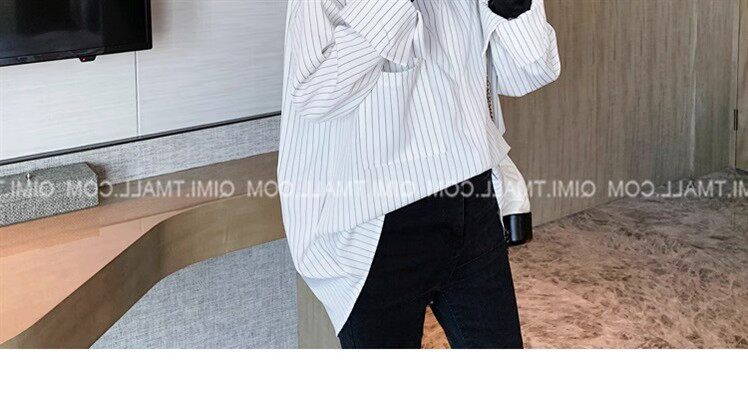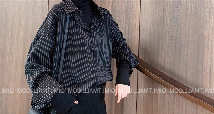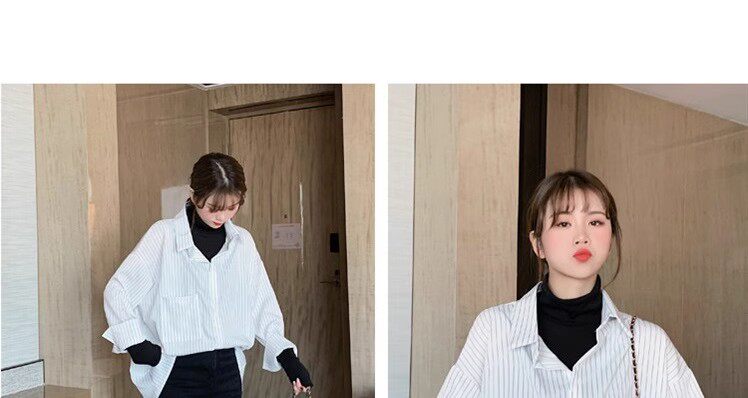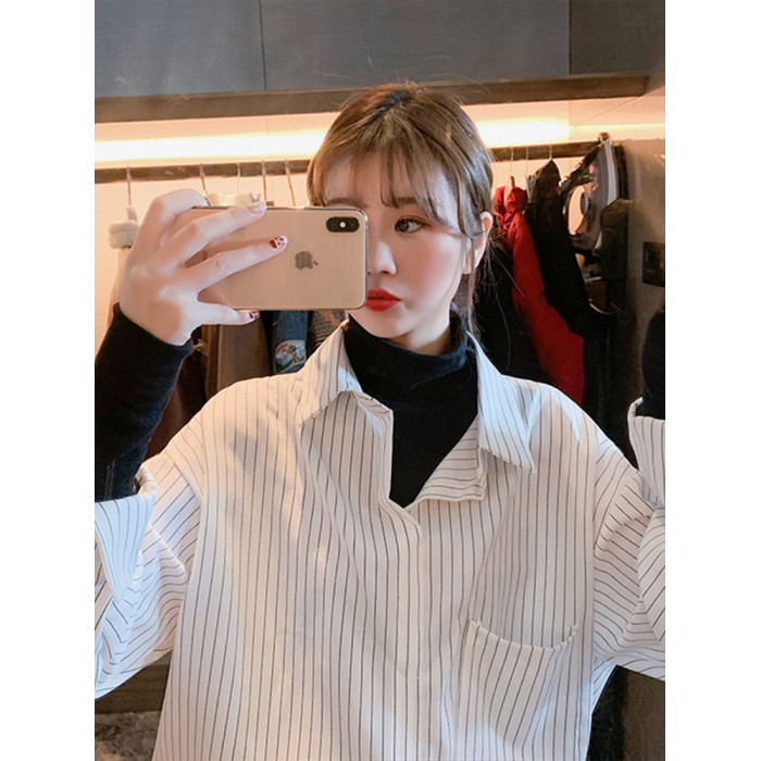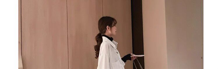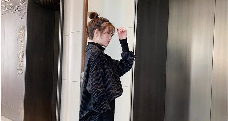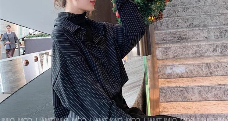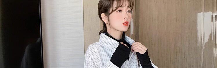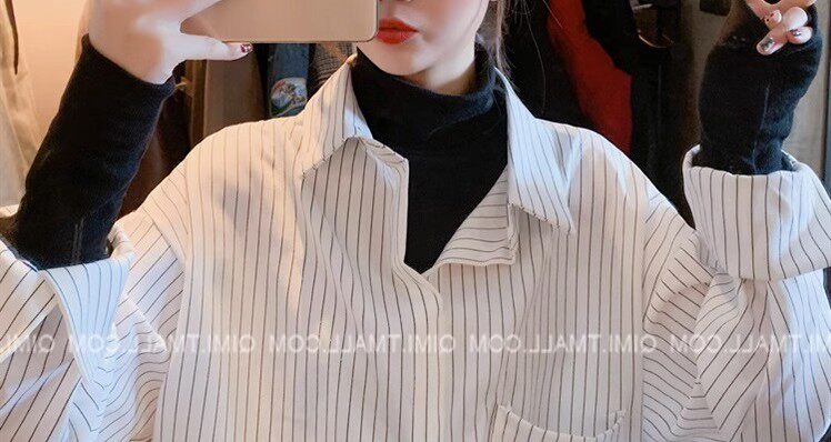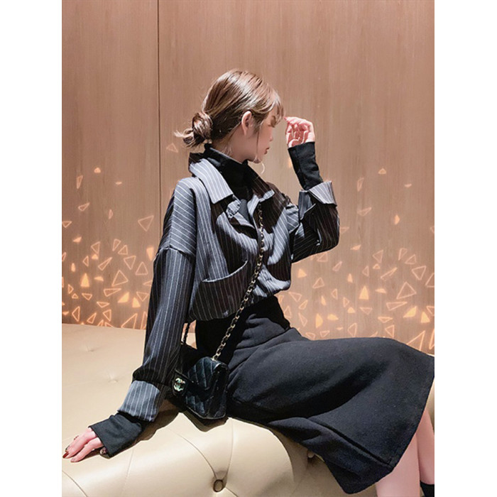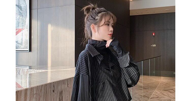 假兩件拼接條紋黑色襯衫女春秋鹽系穿搭上衣曡穿內搭打底白襯衣冬