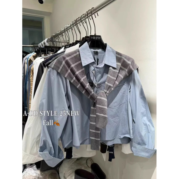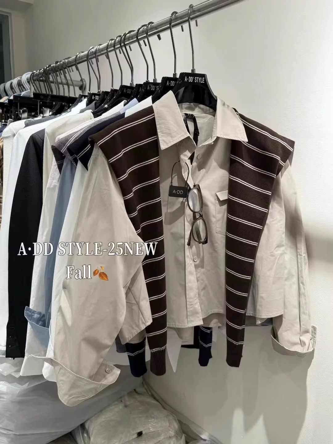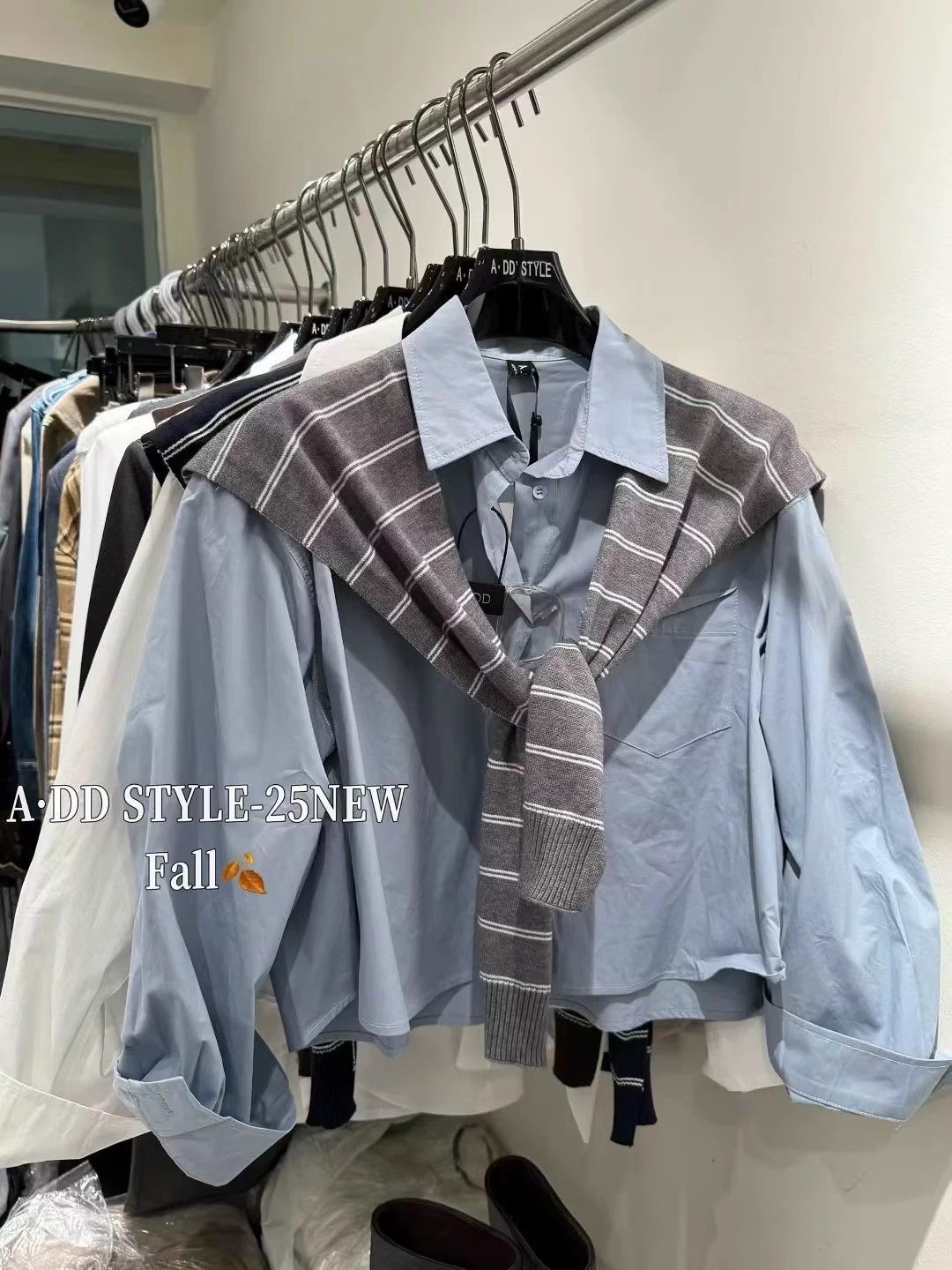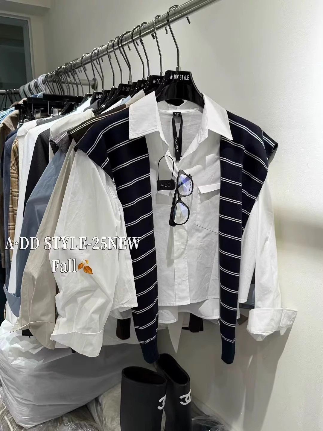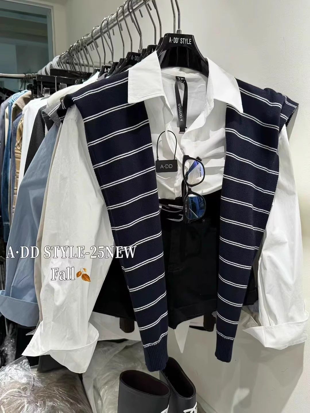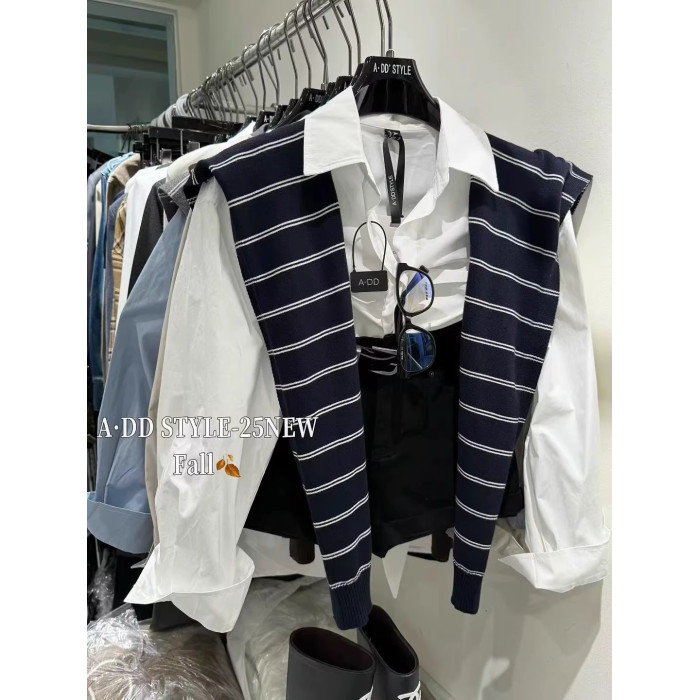 韓國東大門秋季新款時髦氣質繙領襯衫+條紋針織披肩兩件套女上衣