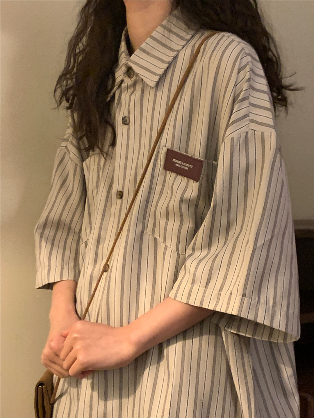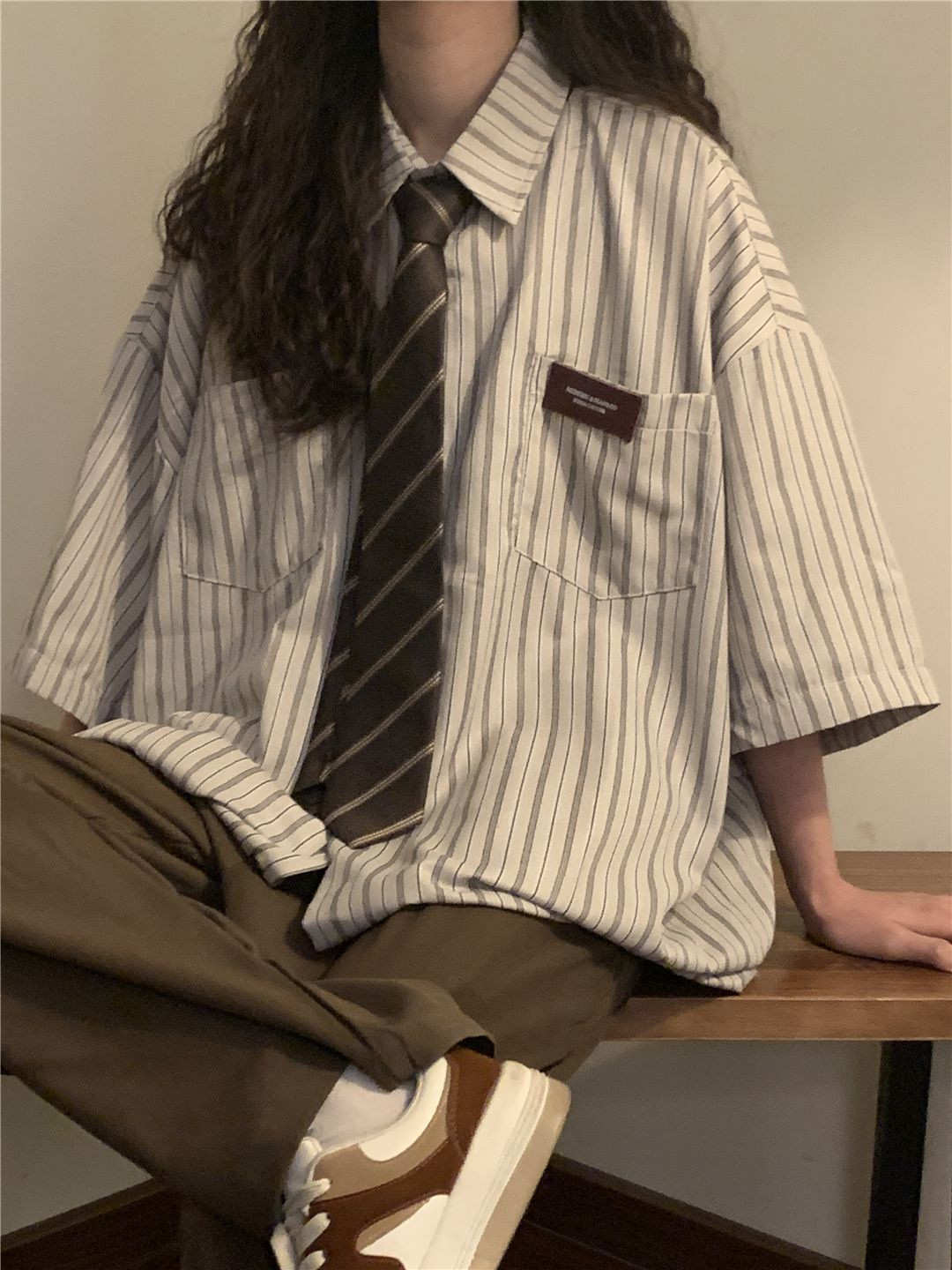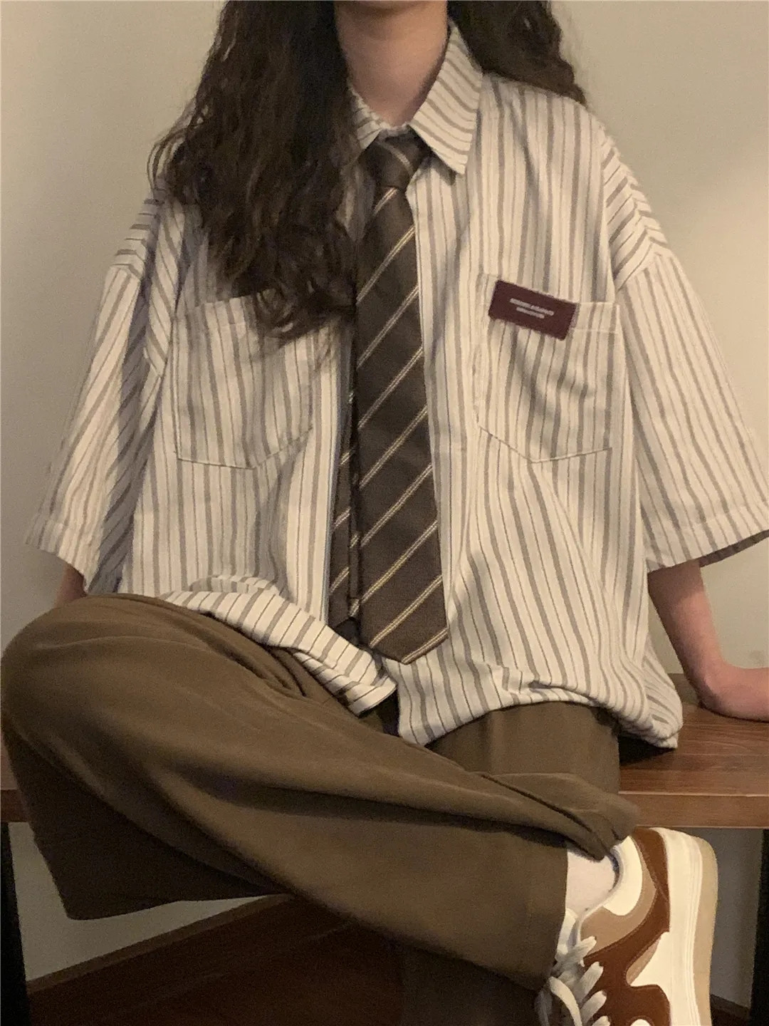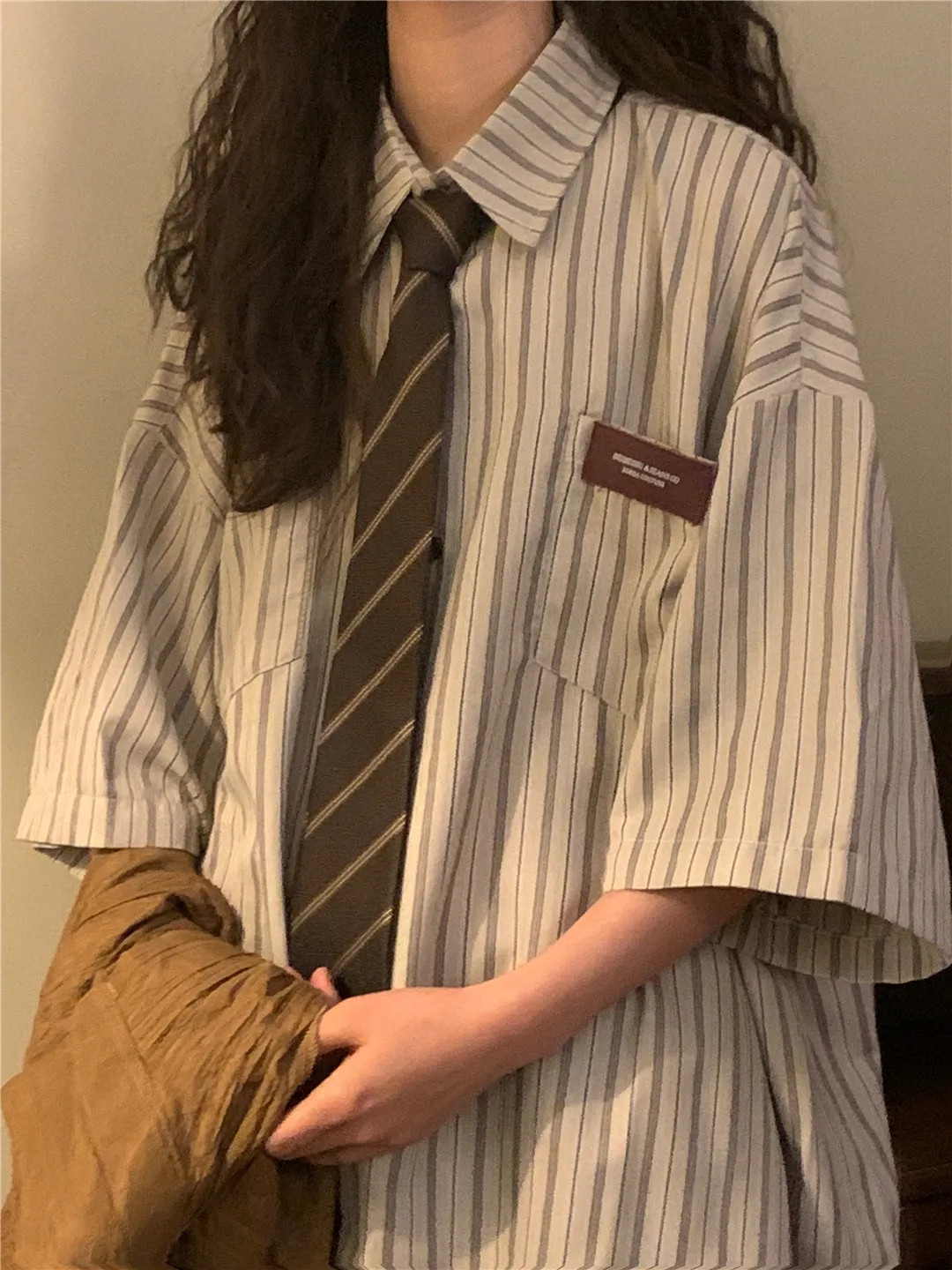 美式復古寬鬆學院風2025夏季設計感小衆短袖條紋襯衫女慵懶風上衣