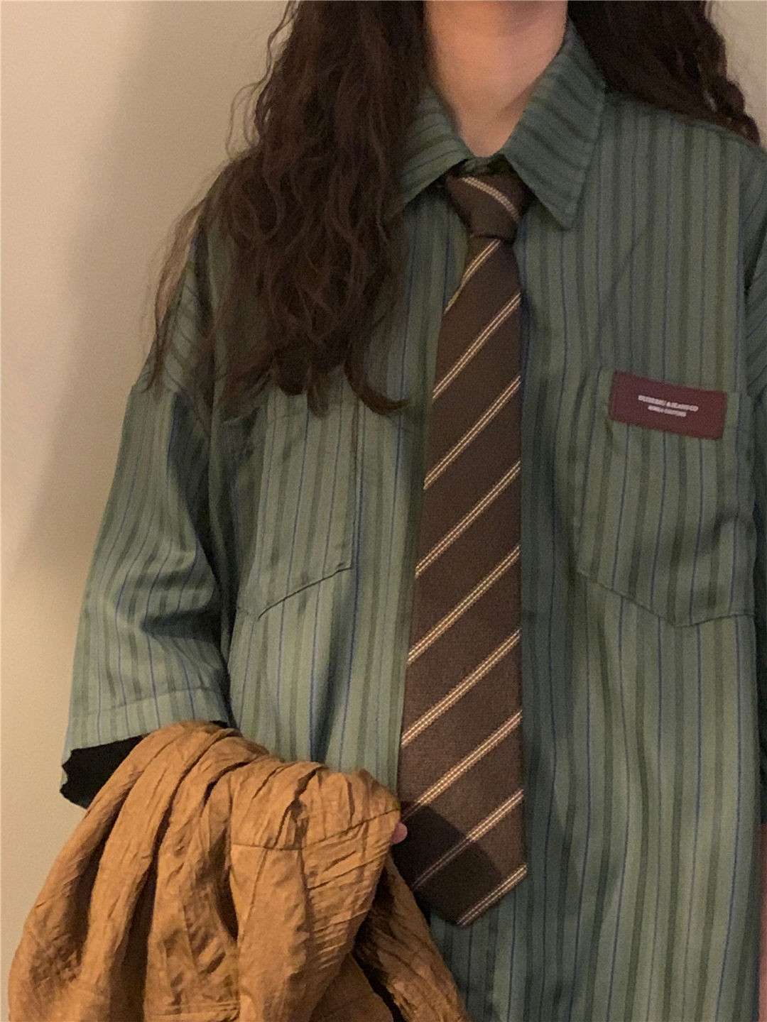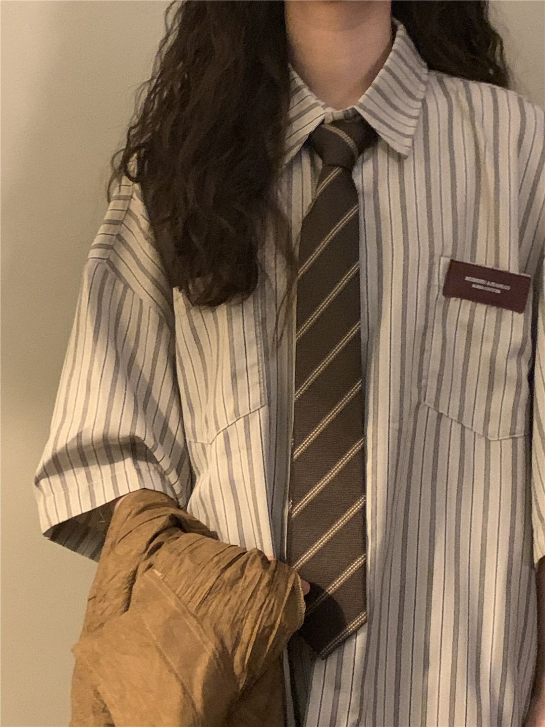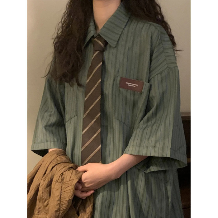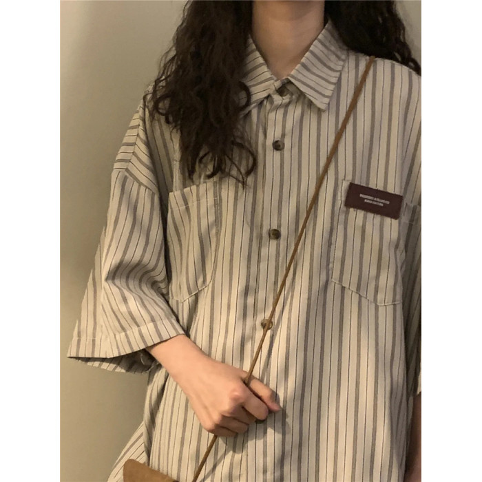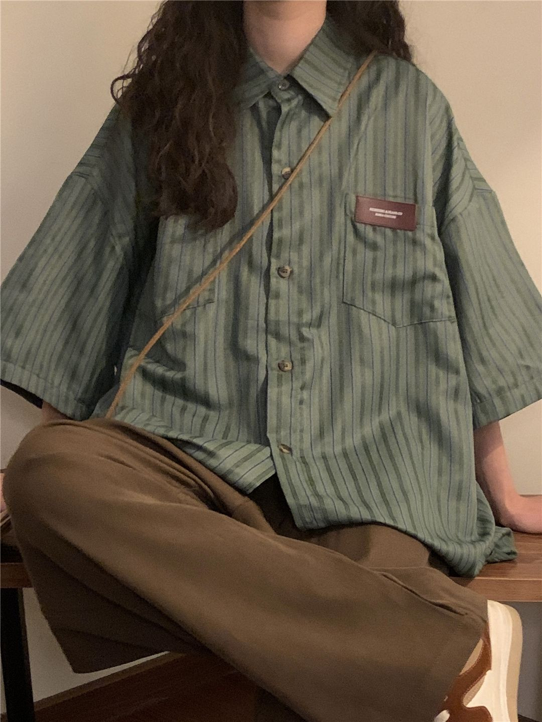 美式復古寬鬆學院風2025夏季設計感小衆短袖條紋襯衫女慵懶風上衣
