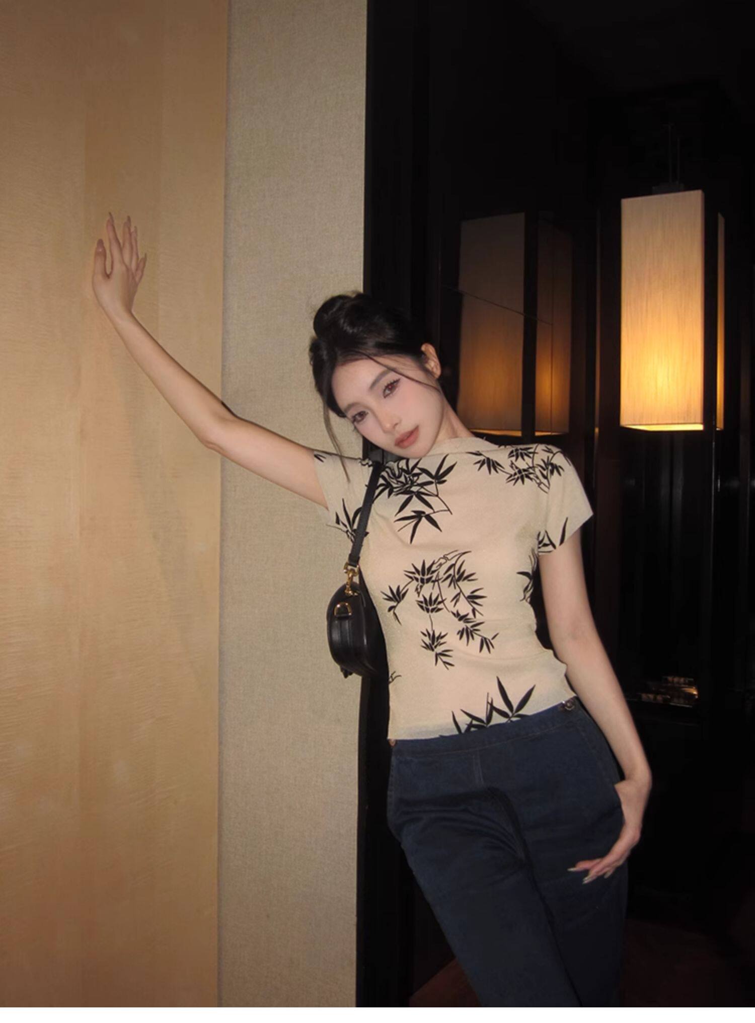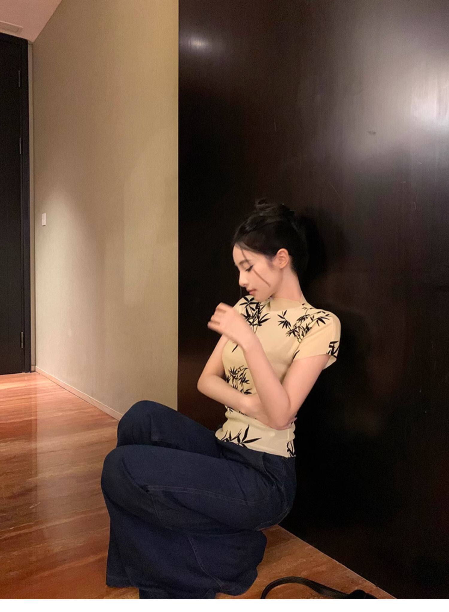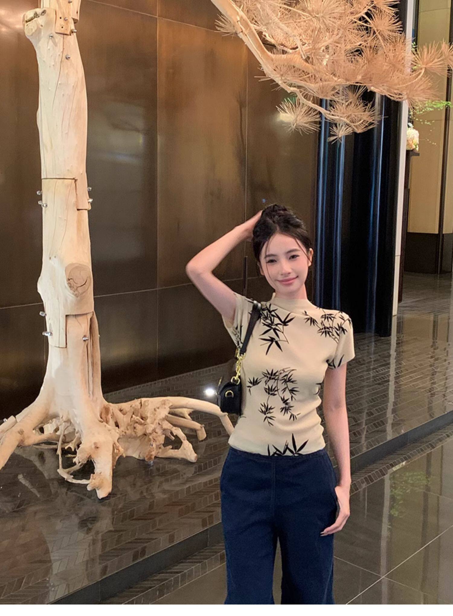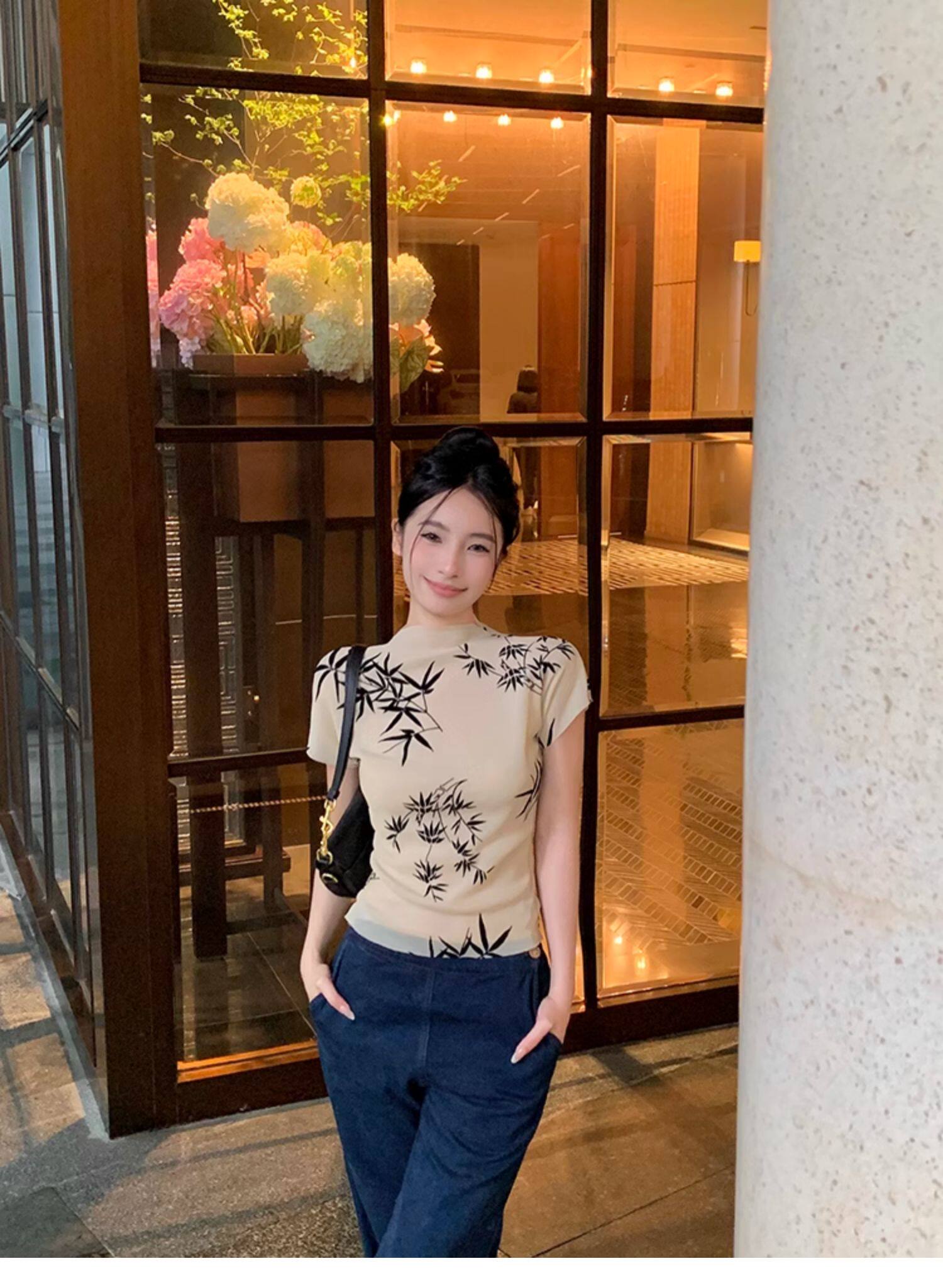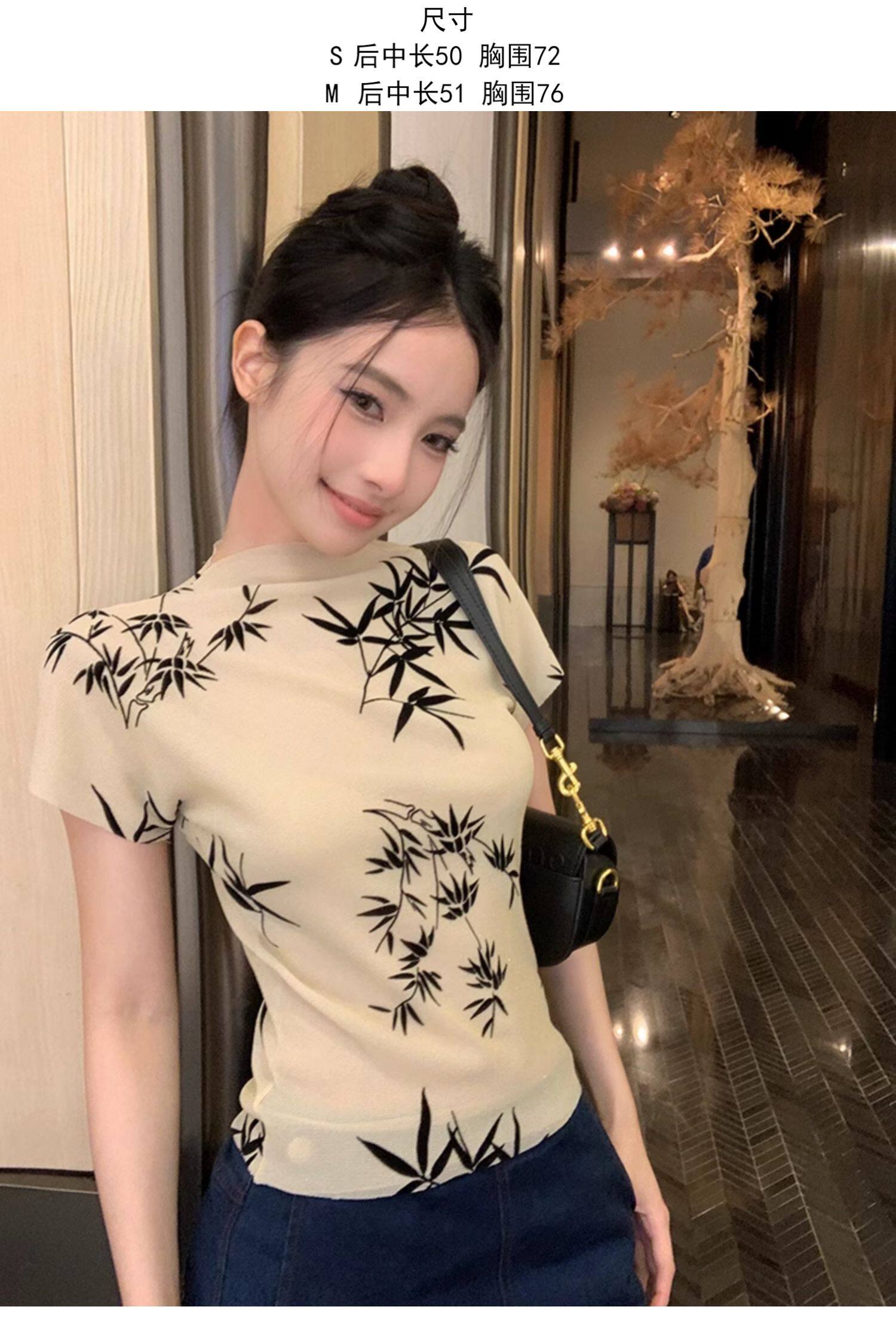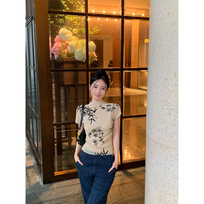 BaiYaShan/白婭衫 新中式國風水墨印花短袖t恤彈力微透修身上衣女