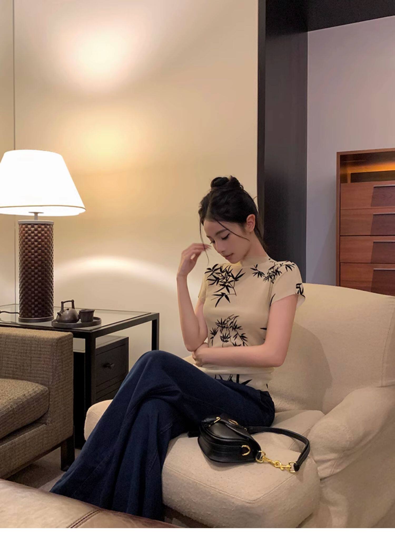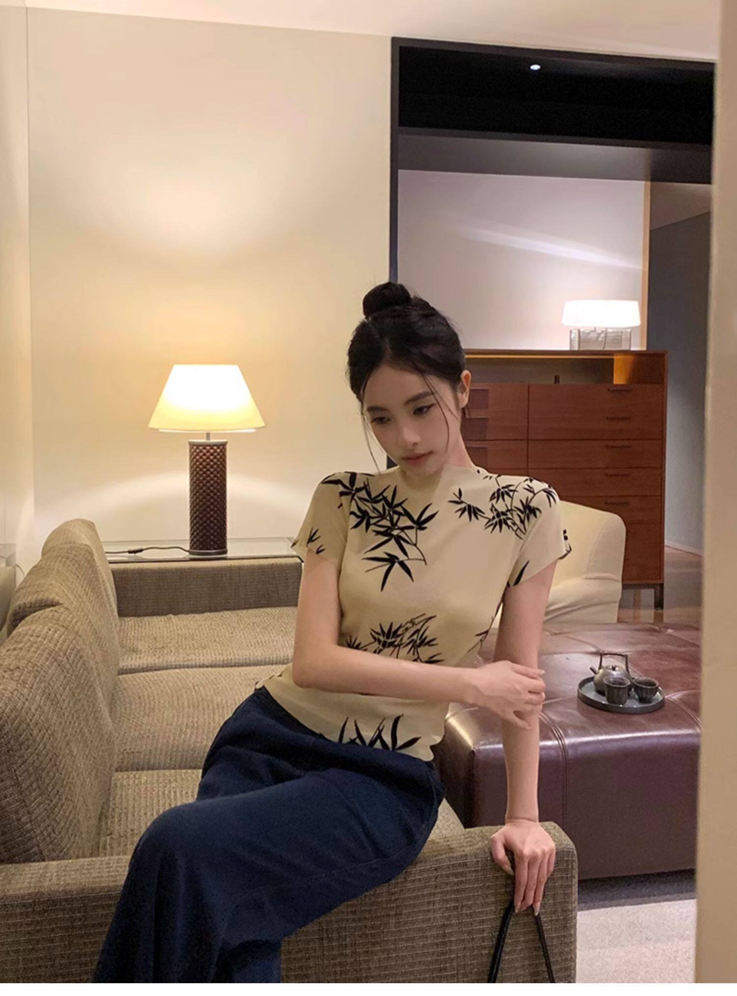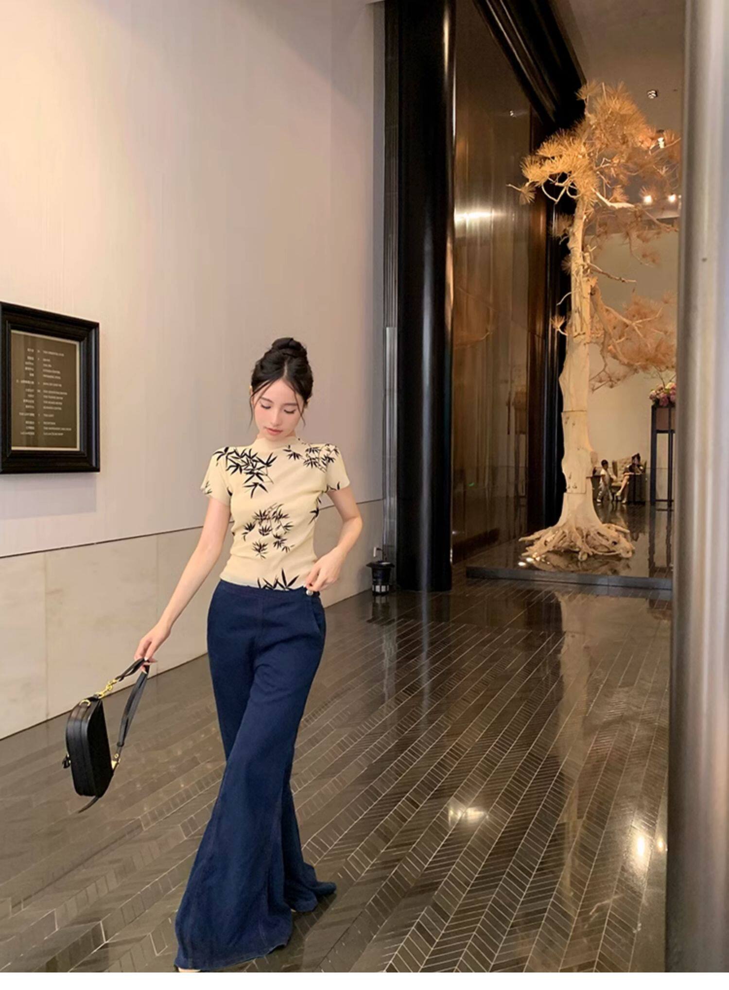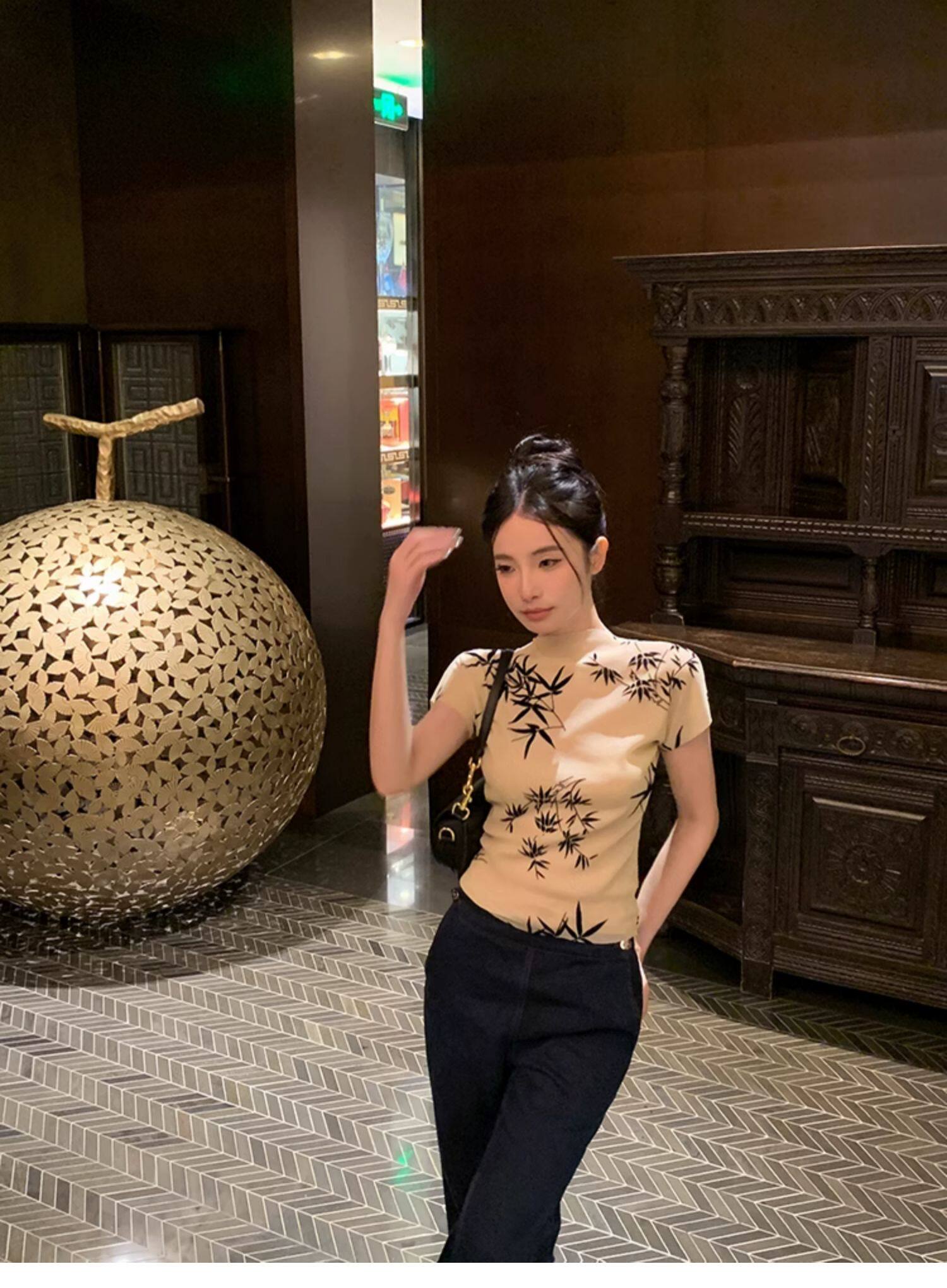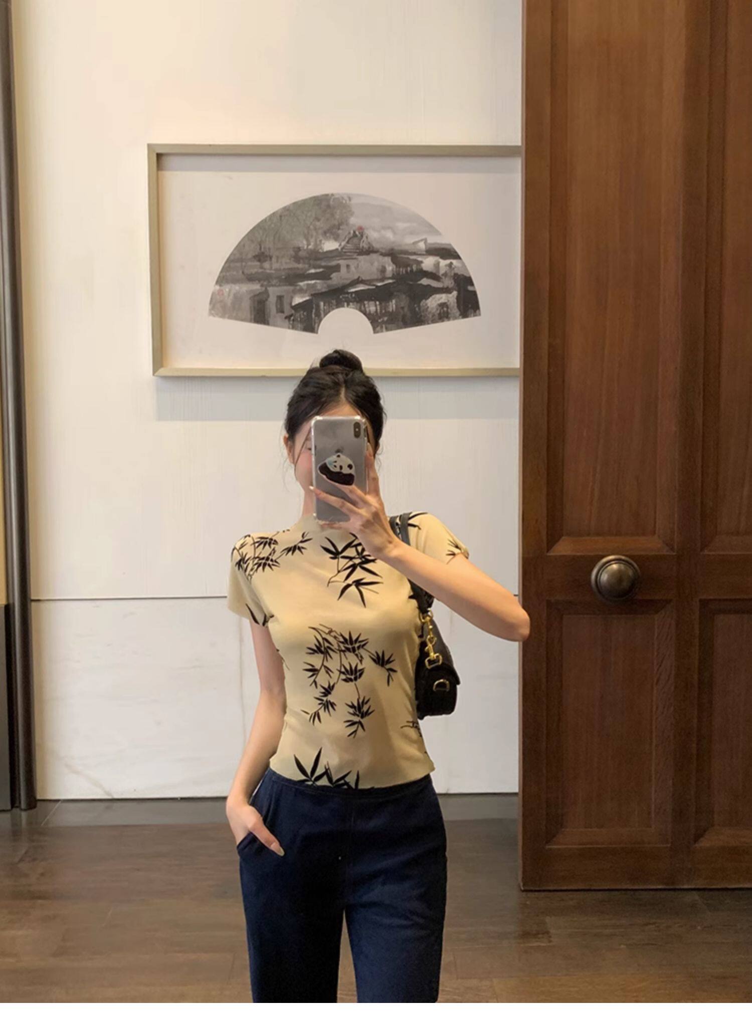 BaiYaShan/白婭衫 新中式國風水墨印花短袖t恤彈力微透修身上衣女