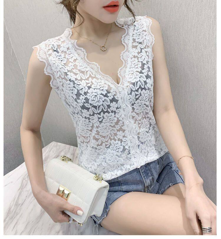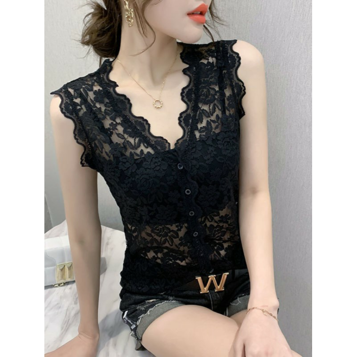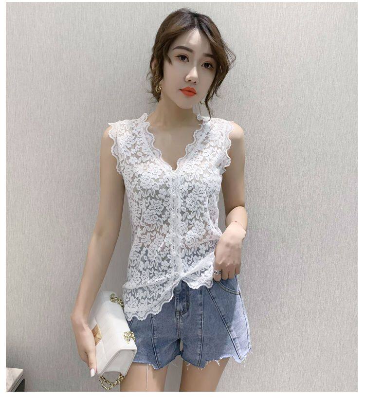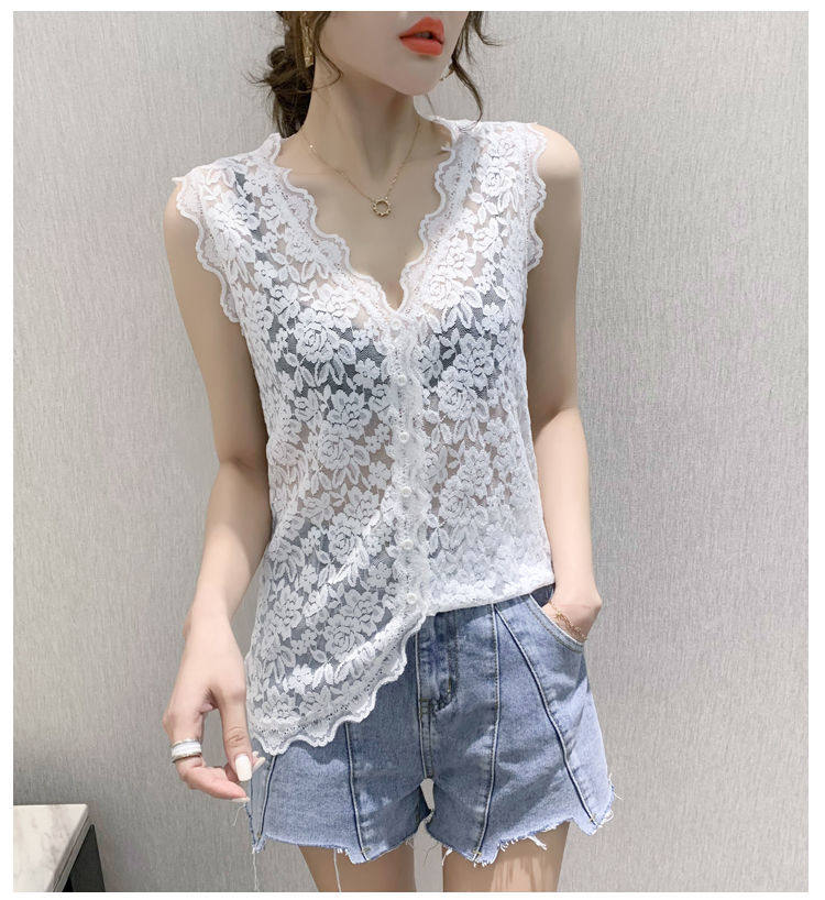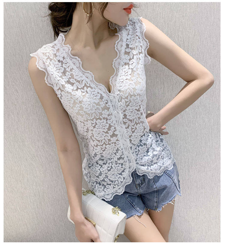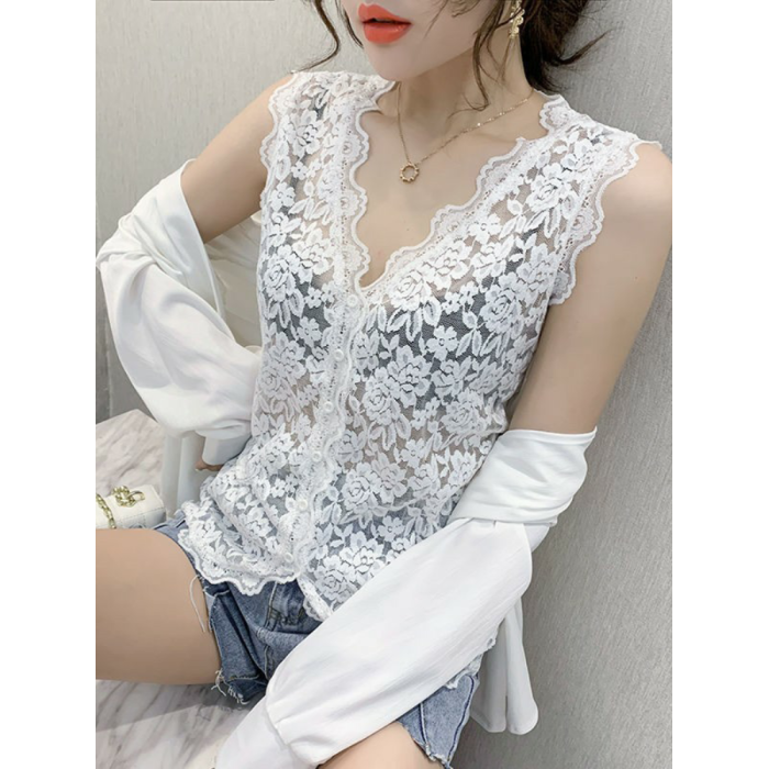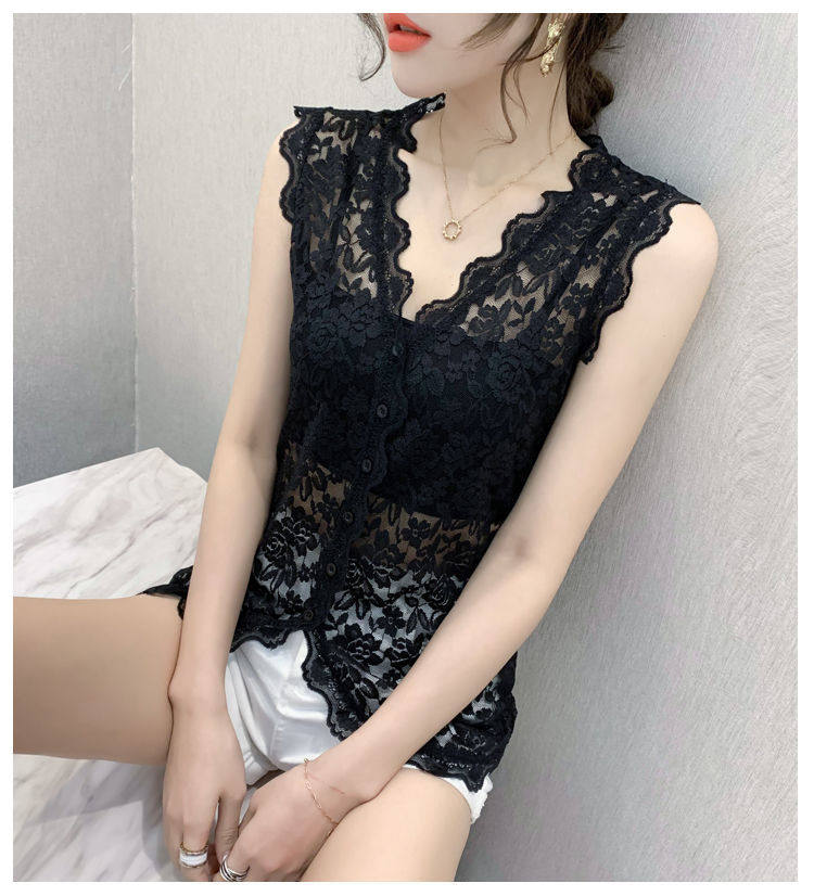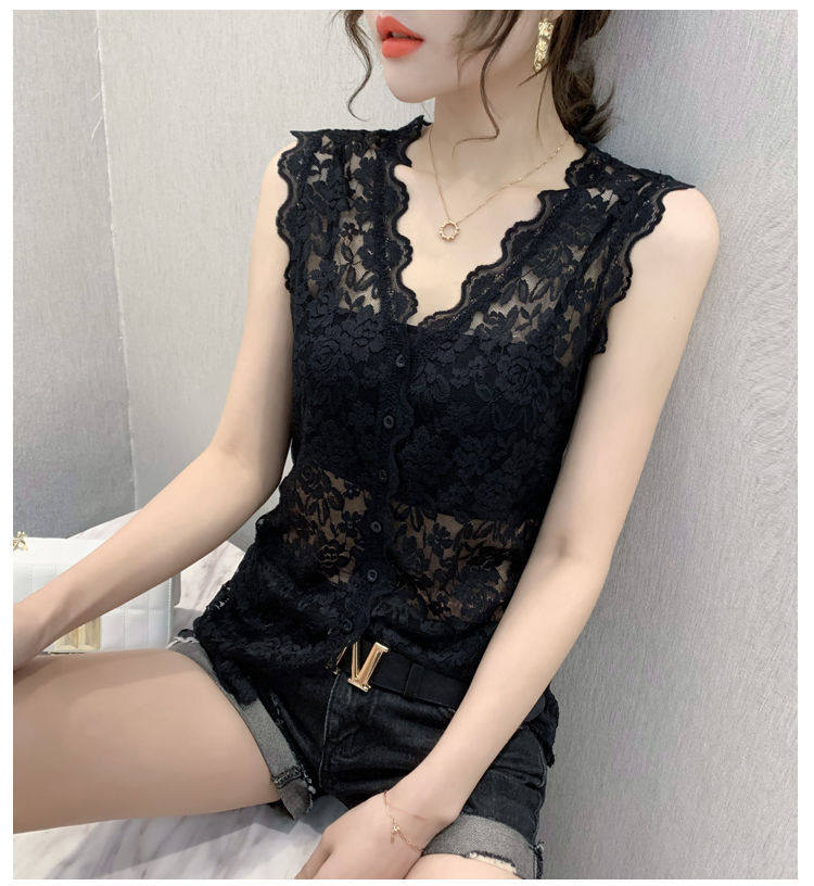 V領蕾絲吊帶心背女夏季新款性感內搭鏤空衫打底無袖網紗上裝外穿