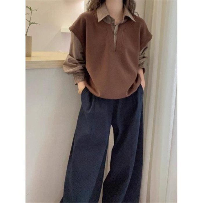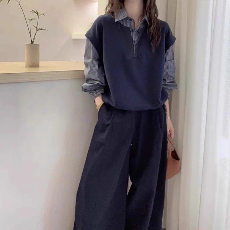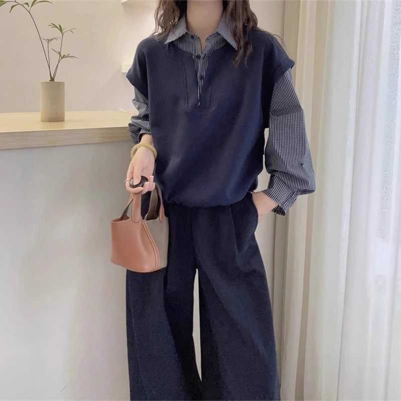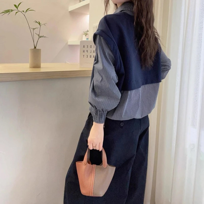 韓版顯瘦百搭休閒復古格子襯衫女2026春秋季假兩件工裝長袖上衣