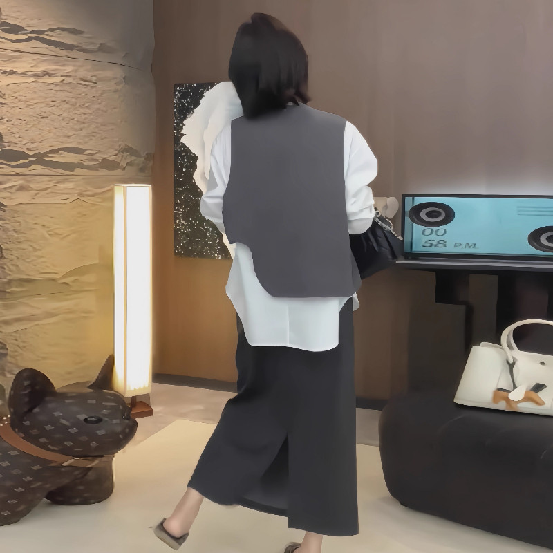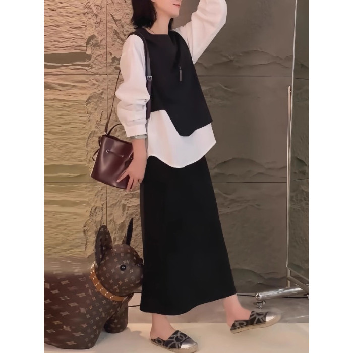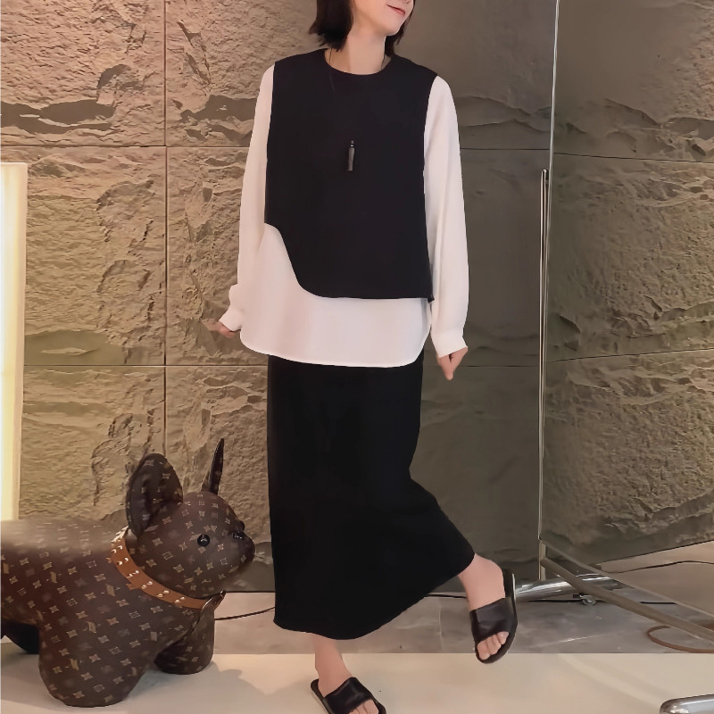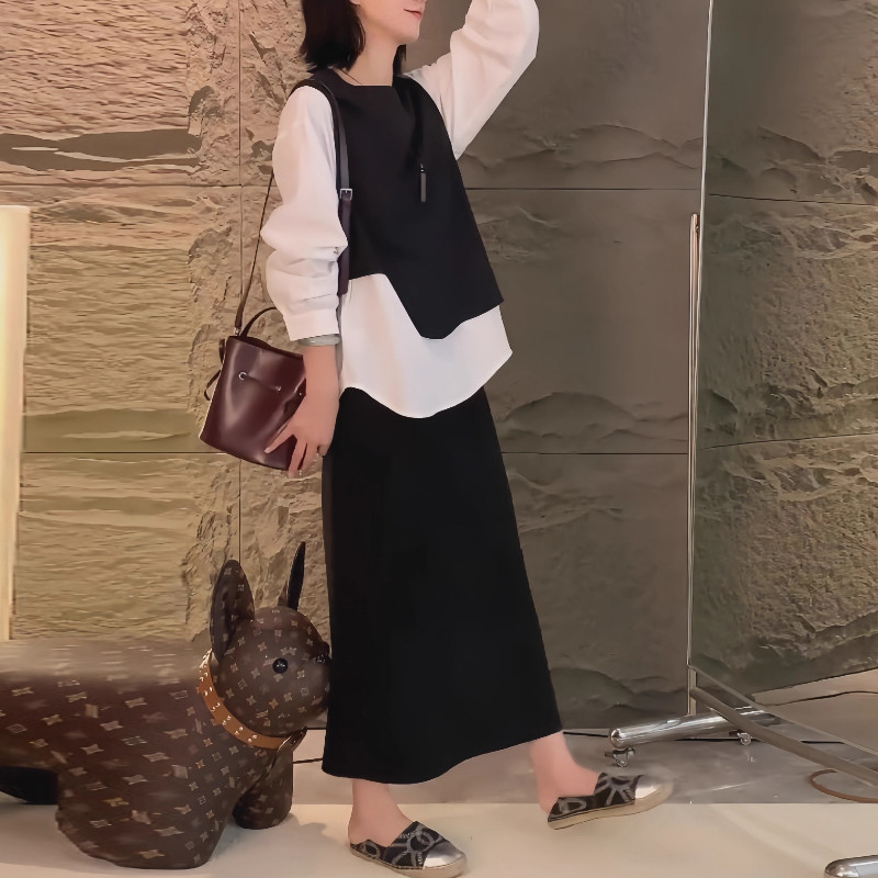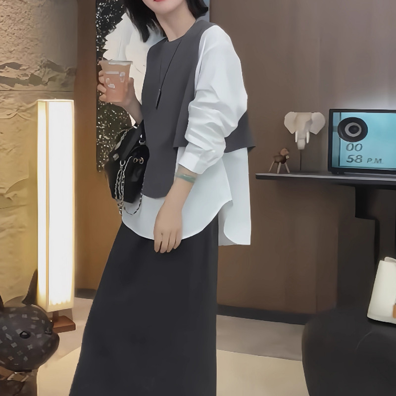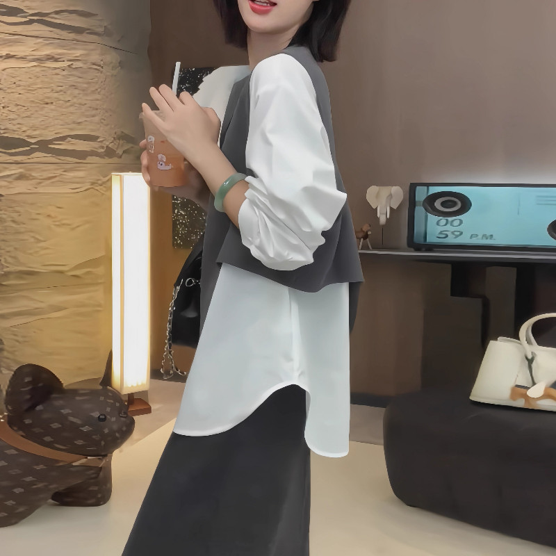 大碼假兩件馬甲拼接長袖襯衫女春季微胖mm設計感寬鬆顯瘦內搭上衣