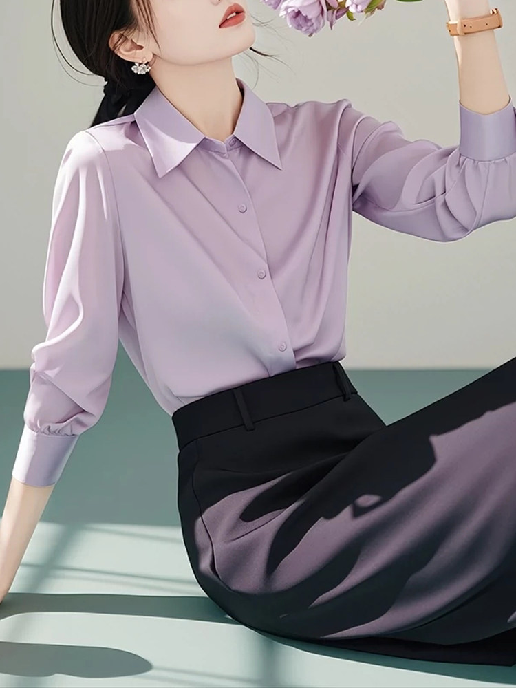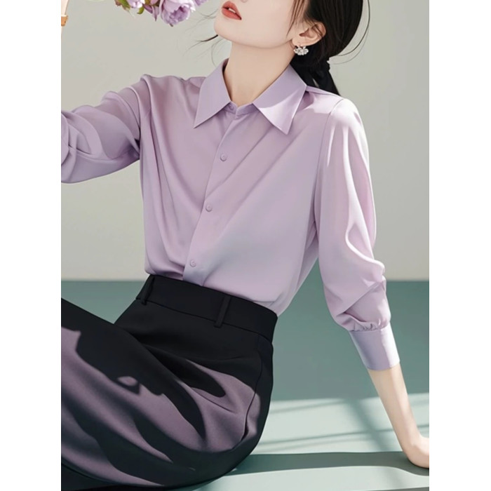 時尚氣質輕熟風紫色繙領長袖襯衫女早秋款獨特百搭絕美不撞款上衣