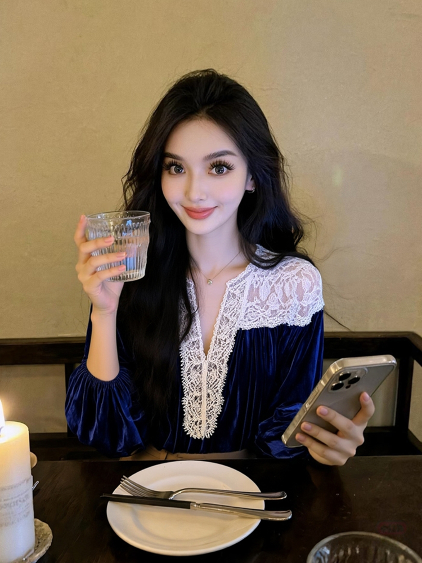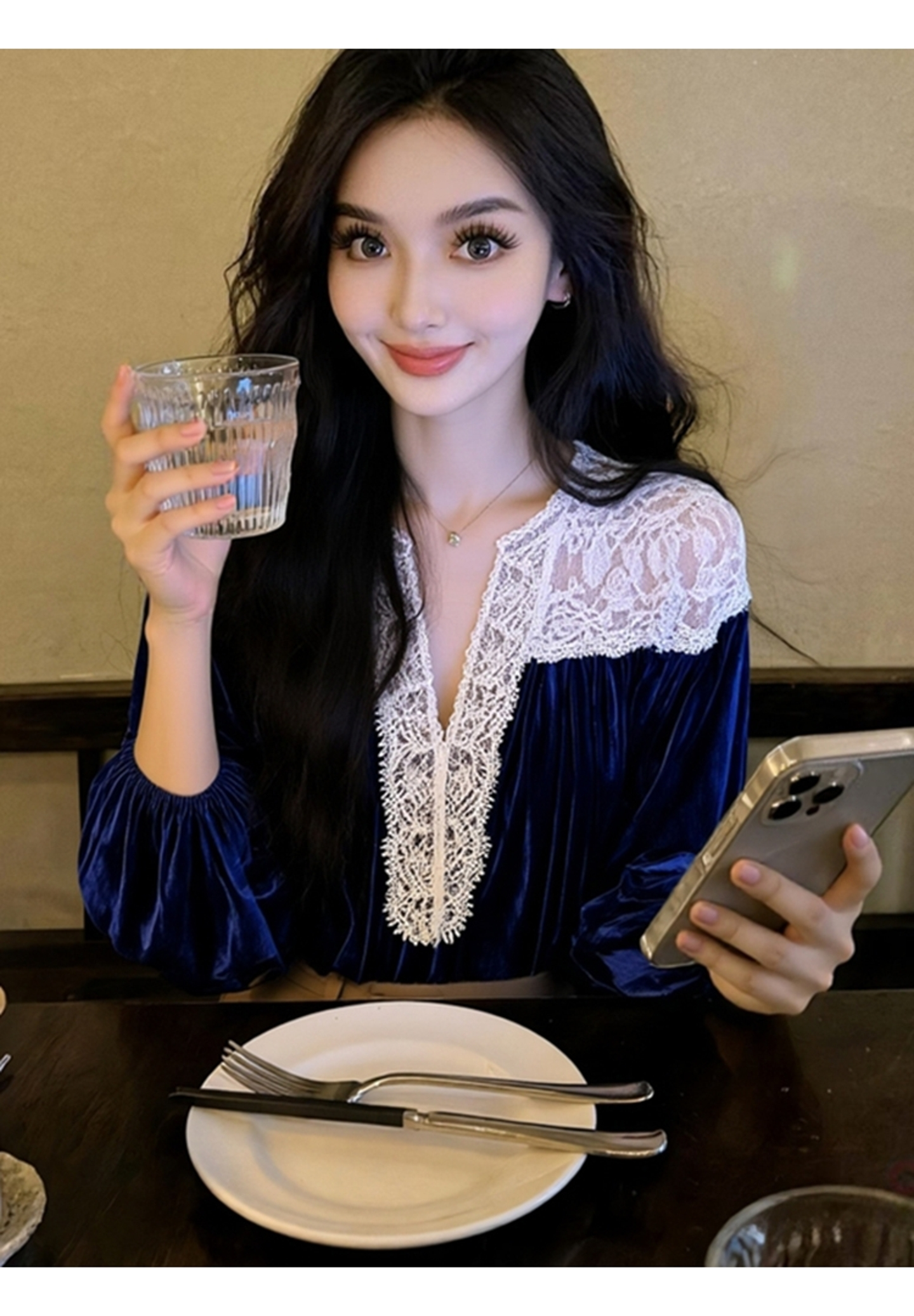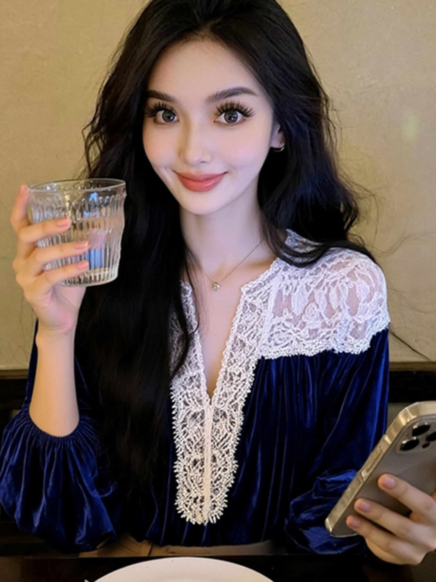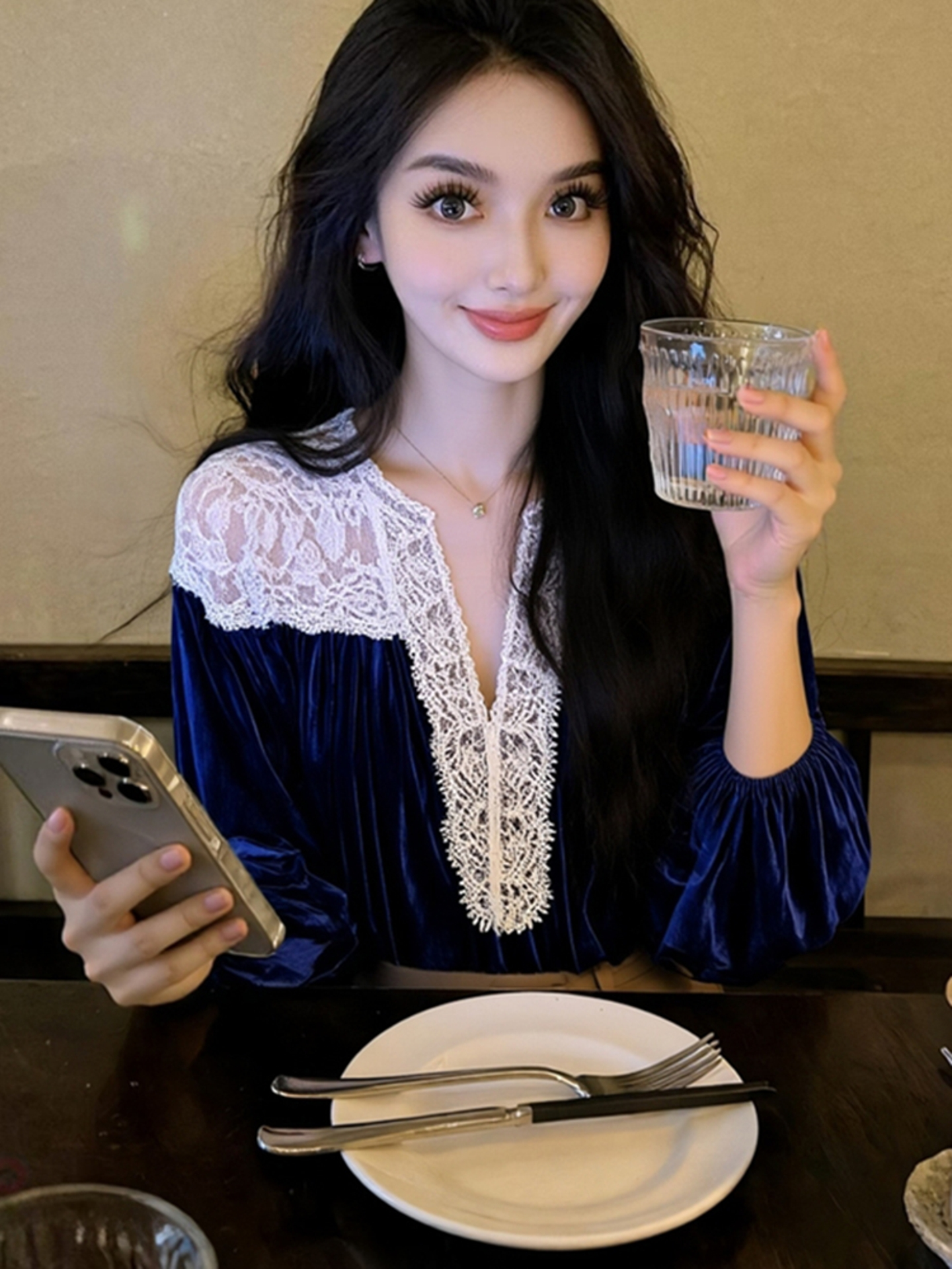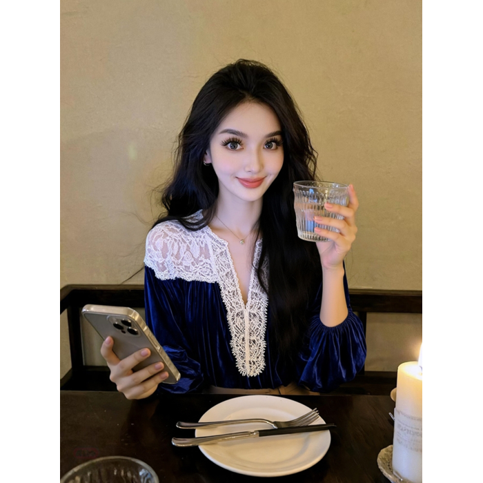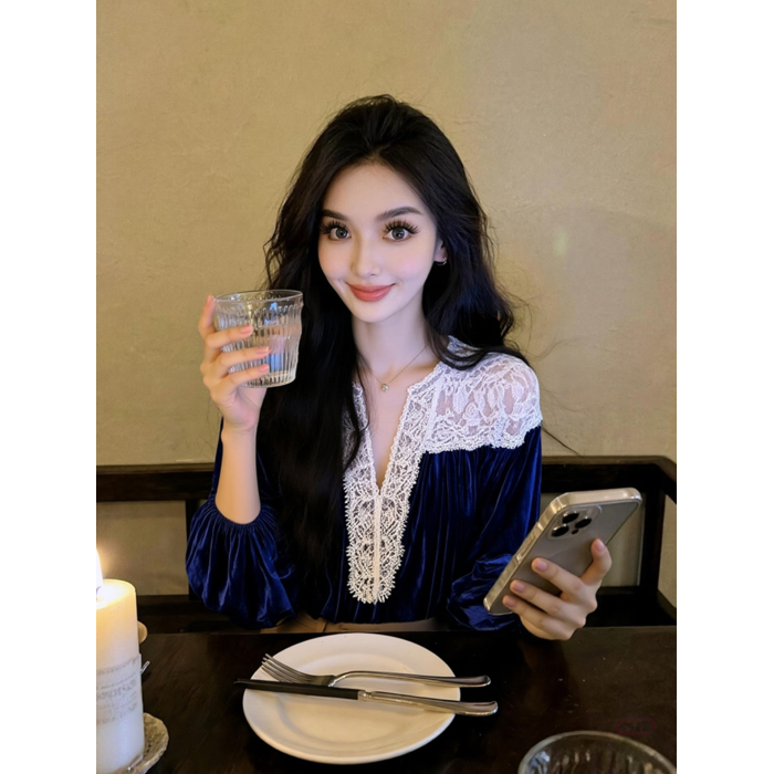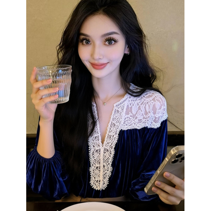 藍色蕾絲襯衫女款2025新款冬巨好看設計感氣質高級法式小資上衣春