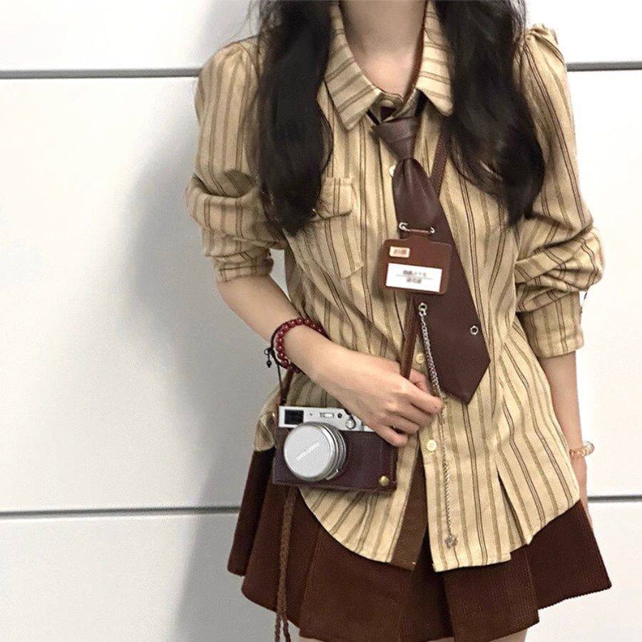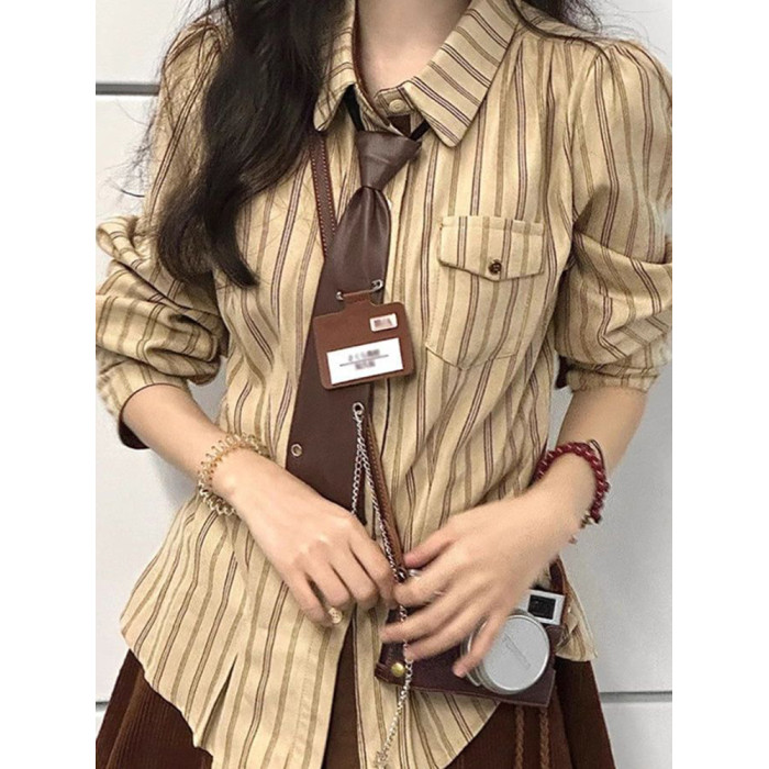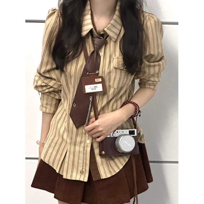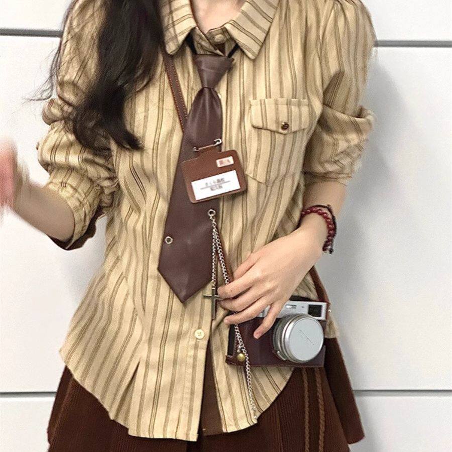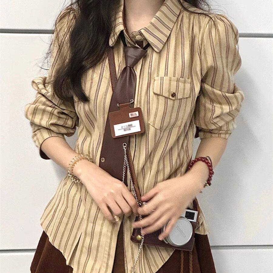 2025春秋復古學院風條紋設計感小衆襯衫長袖寬鬆新款韓版襯衣潮