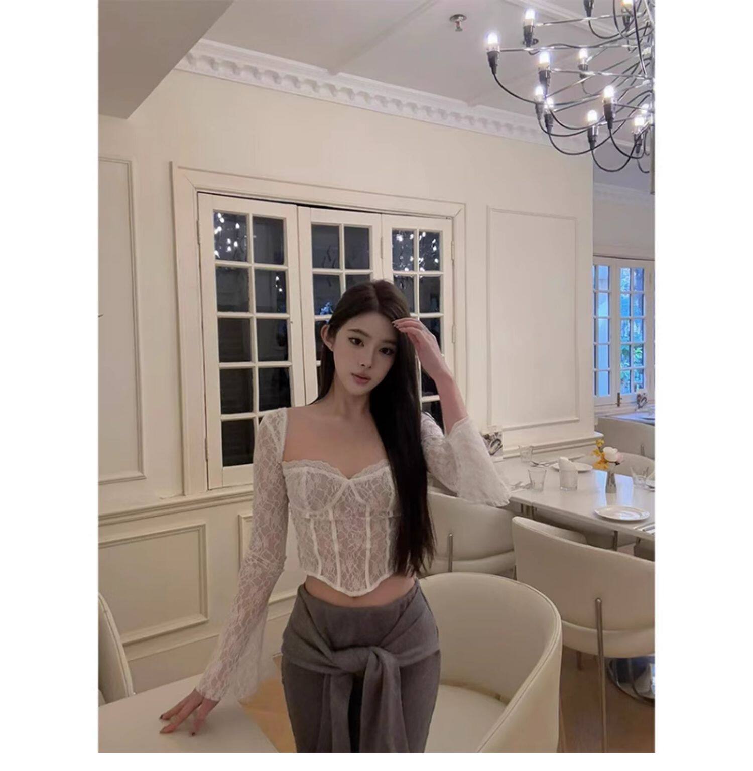 Turn up/陳腿兒 性感辣妹蕾絲魚骨線打底衫女喇叭袖顯瘦內搭胸衣
