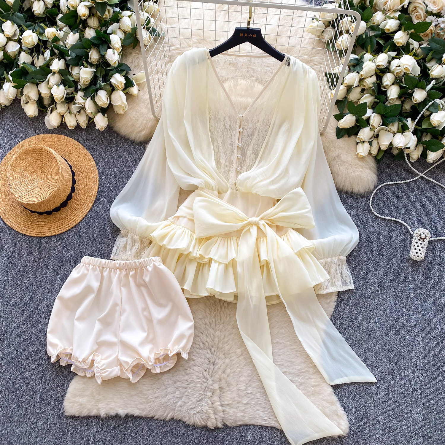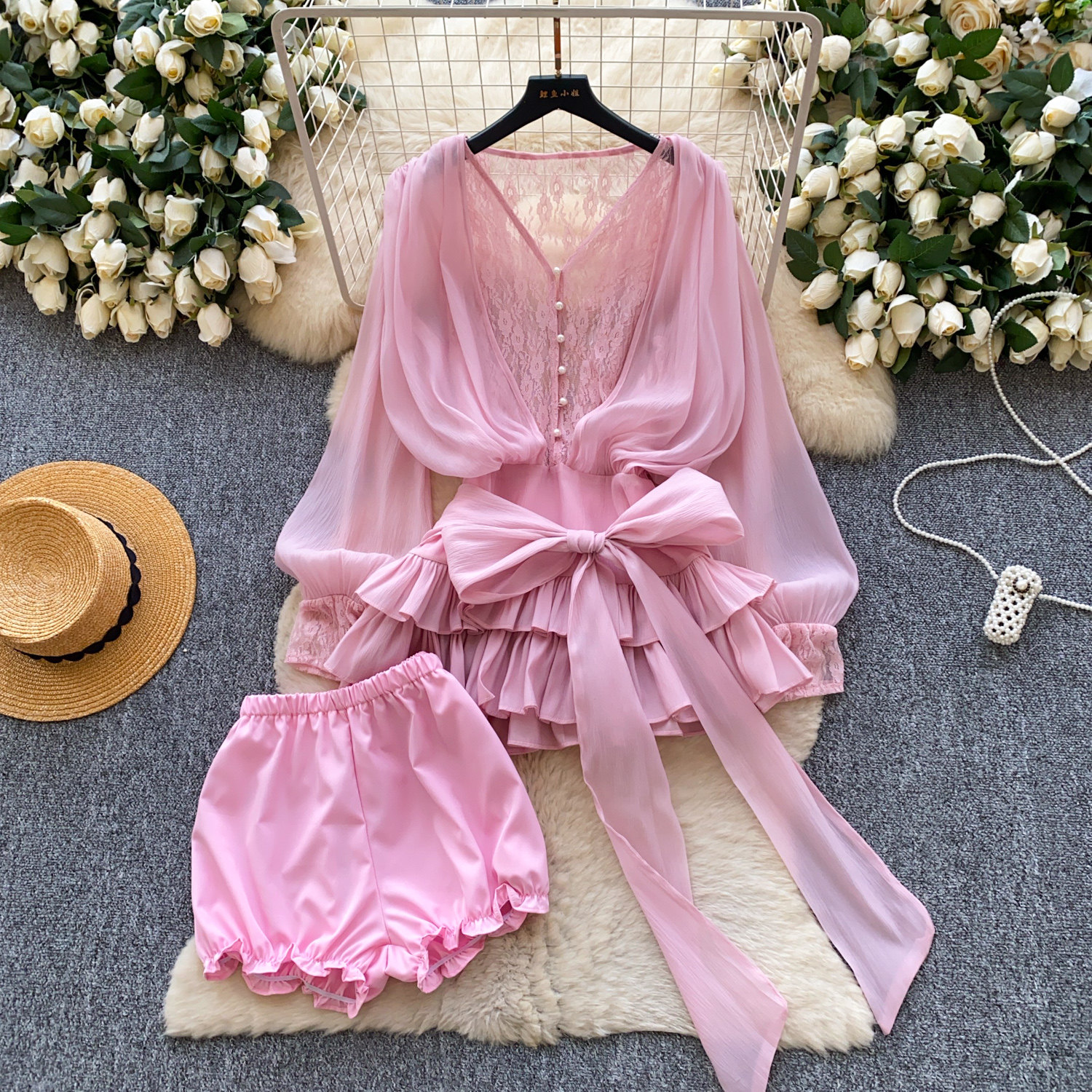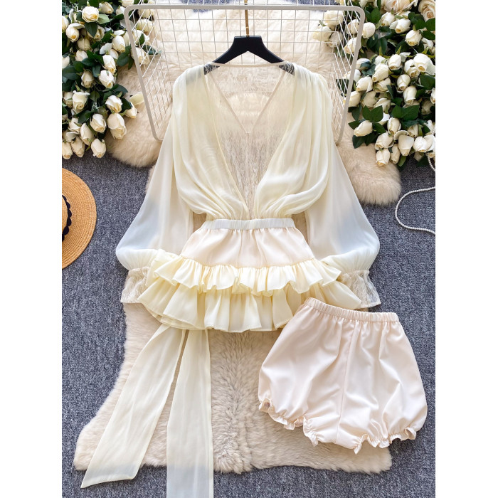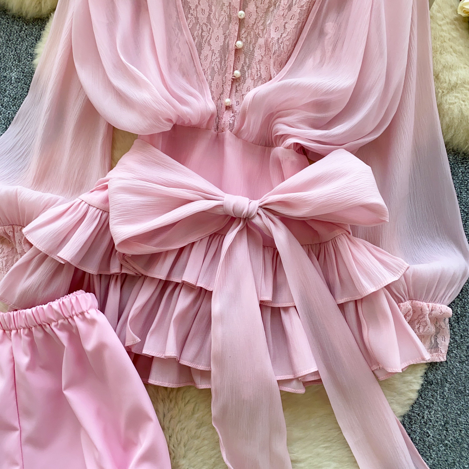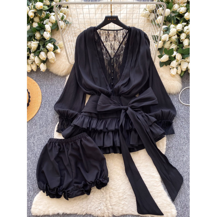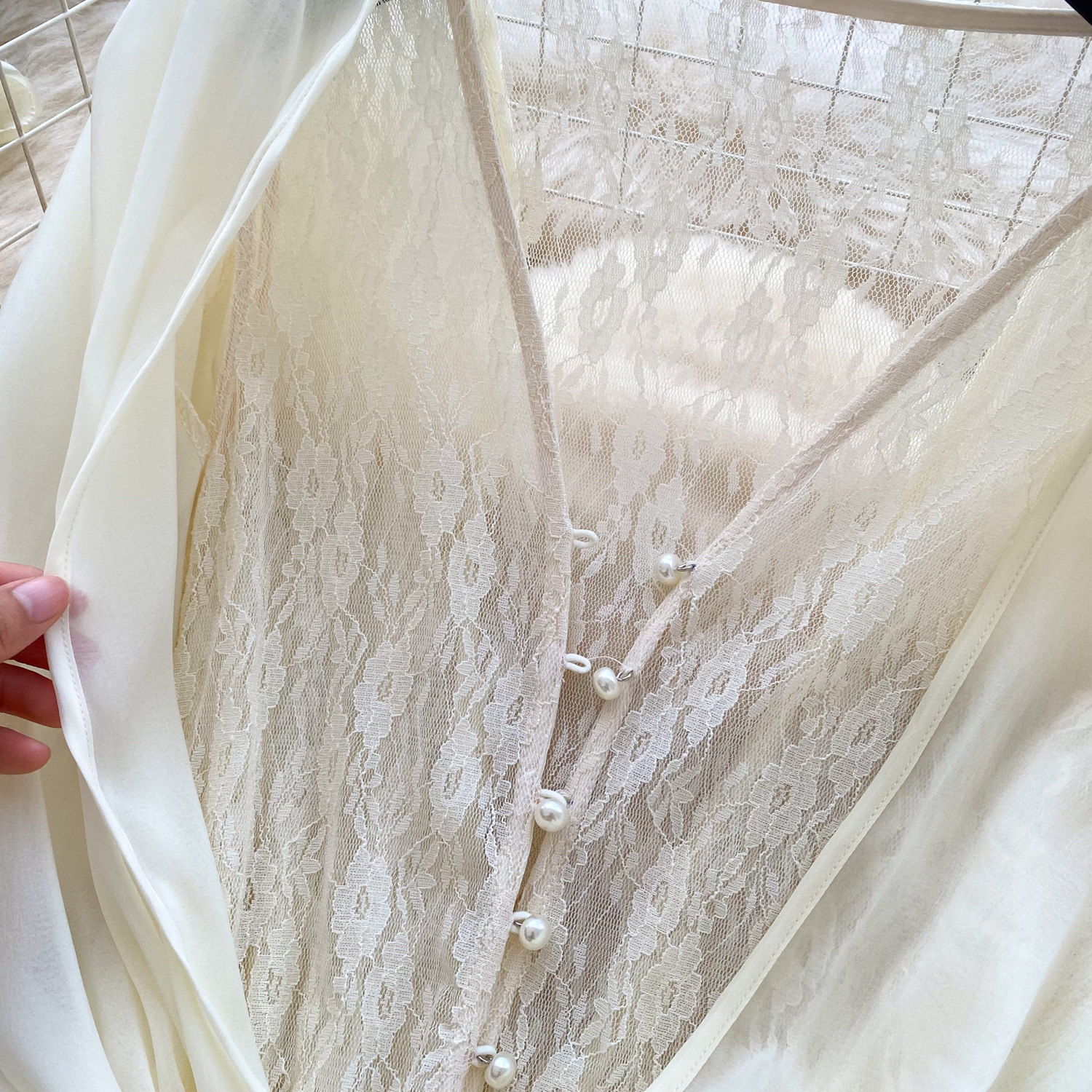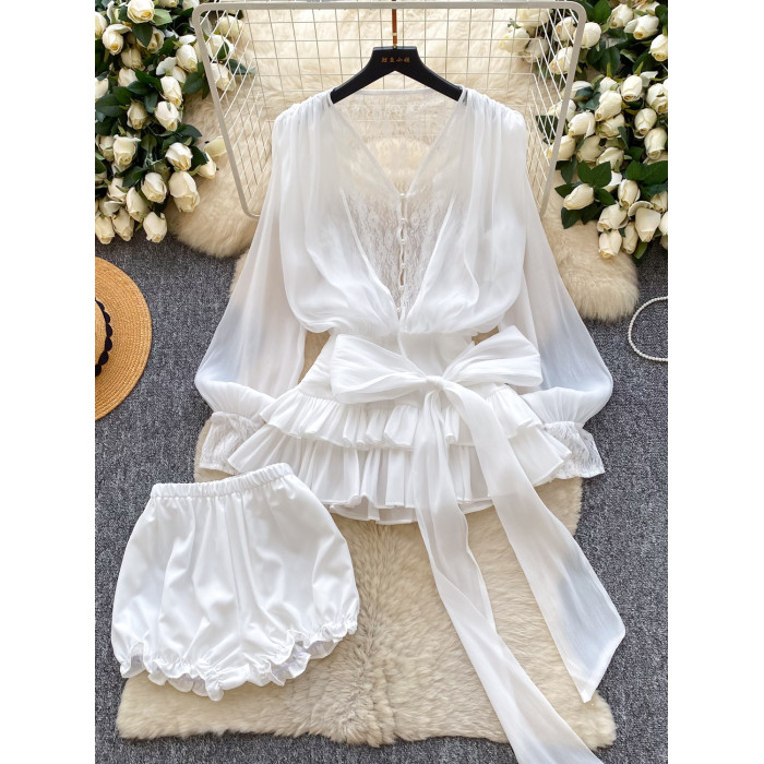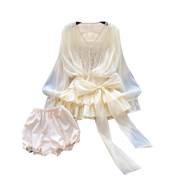 仙女氛圍感小衆蝴蝶結綁帶收腰蕾絲拼接長袖荷葉邊網紗連衣裙短褲